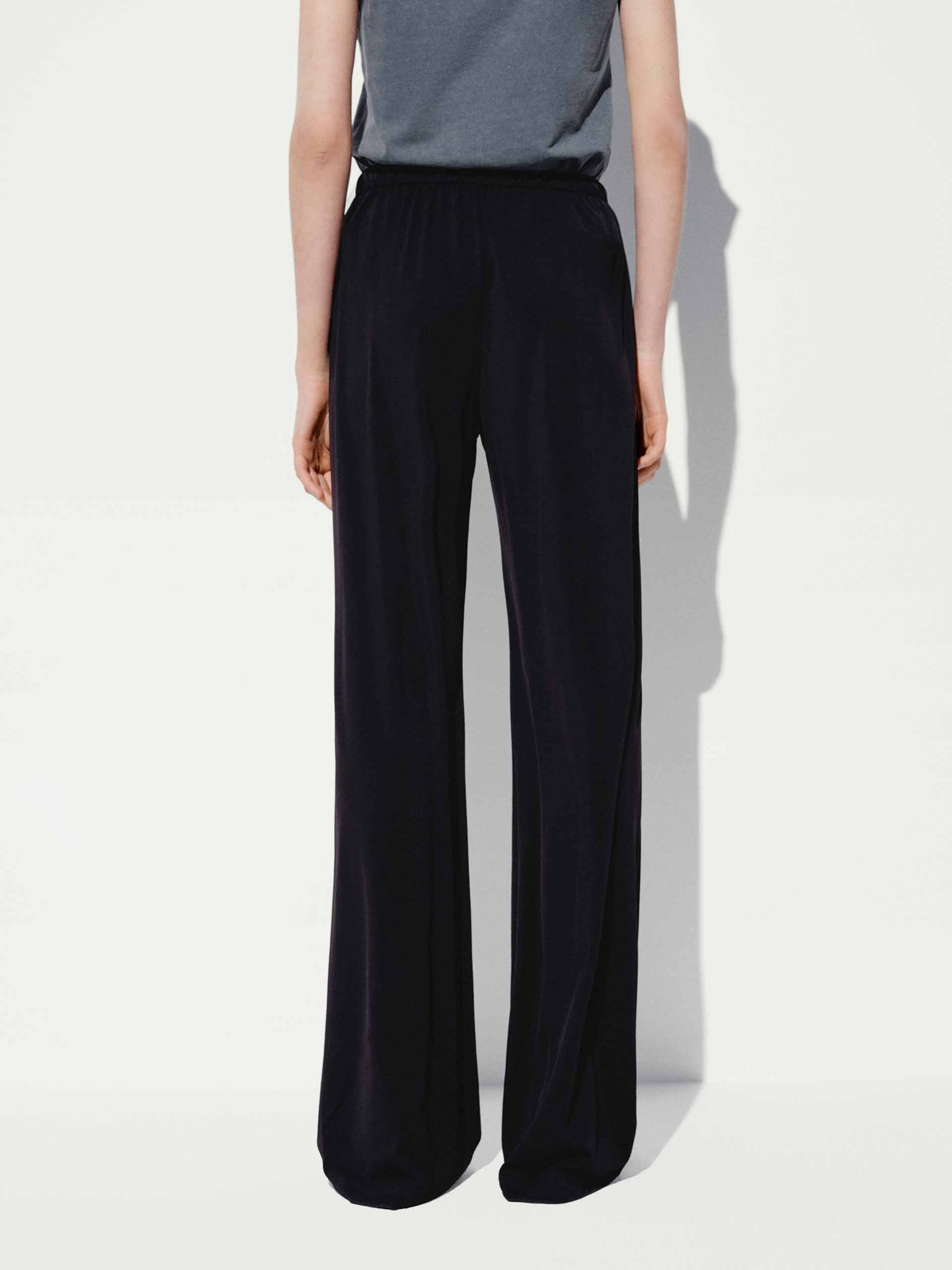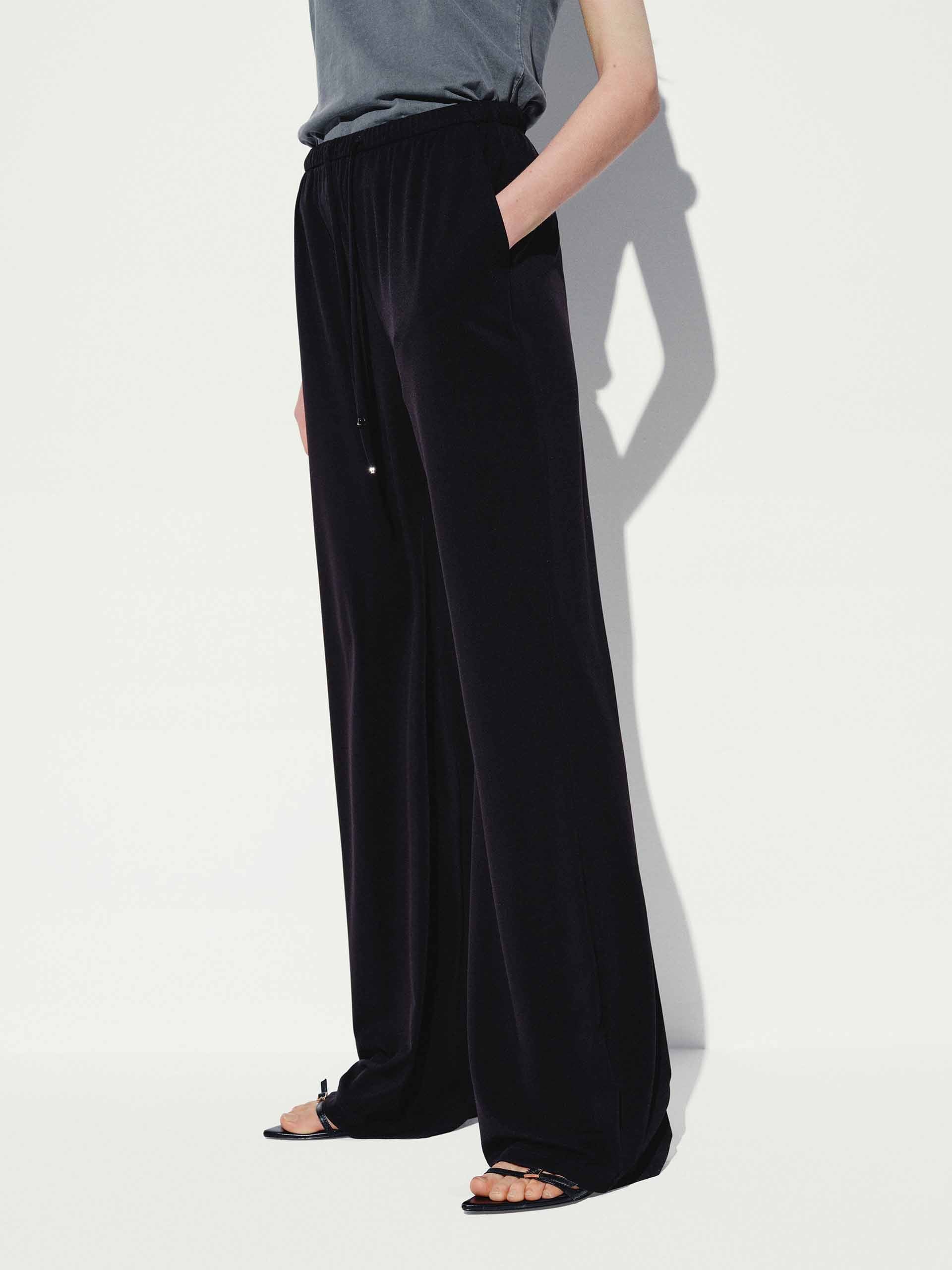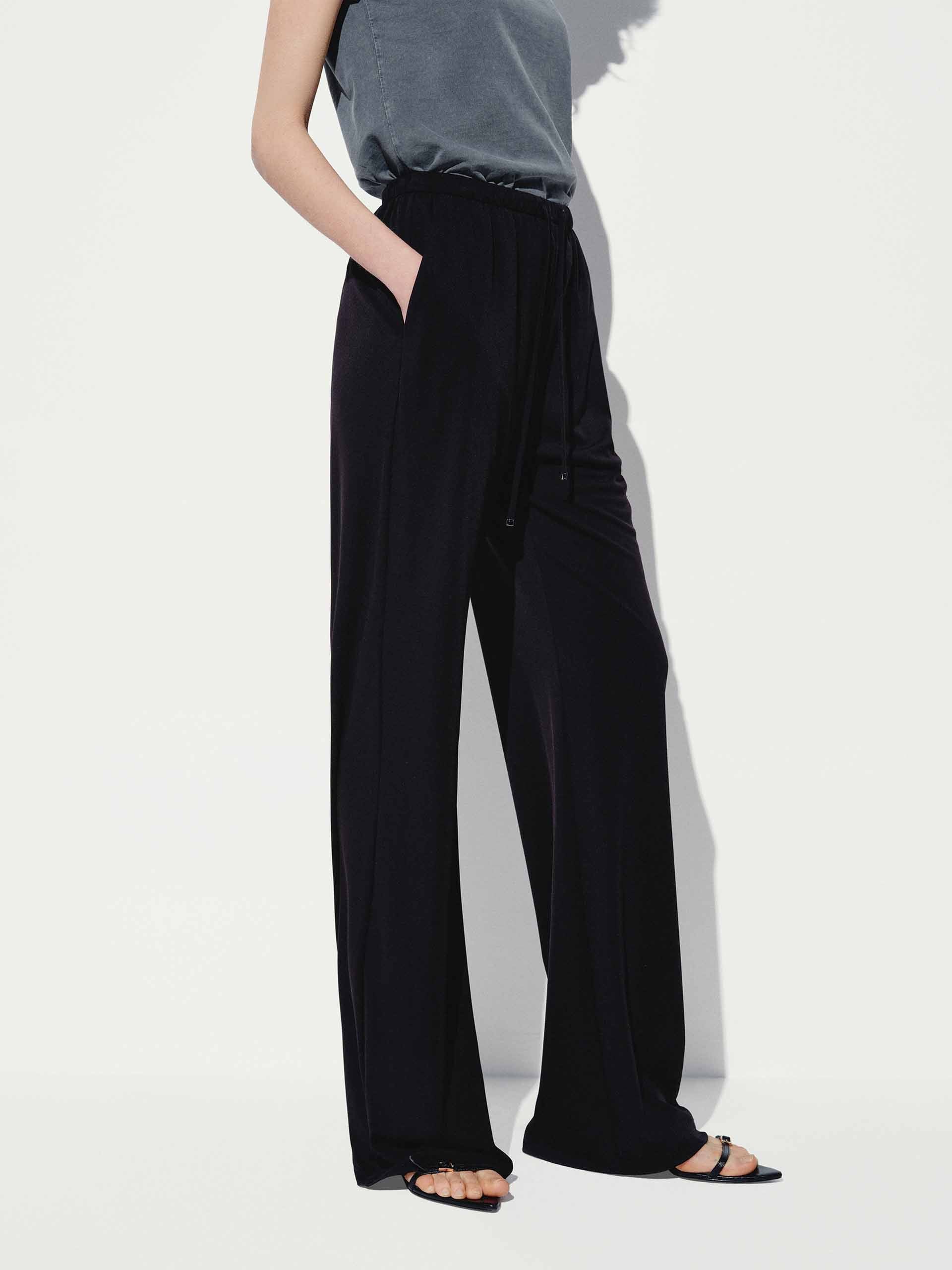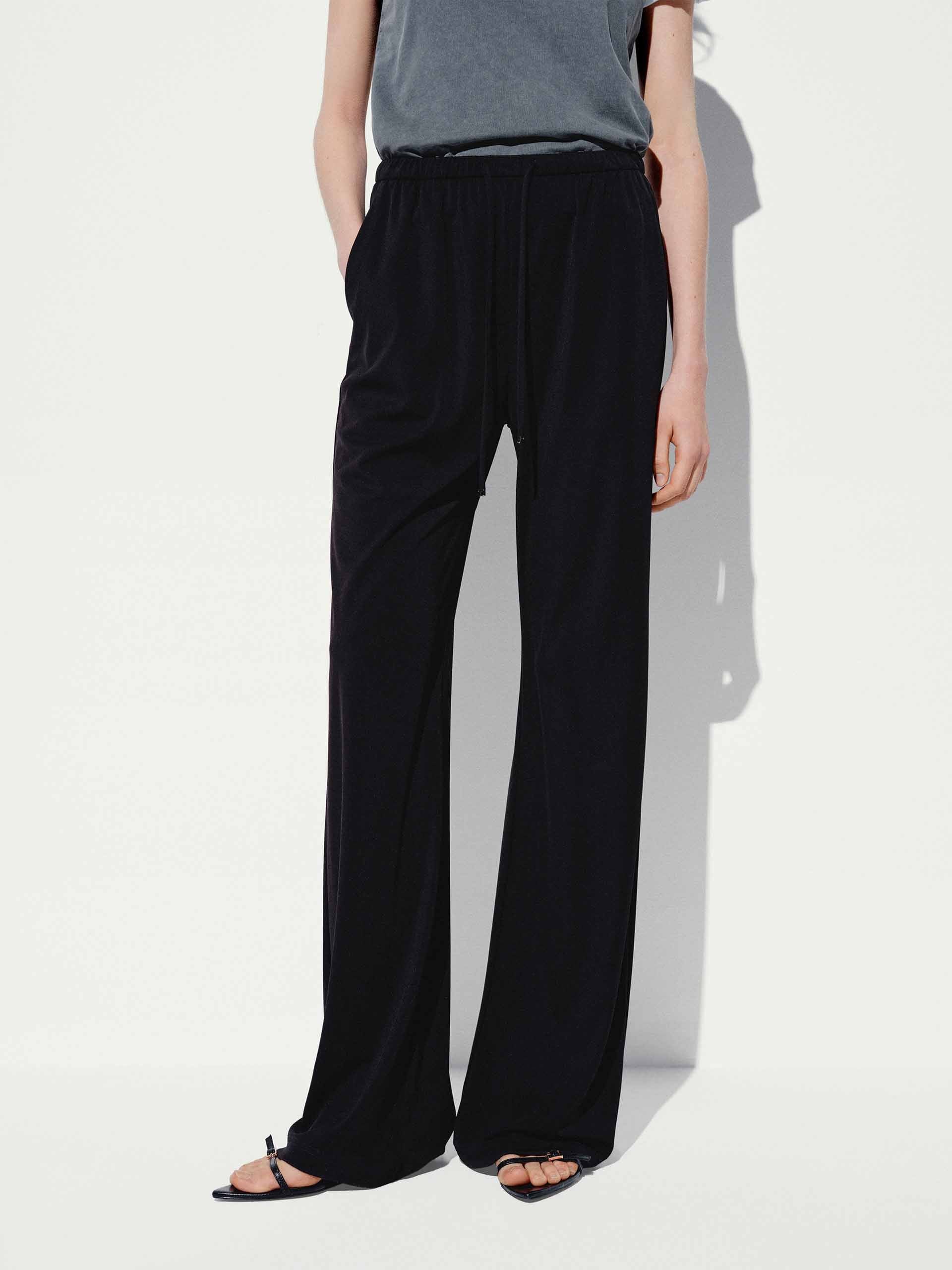 Channel effortless 70s vibes with these flared trousers, blending vintage inspiration with modern comfort. The elasticated waistband with an adjustable drawstring ensures a customized fit. Discreet side pockets that maintain clean lines while offering practical functionality.