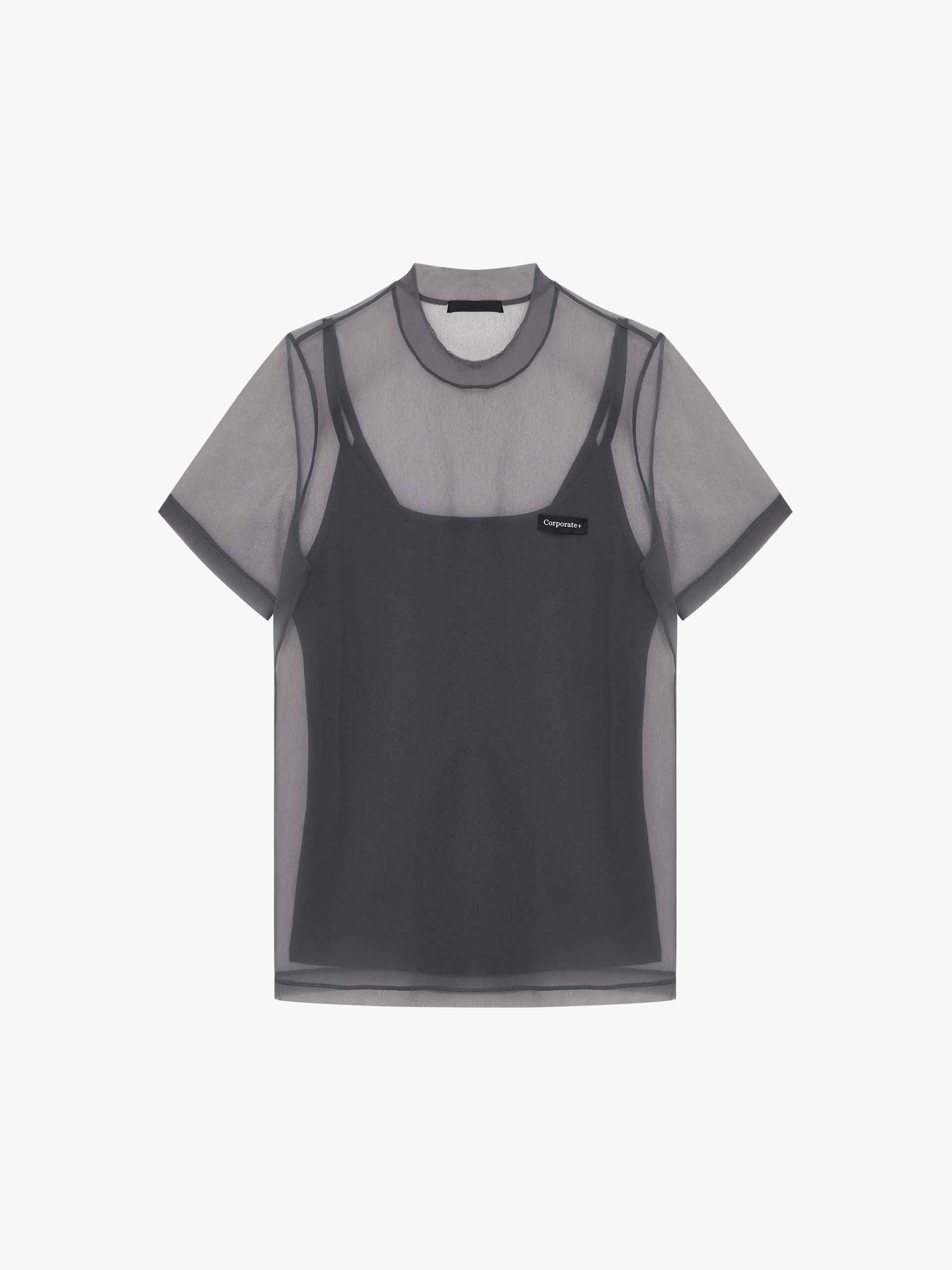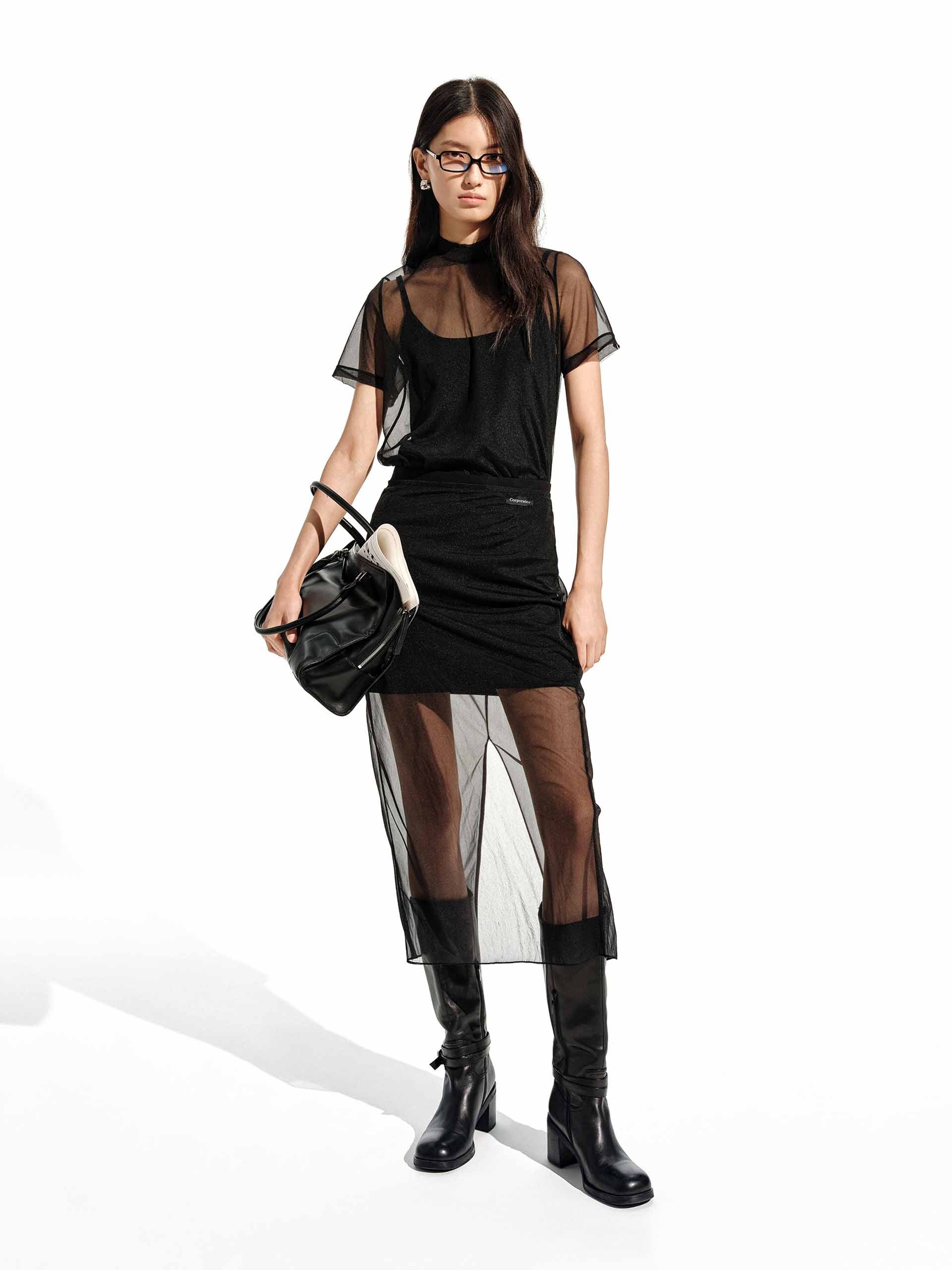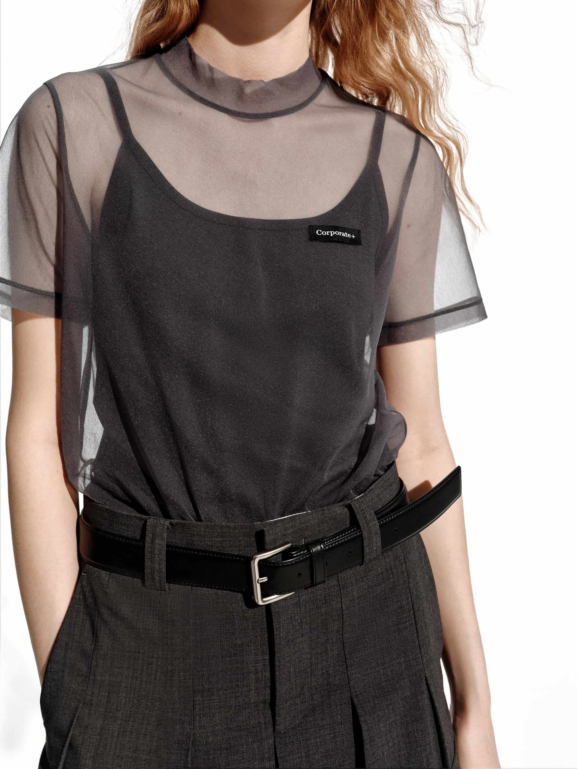 Enhanced with a shimmery mesh cover and sheer effect, this top offers a stylish and sleek finish. Complete the look with our coordinating mesh skirt.