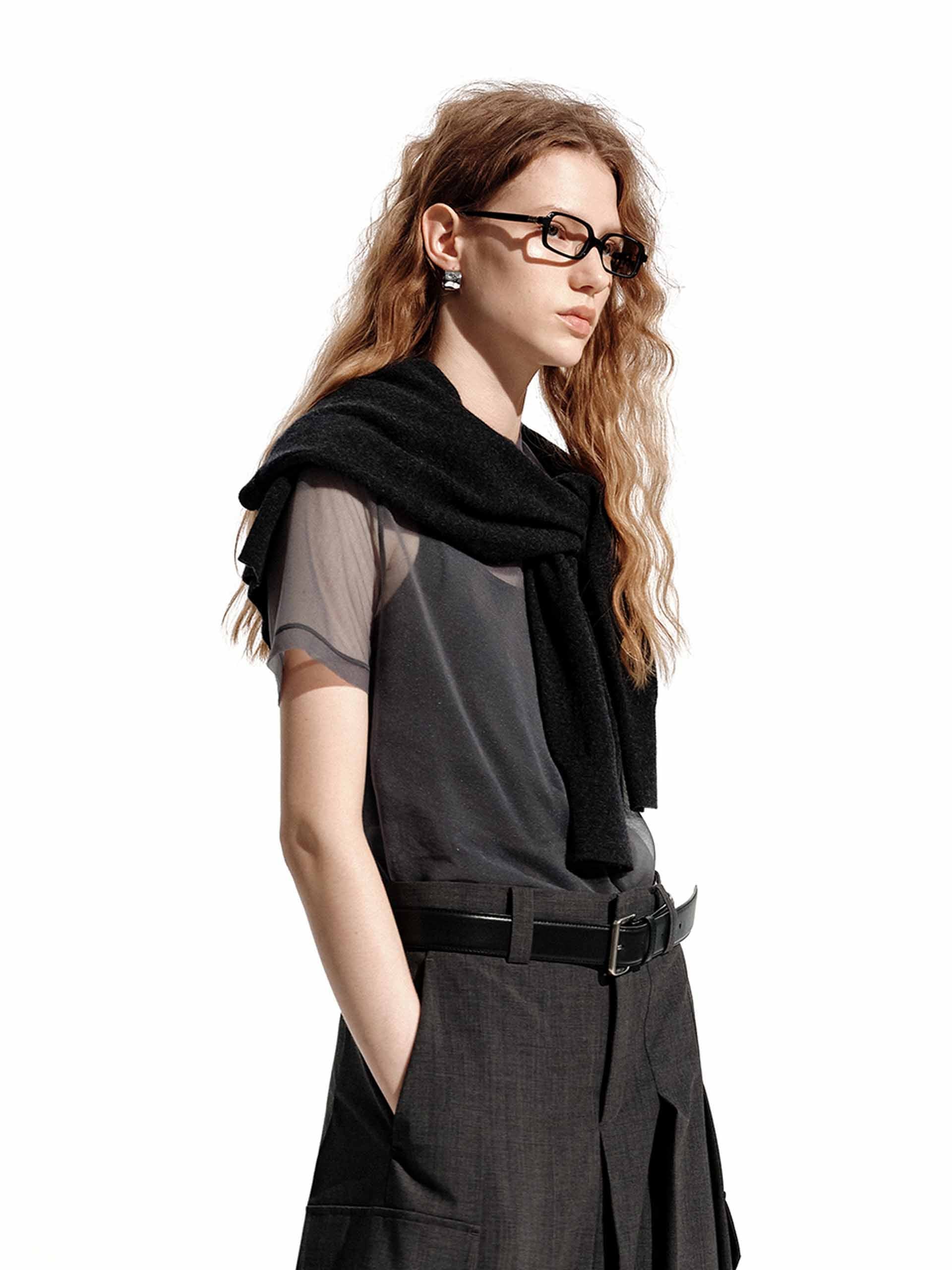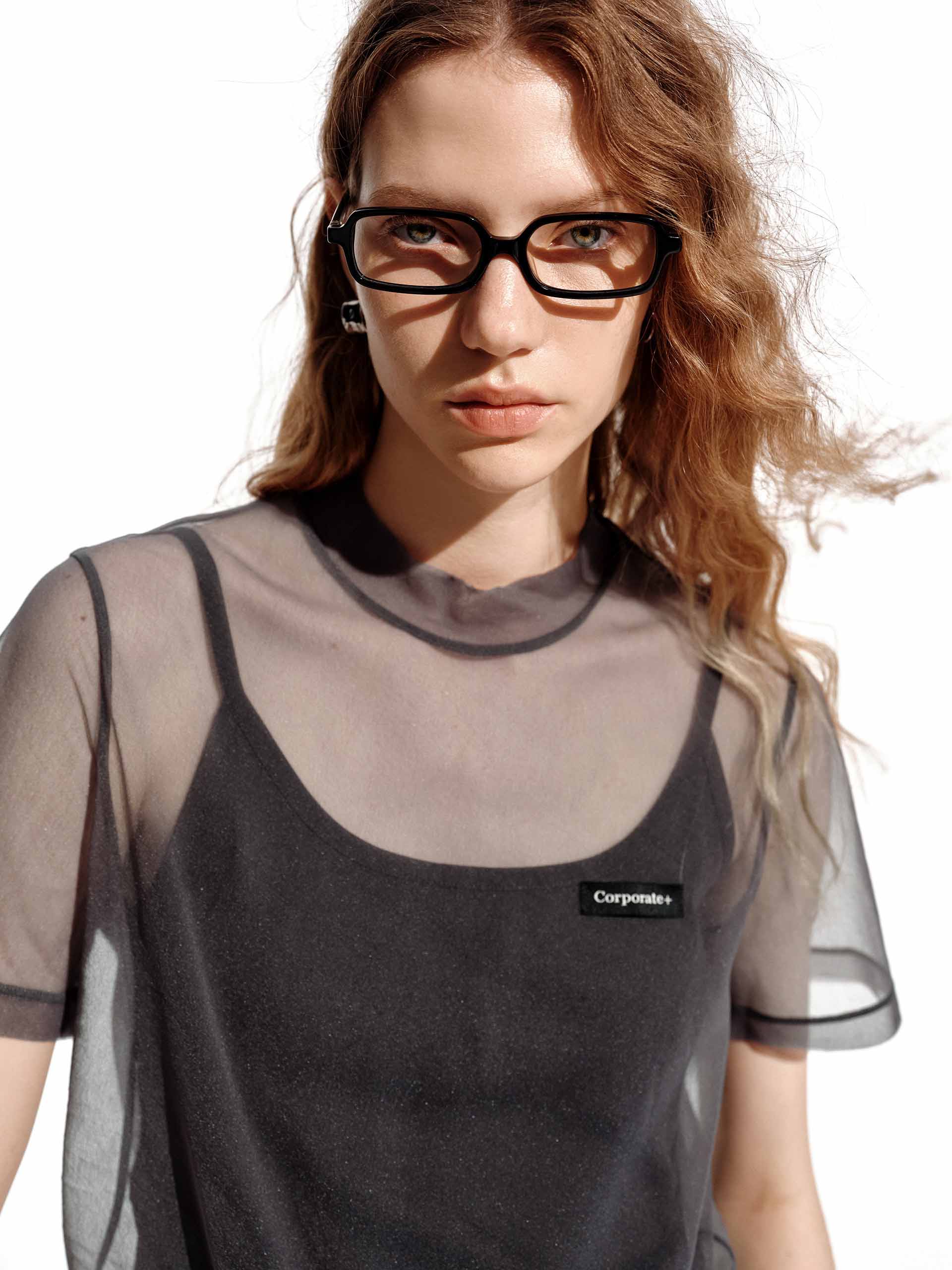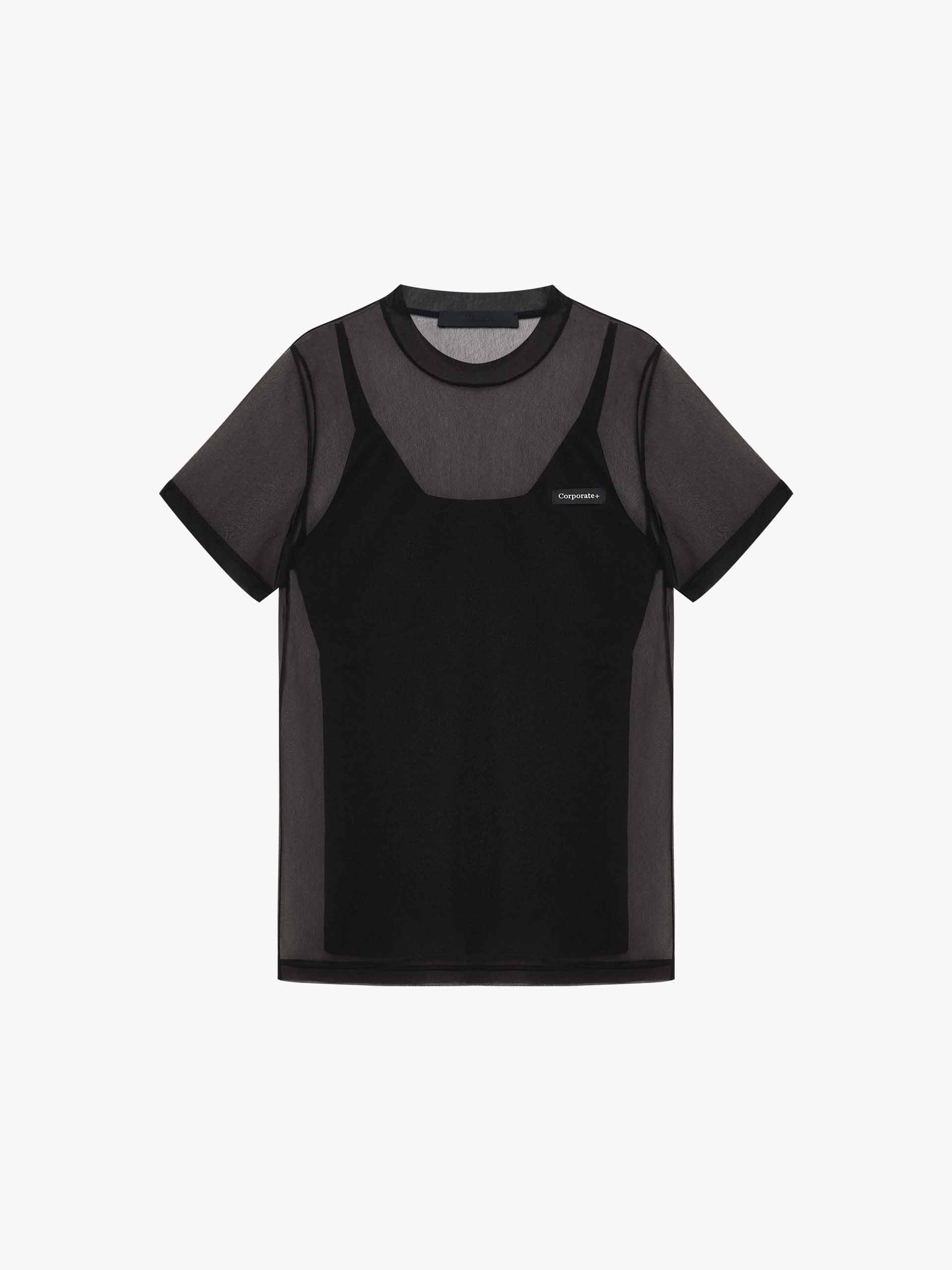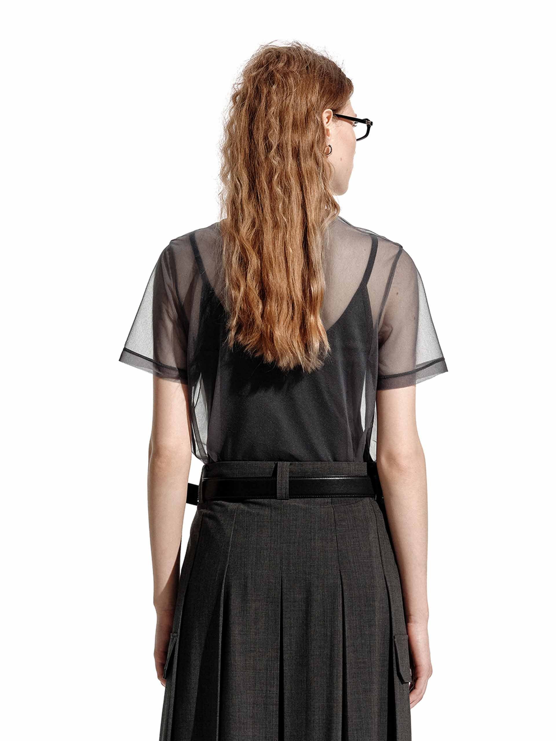 Enhanced with a shimmery mesh cover and sheer effect, this top offers a stylish and sleek finish. Complete the look with our coordinating mesh skirt.