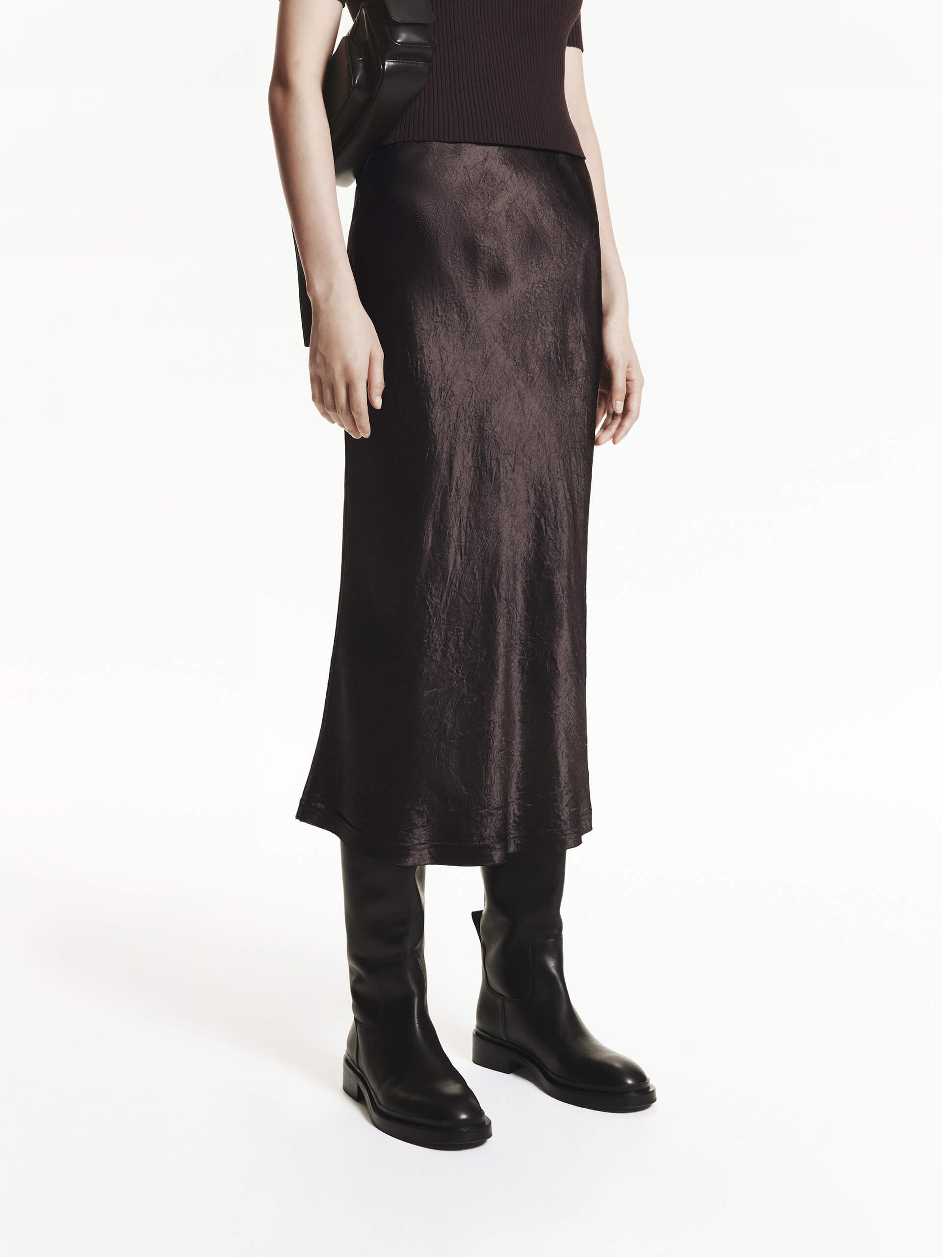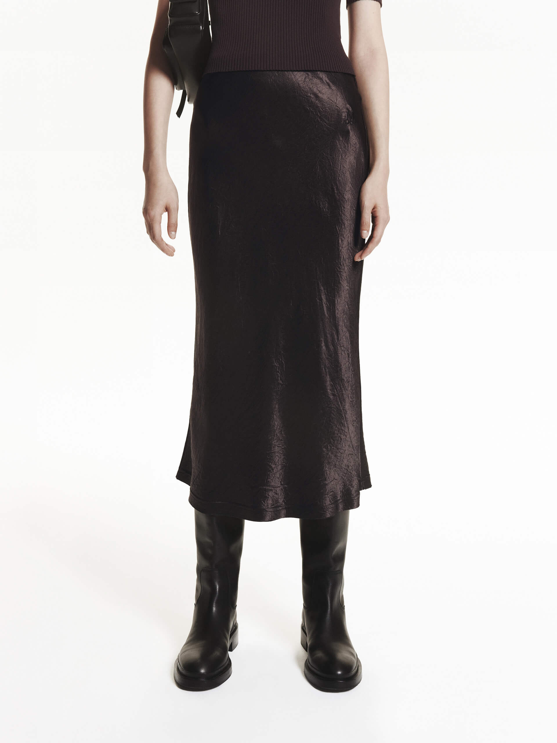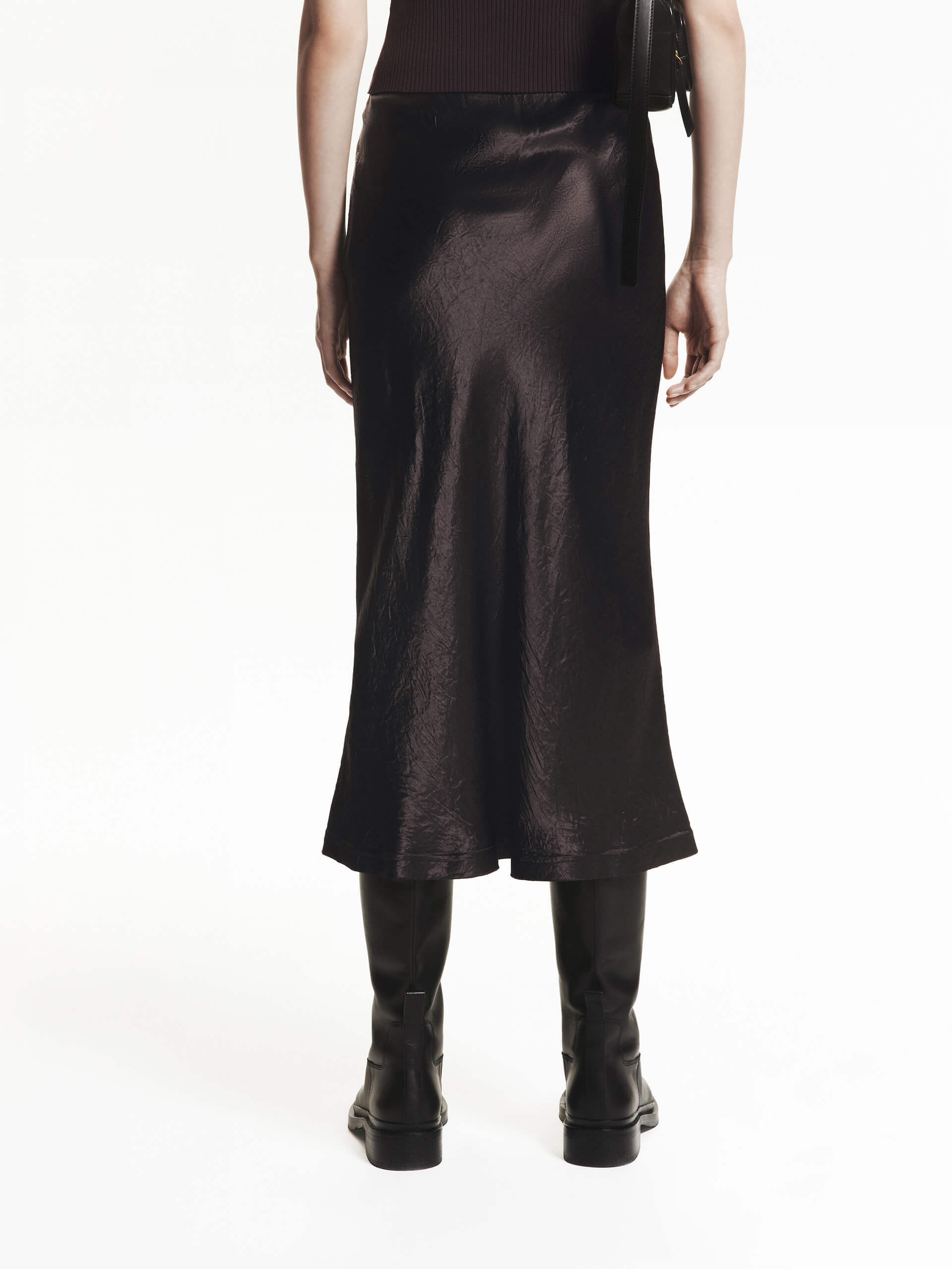 This draped midi skirt is crafted from lustrous satin that's intentionally crinkled for subtle variation in texture and designed with a fitted waist, enhanced by the fluid movement of the slightly fishtail hem.