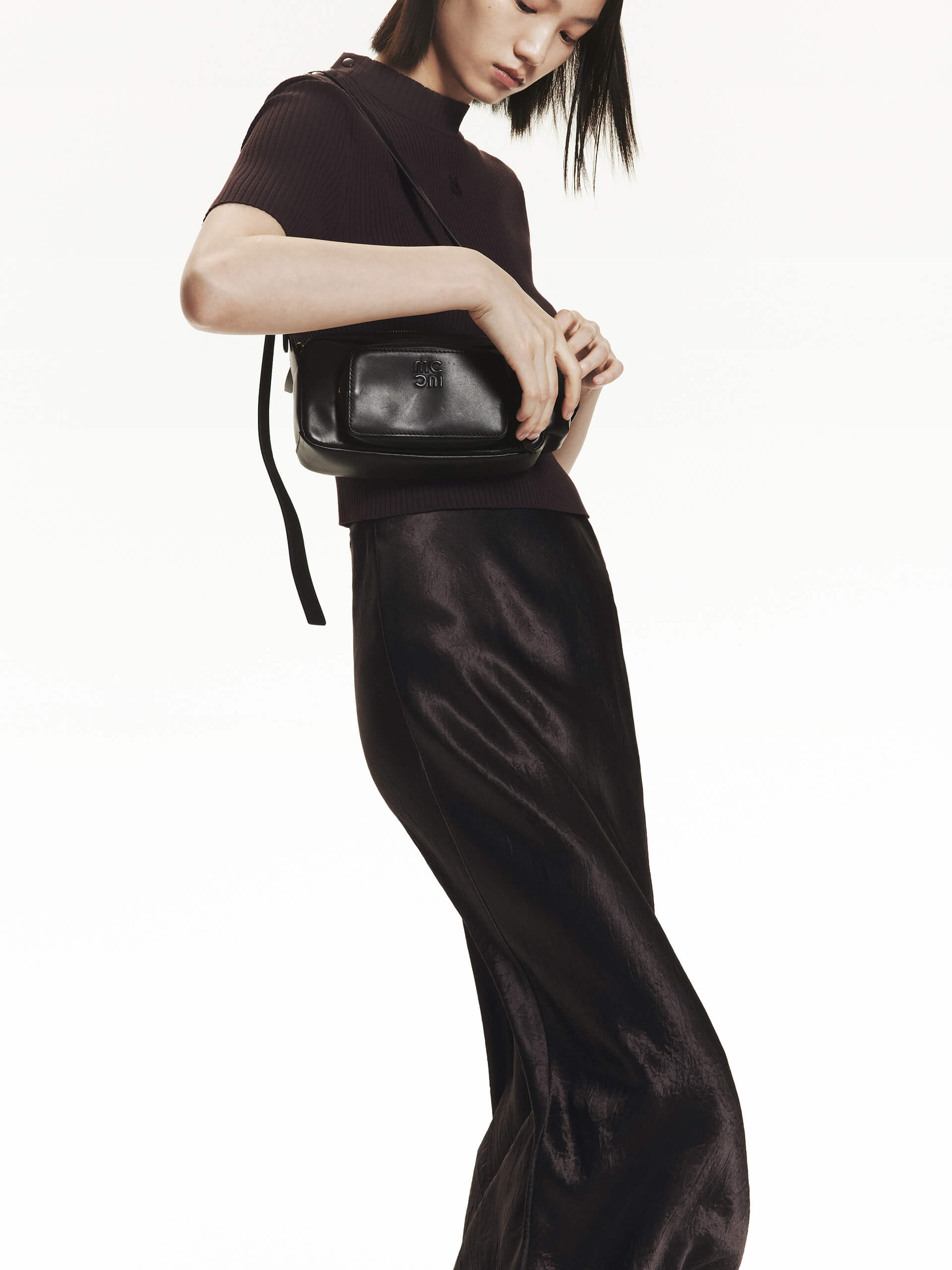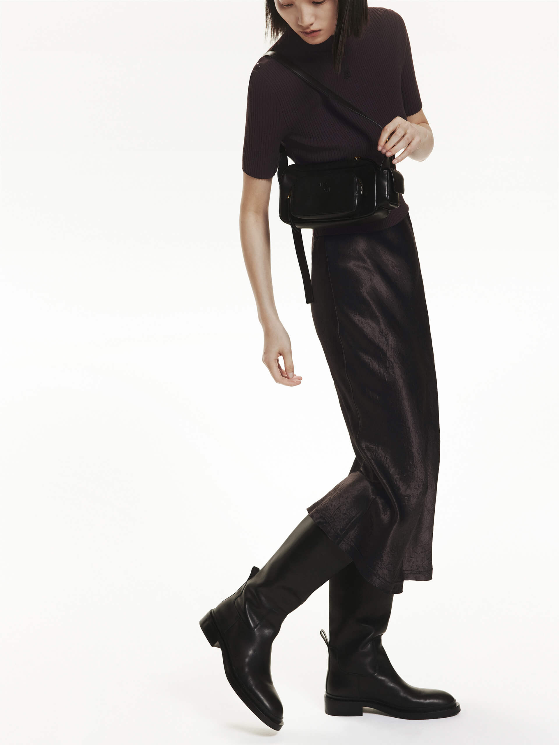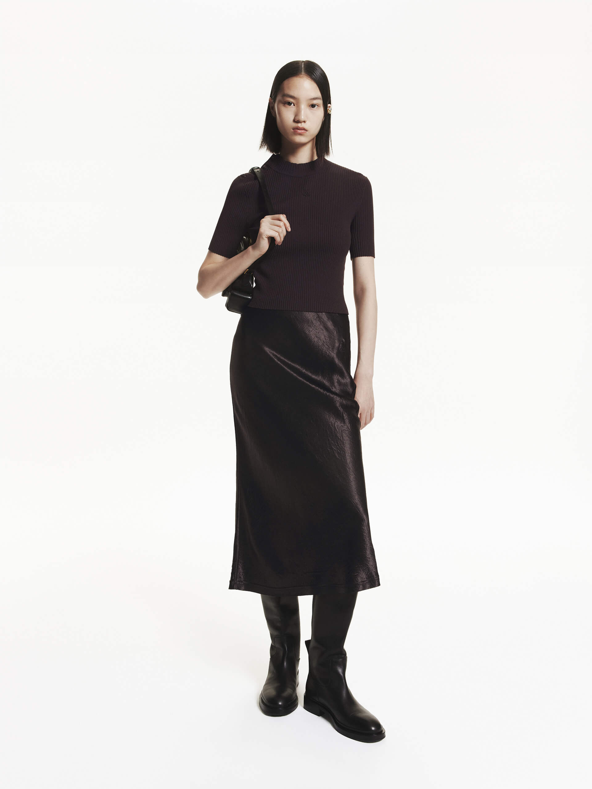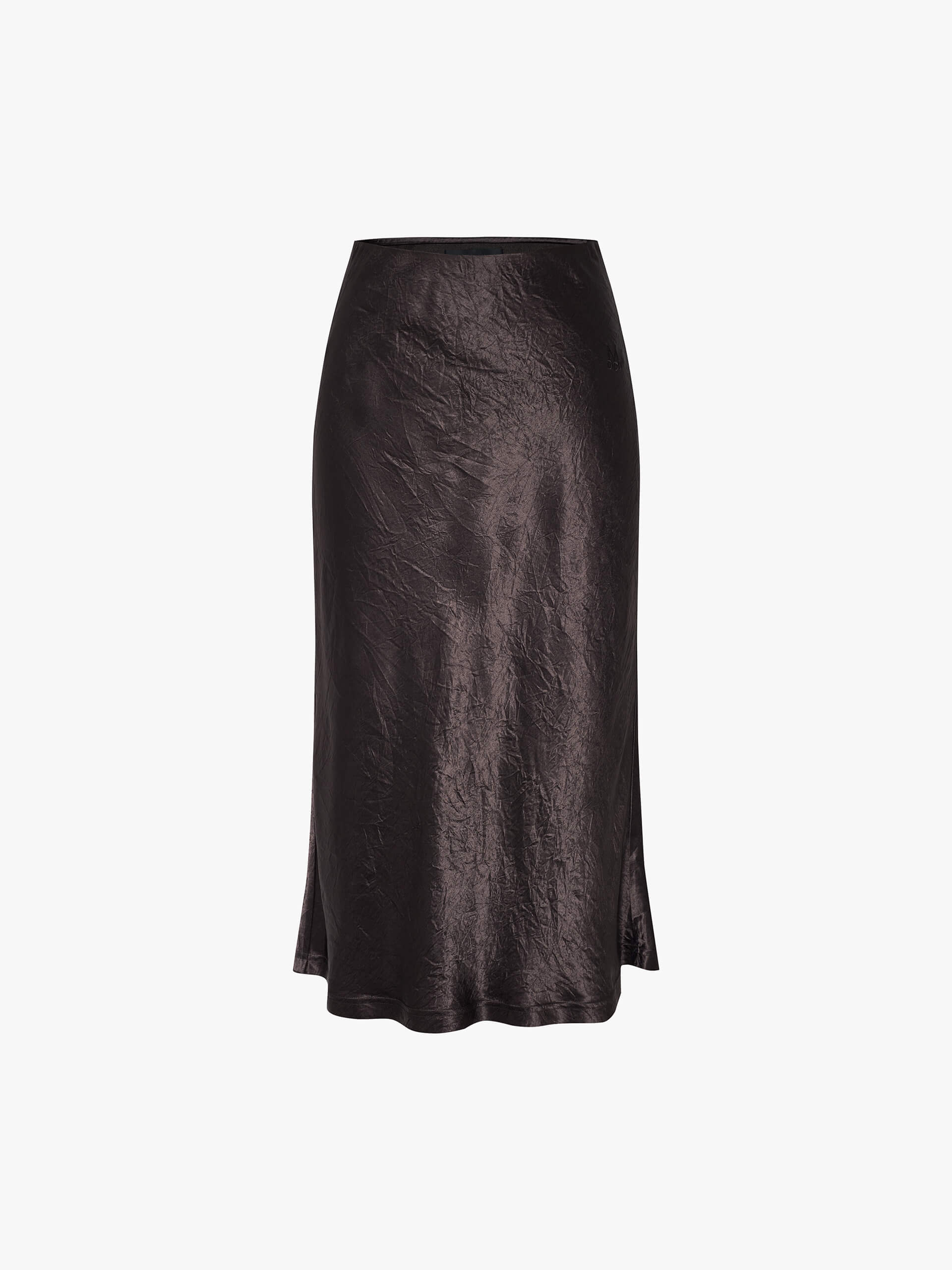 This draped midi skirt is crafted from lustrous satin that's intentionally crinkled for subtle variation in texture and designed with a fitted waist, enhanced by the fluid movement of the slightly fishtail hem.