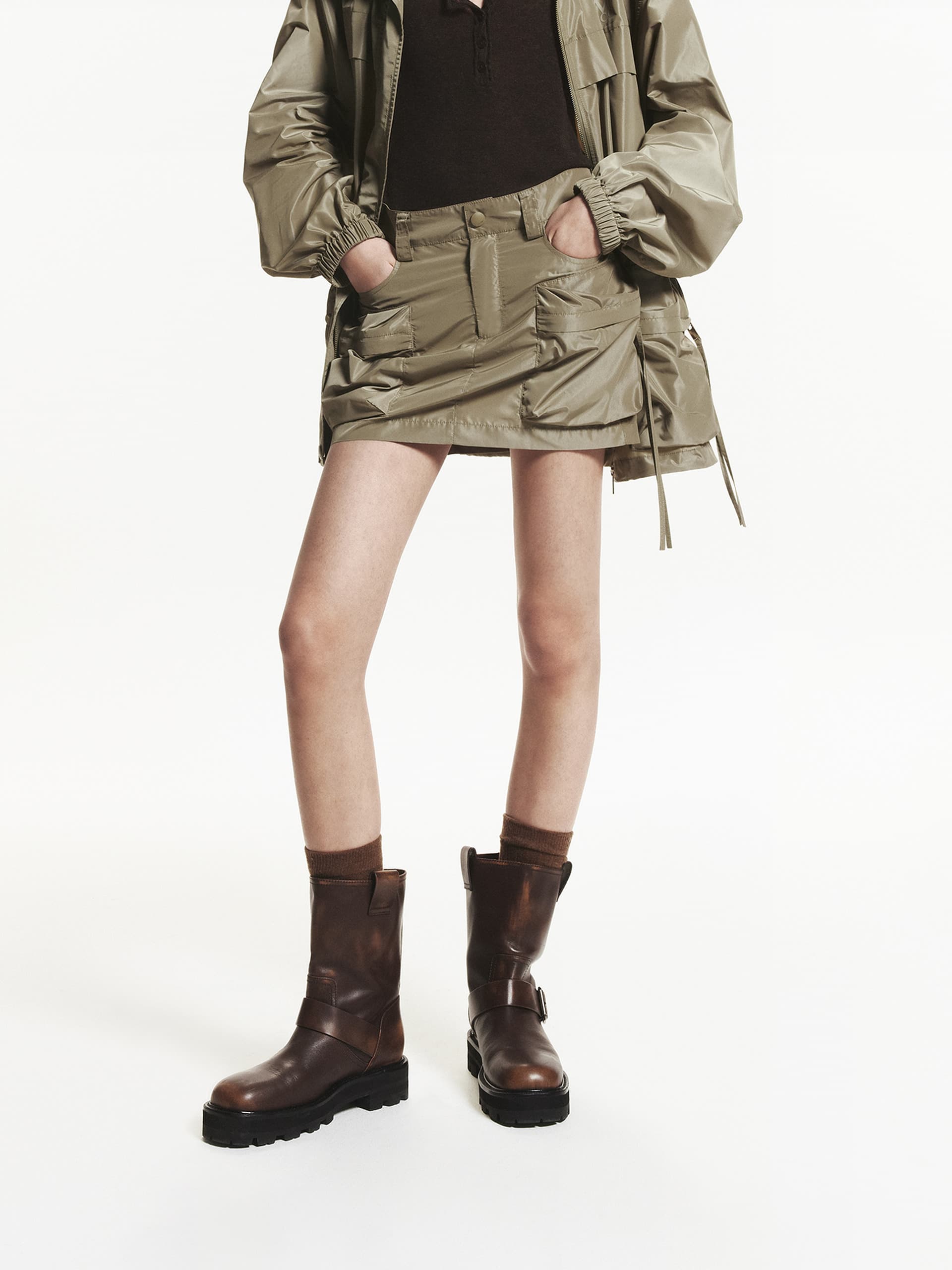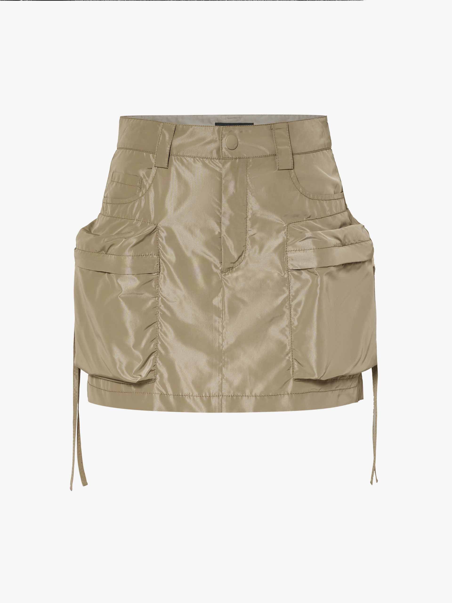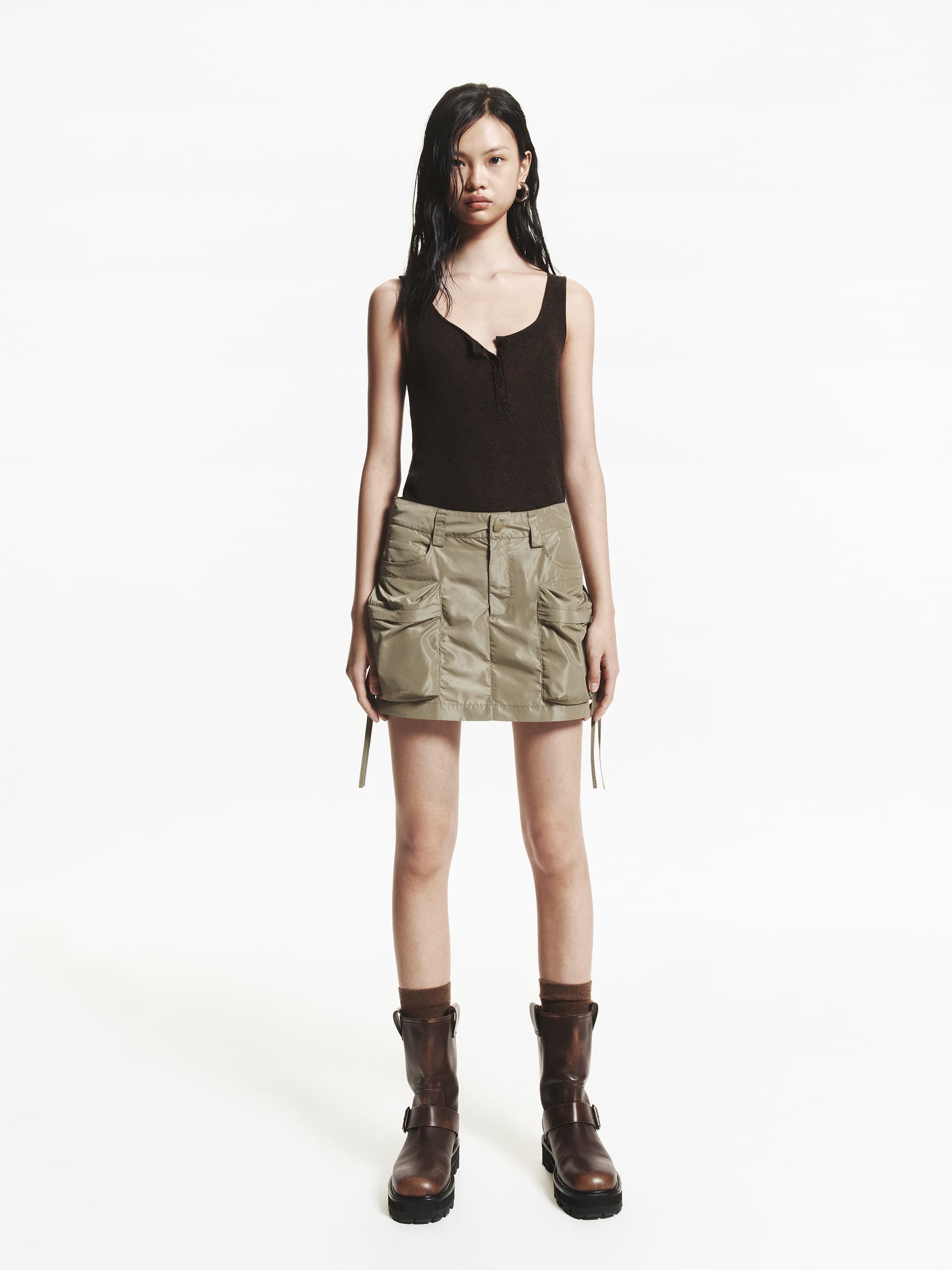 This mini skirt features a cargo pocket design with a drawstring. The button and zip closure ensure a secure fit, and the inner shorts provide comfort and coverage that offers style and practicality.