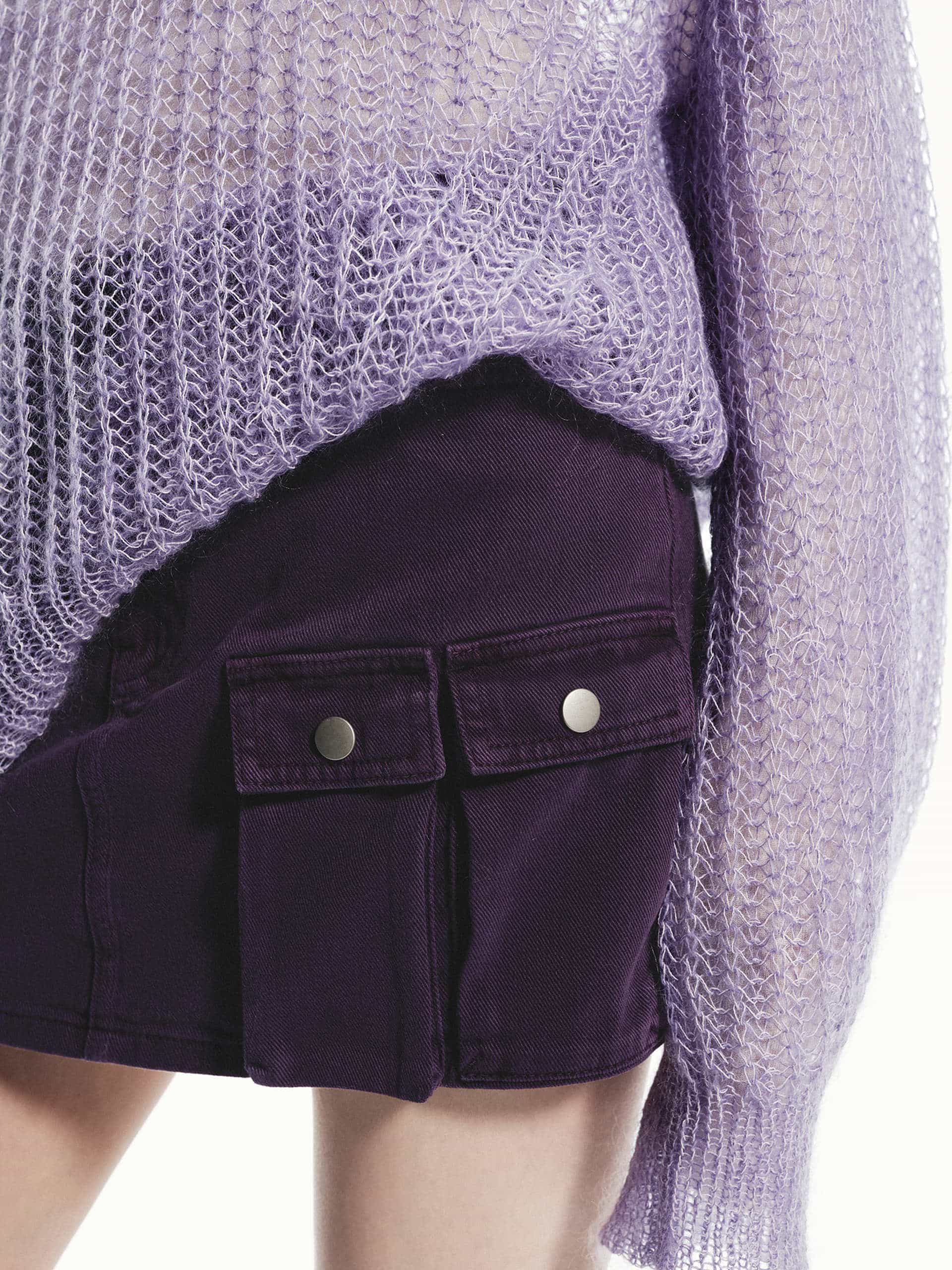Crafted in a bold purple hue and premium cotton, these shorts are the perfect blend of comfort and durability. Its mini skirt cut and included belt add a touch of femininity, while the practical cargo pocket design provides functionality.