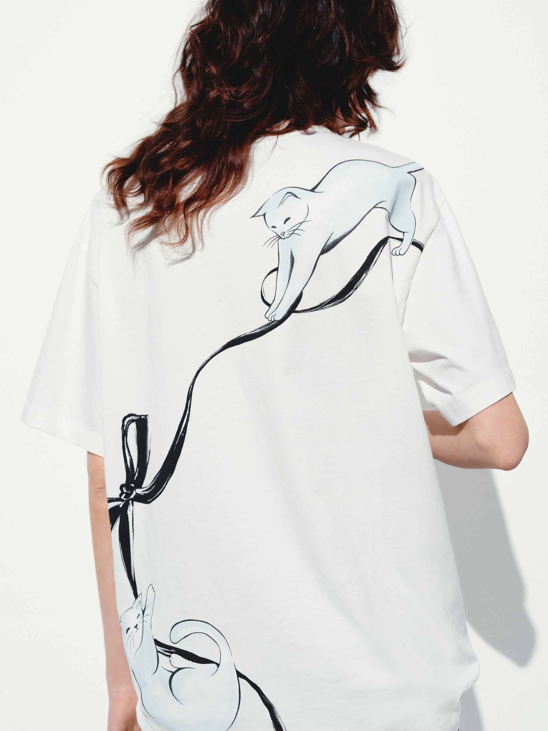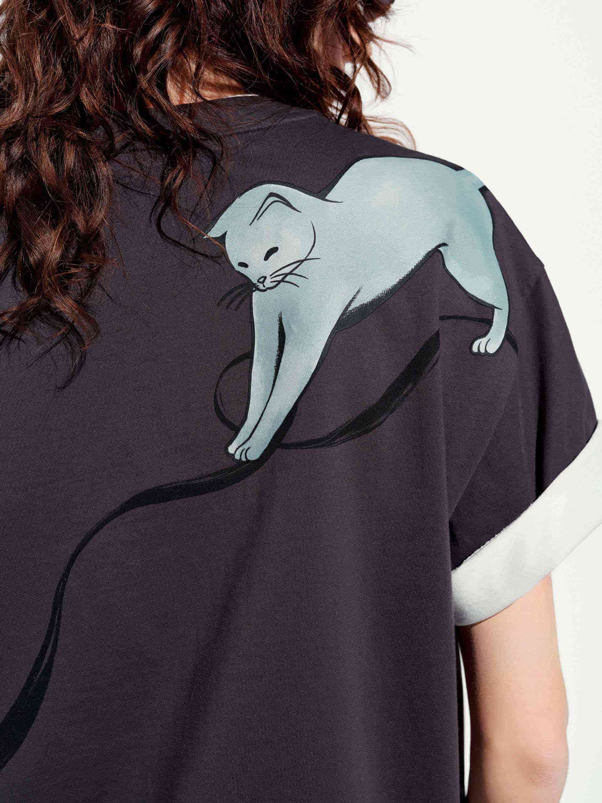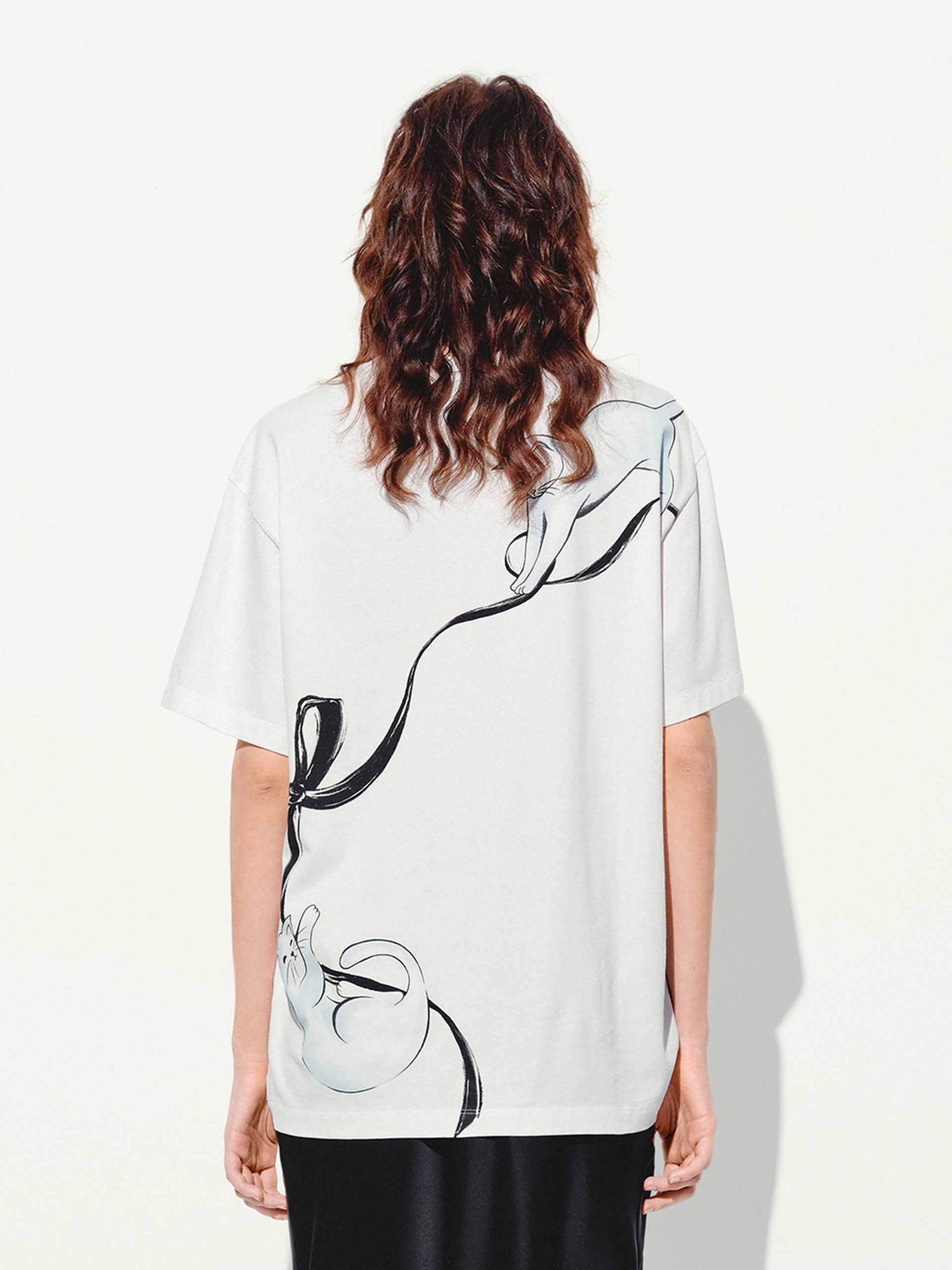Unleash your fun side with our t-shirt, featuring a bold feline motif printed across the back for maximum impact. The relaxed fit and dropped shoulders create an effortlessly cool silhouette, while the soft round neck keeps comfort at the forefront. Crafted for ultimate wearability, this tee's breathable cotton fabric makes it ideal for all-day adventures.