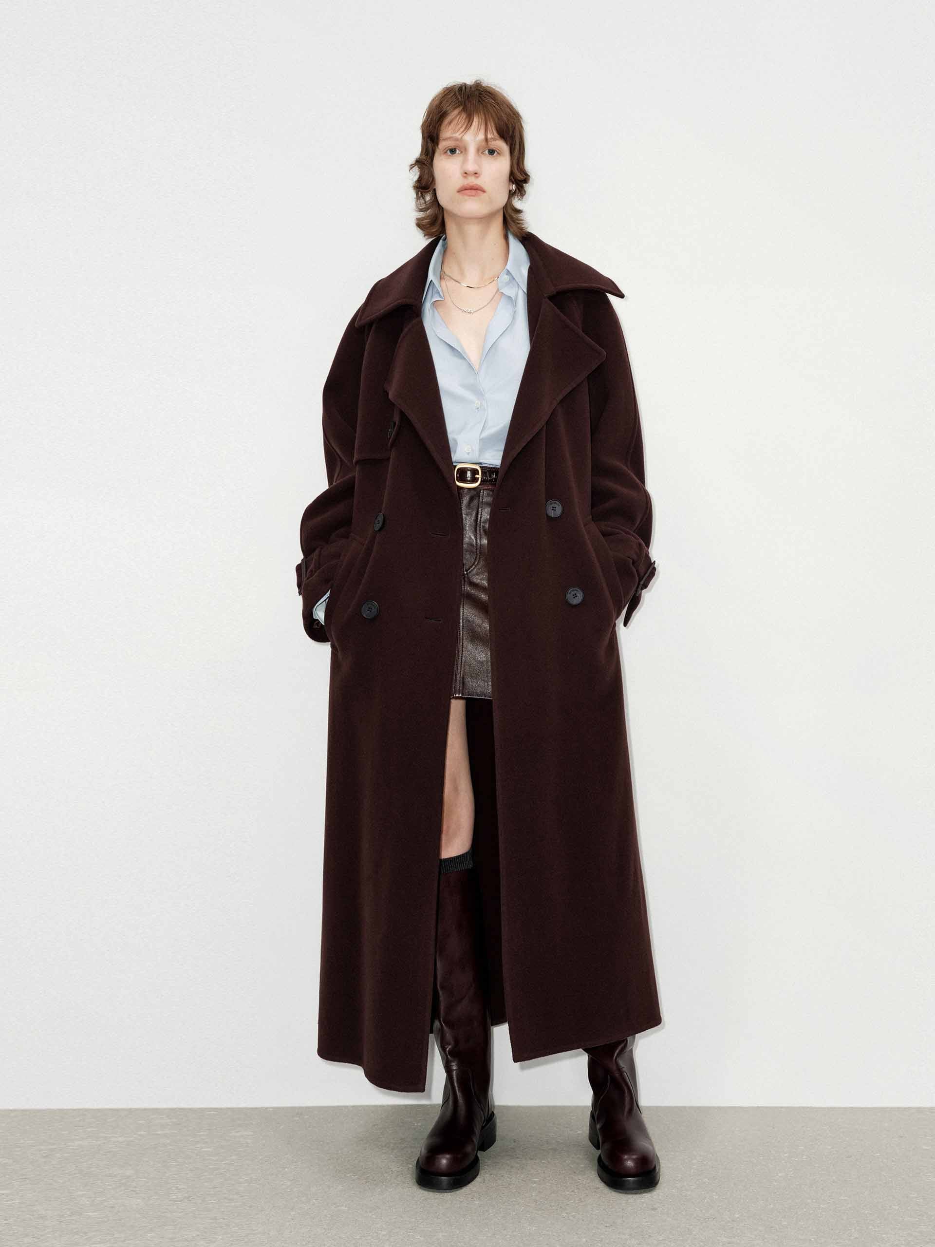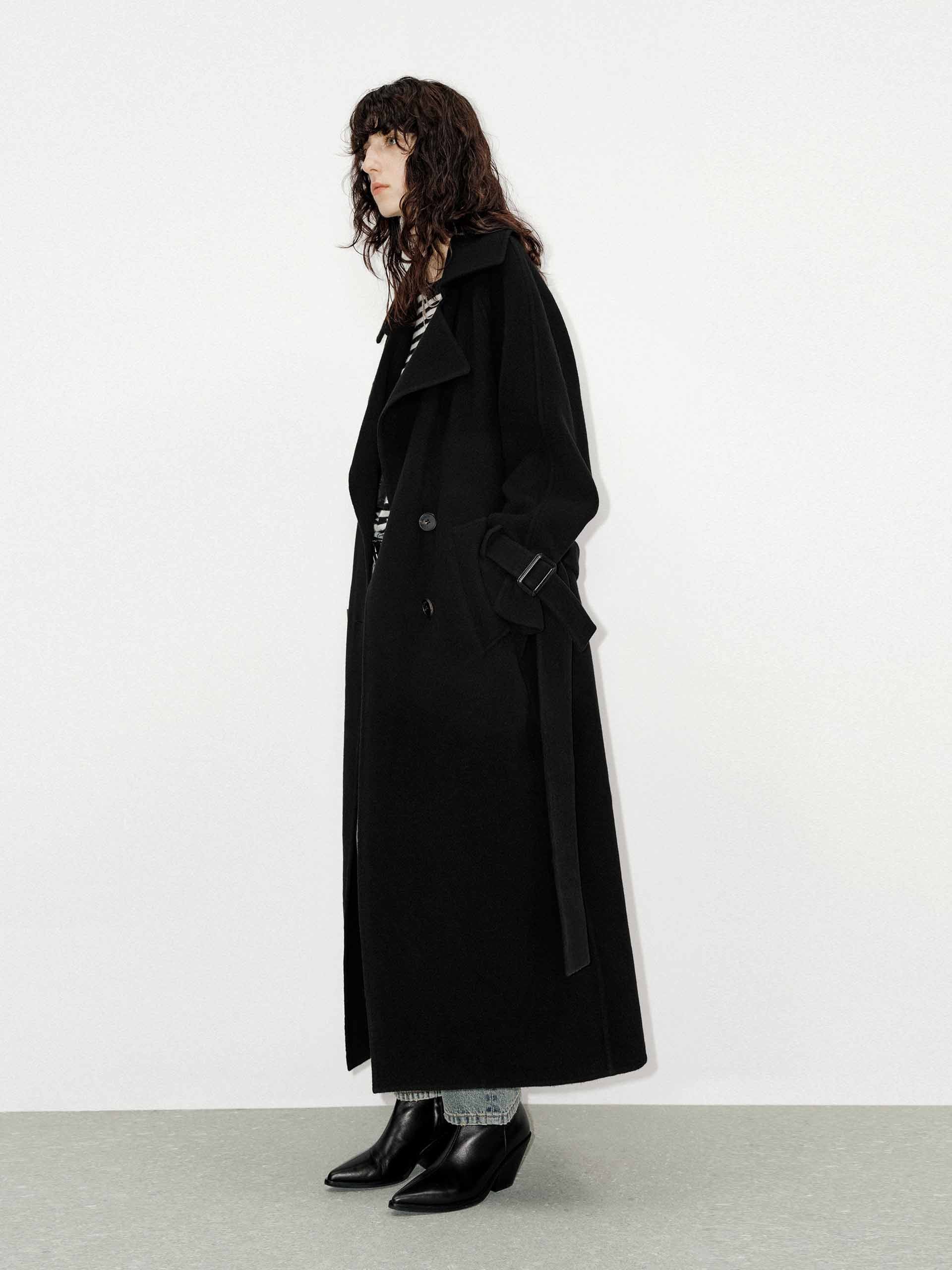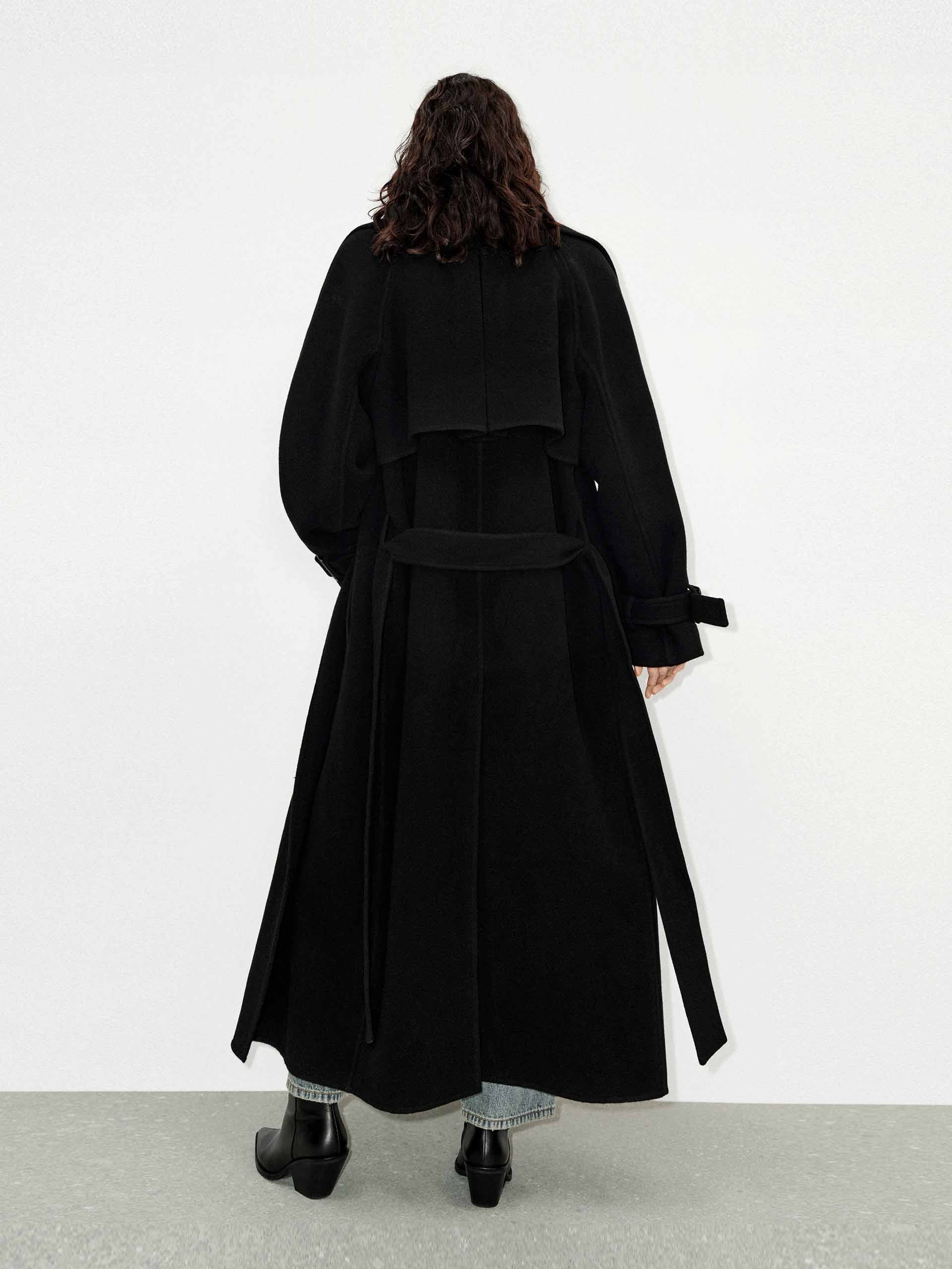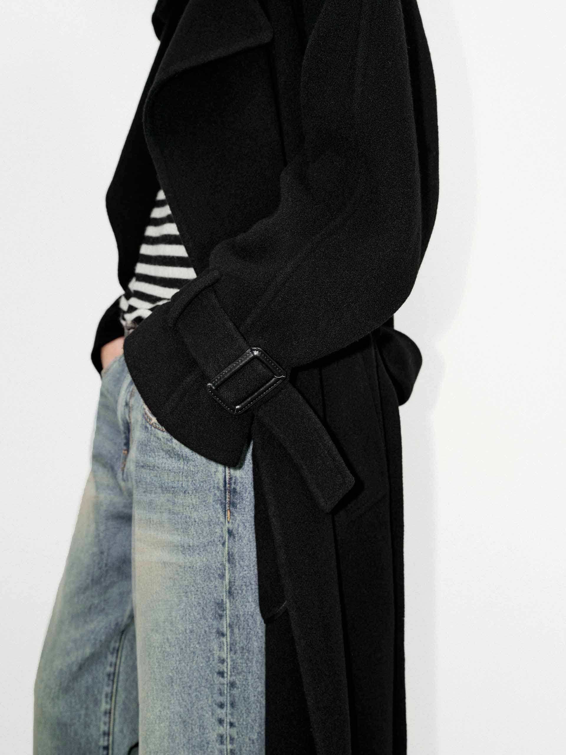 This overcoat is the perfect blend of classic trench style and modern design. Made from luxurious merino wool, it features an oversized lapel, wide cuffs, and a detachable belt for a cinched silhouette. With its longline cut and side-seam pockets.