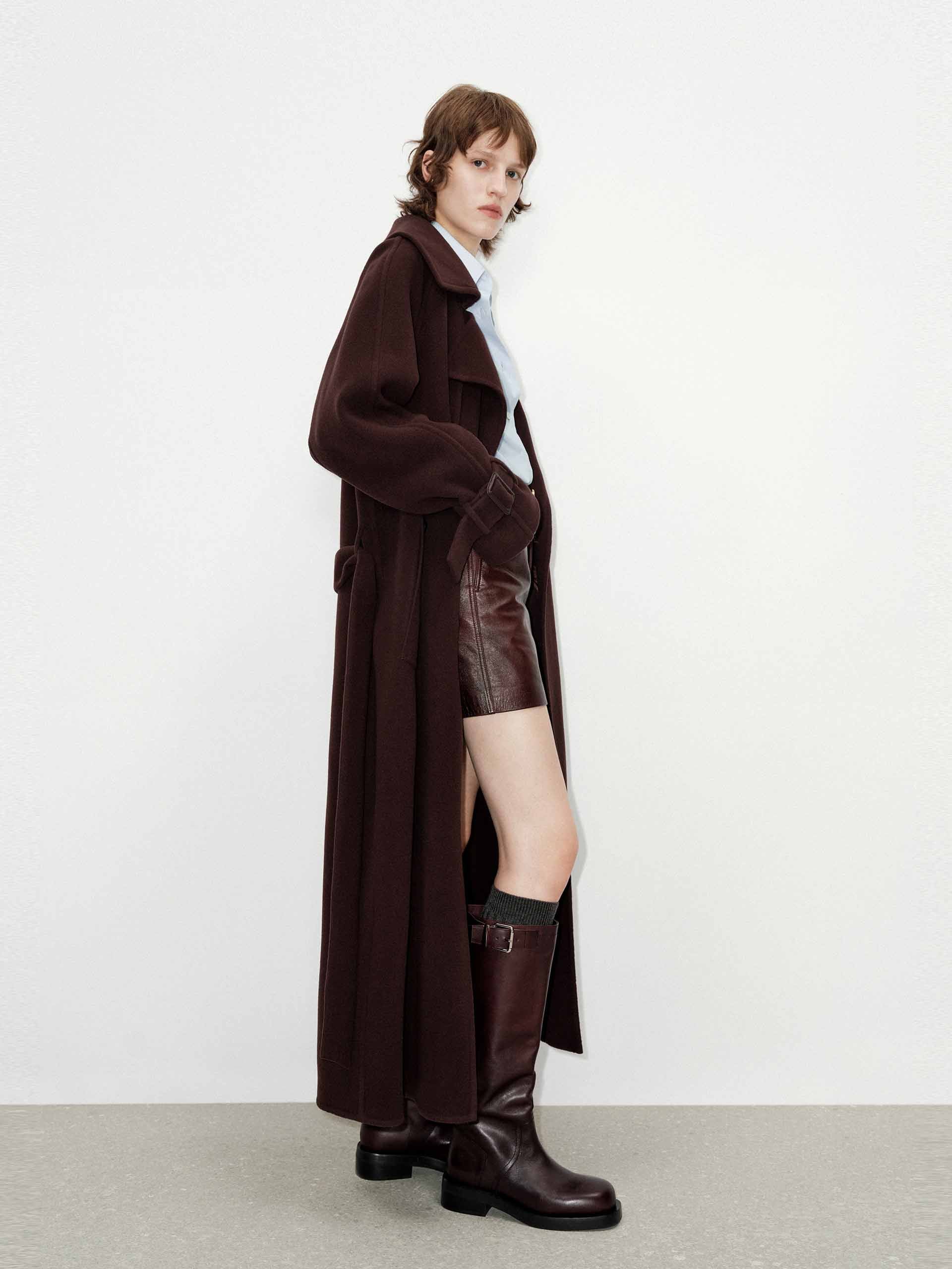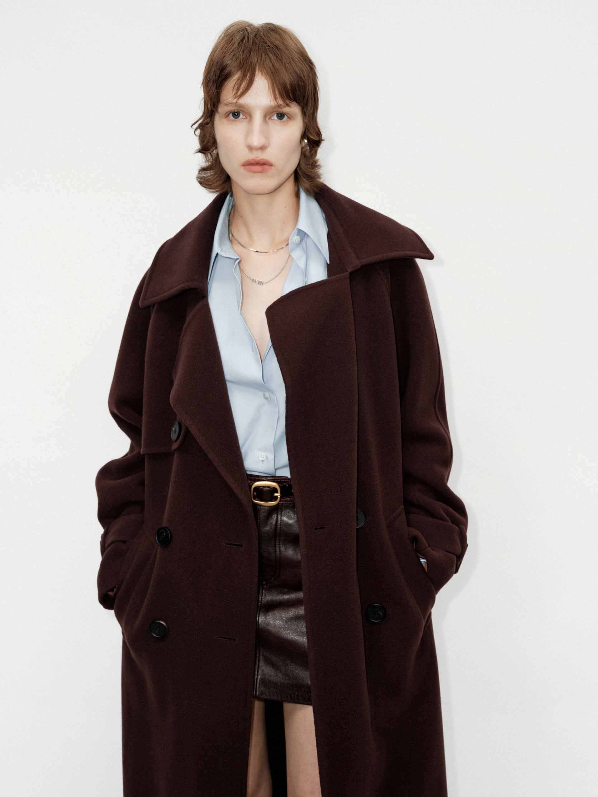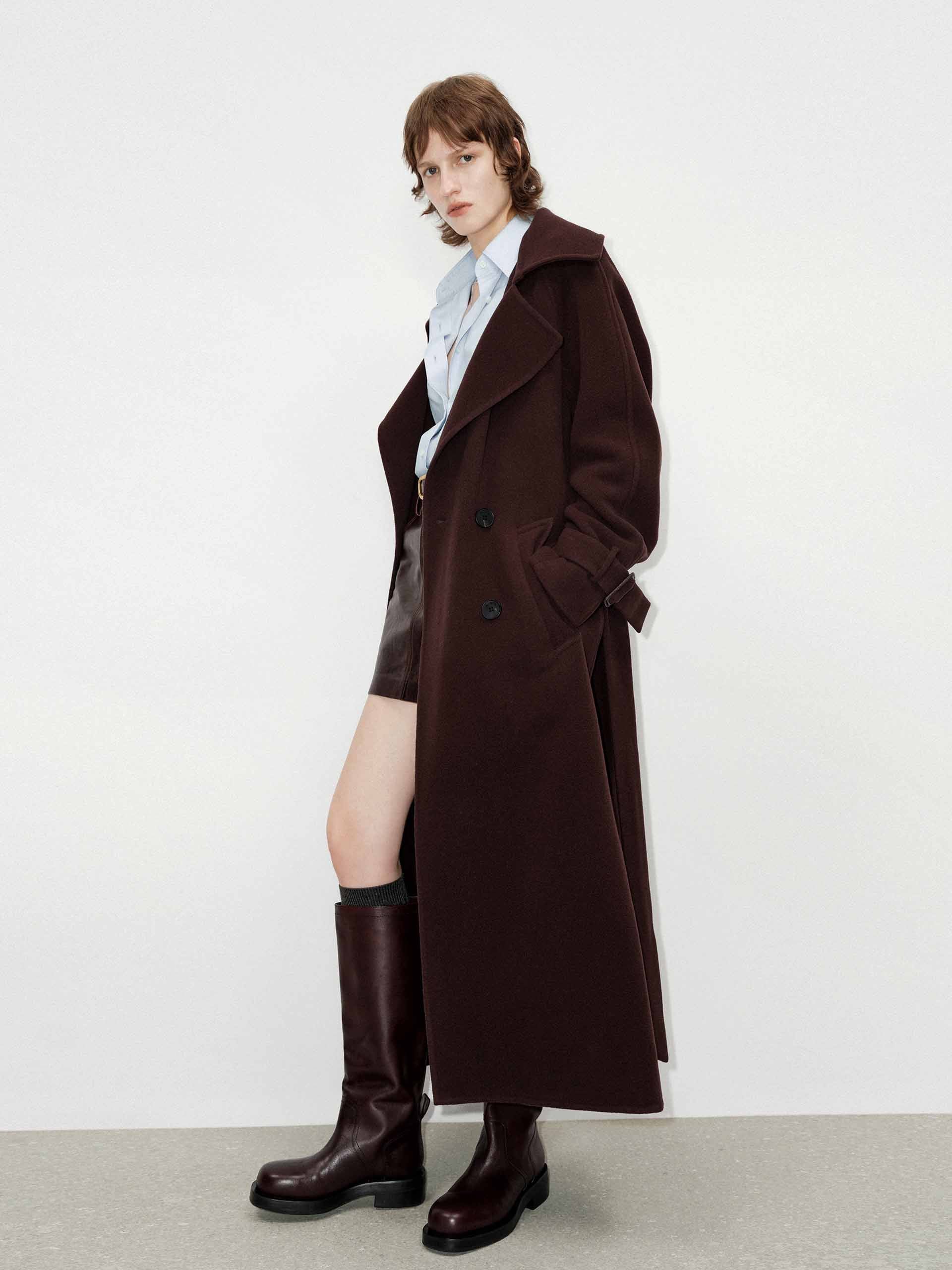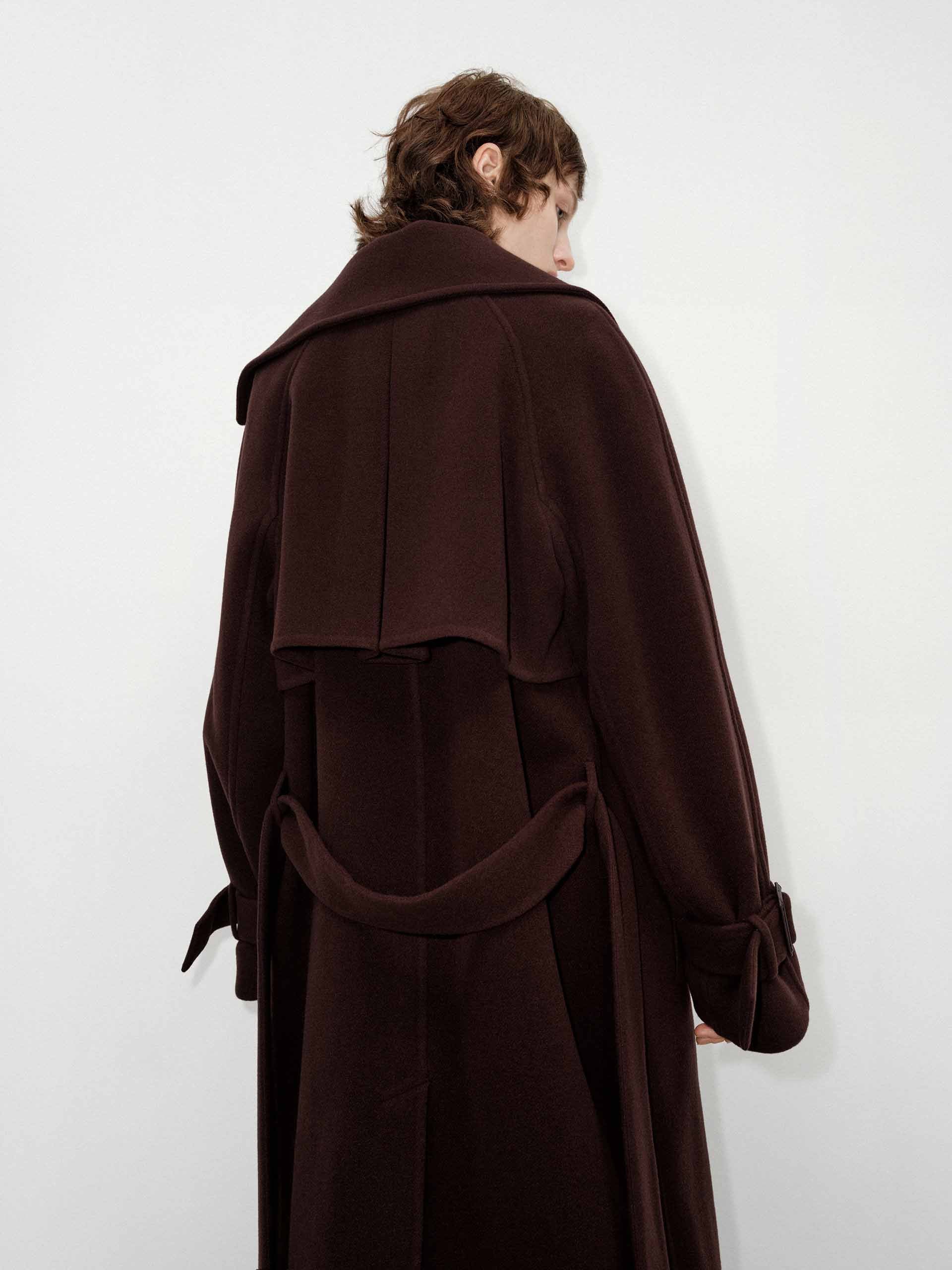 This overcoat is the perfect blend of classic trench style and modern design. Made from luxurious merino wool, it features an oversized lapel, wide cuffs, and a detachable belt for a cinched silhouette. With its longline cut and side-seam pockets.
