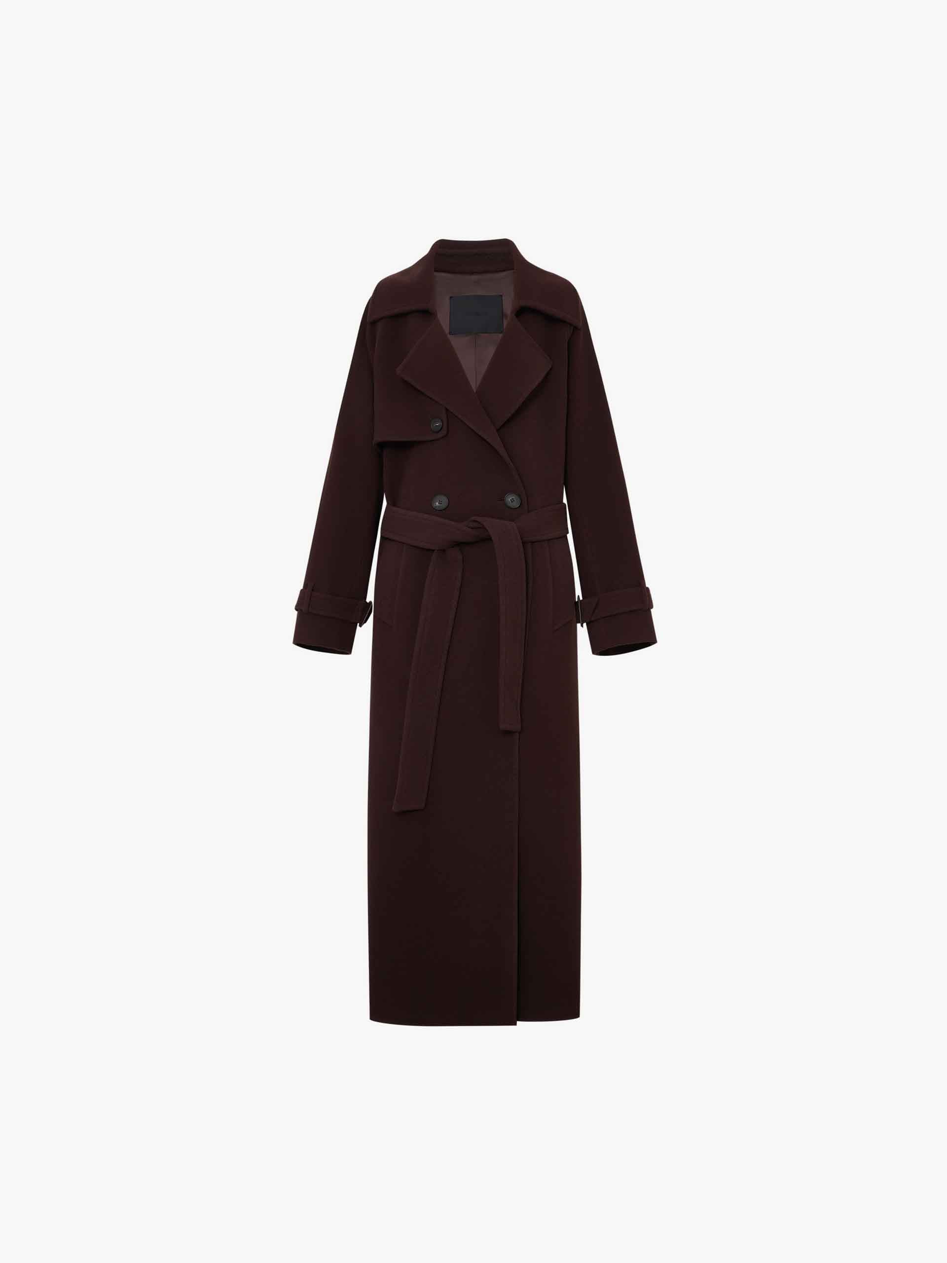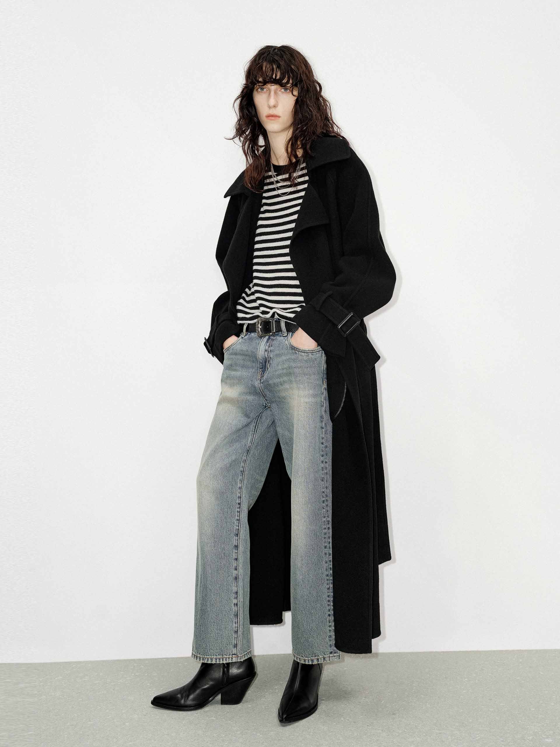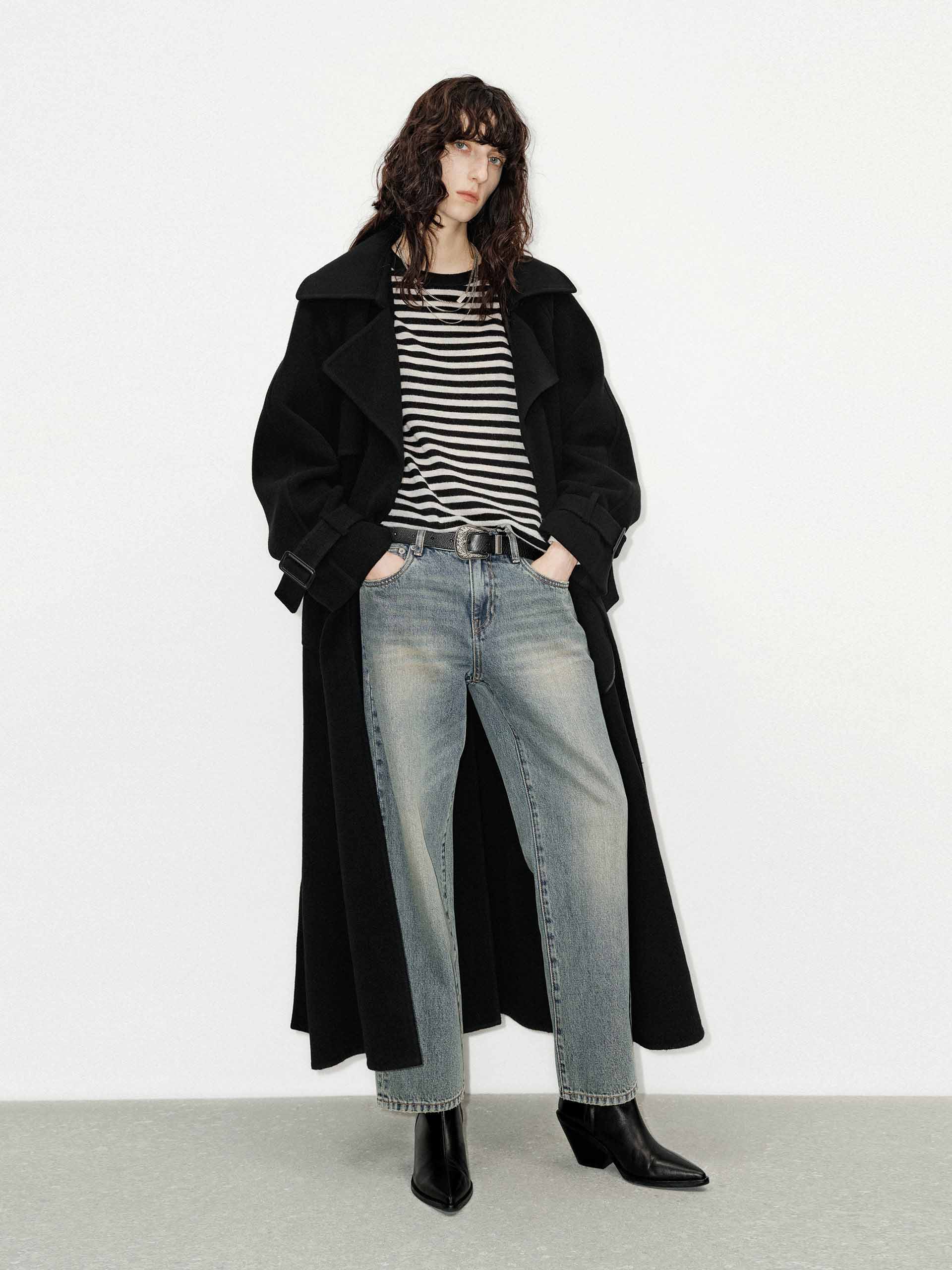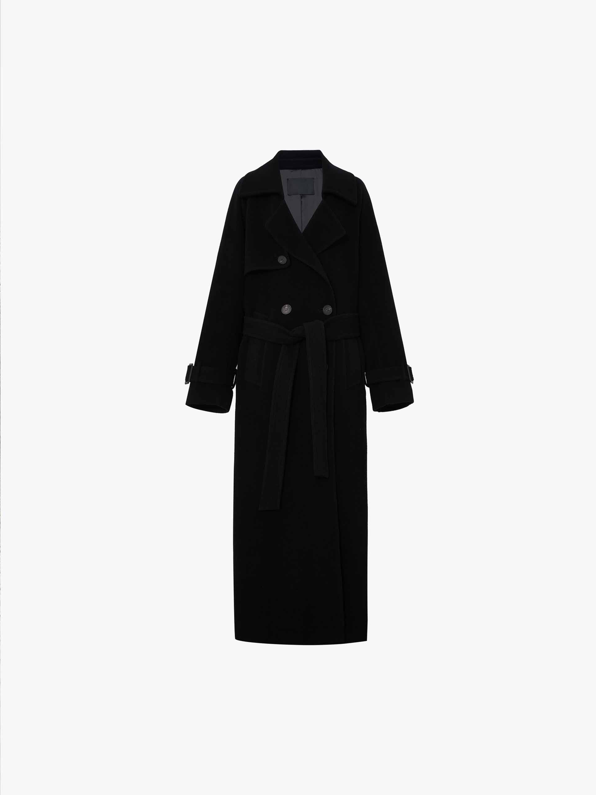 This overcoat is the perfect blend of classic trench style and modern design. Made from luxurious merino wool, it features an oversized lapel, wide cuffs, and a detachable belt for a cinched silhouette. With its longline cut and side-seam pockets.