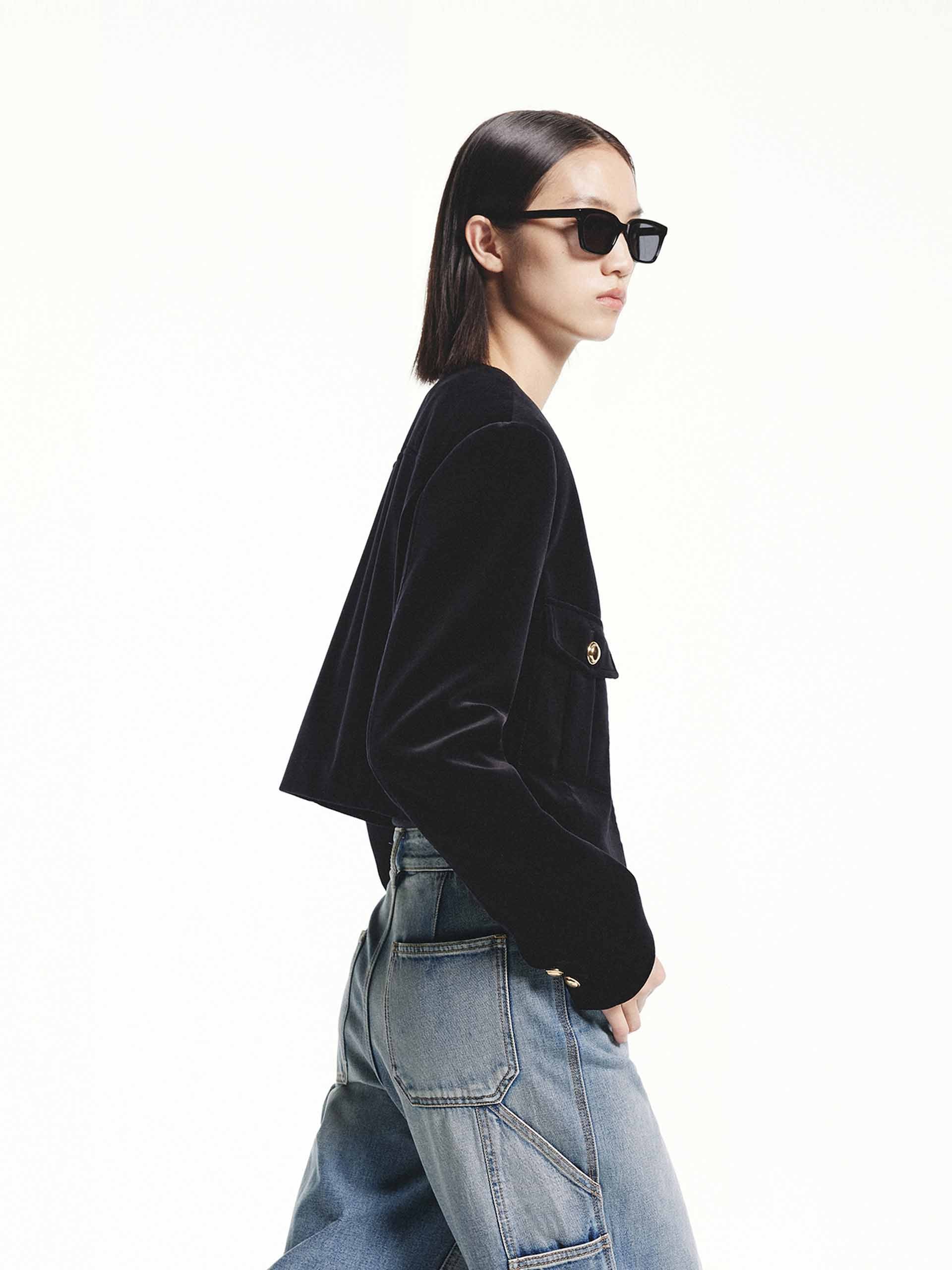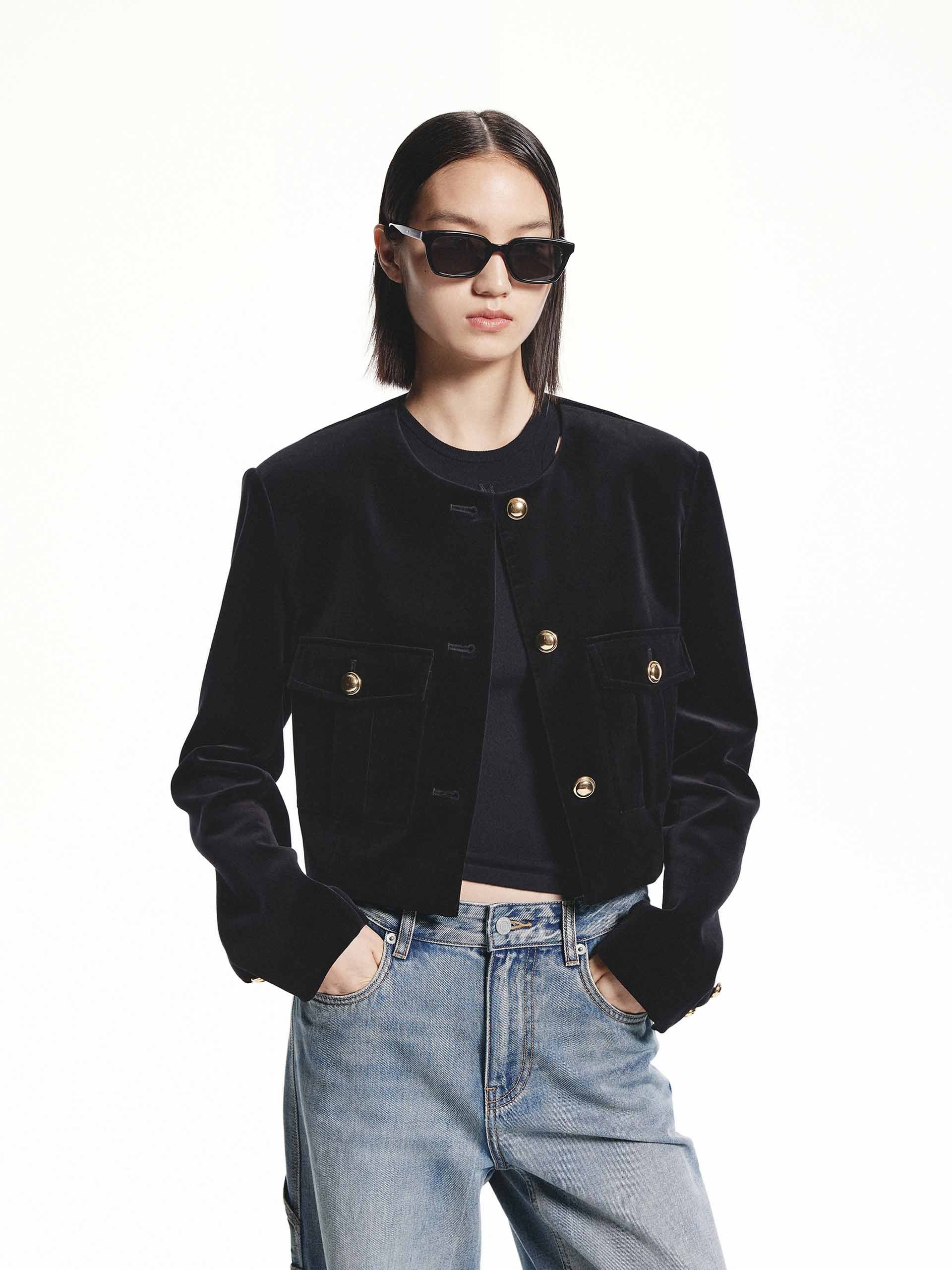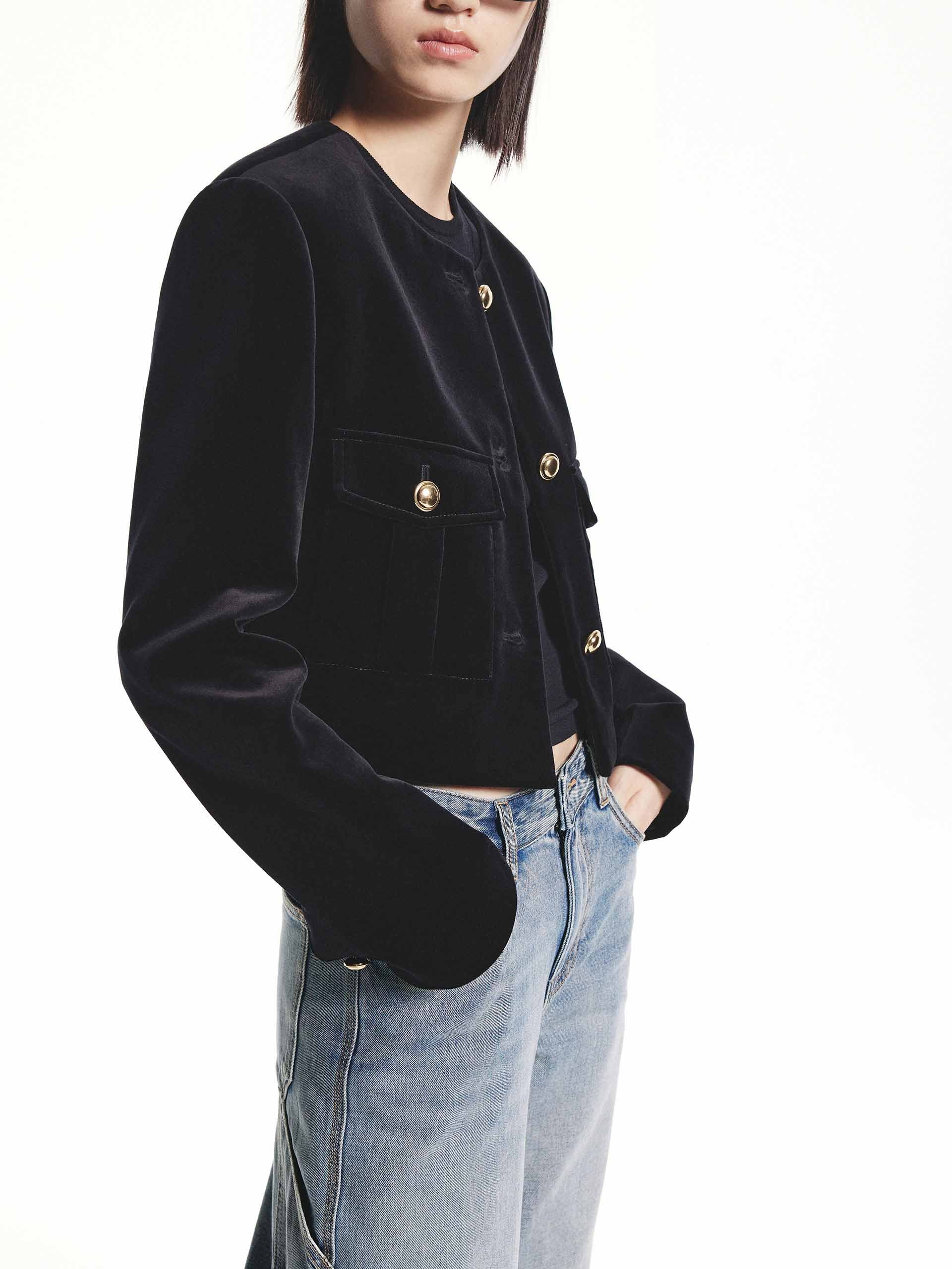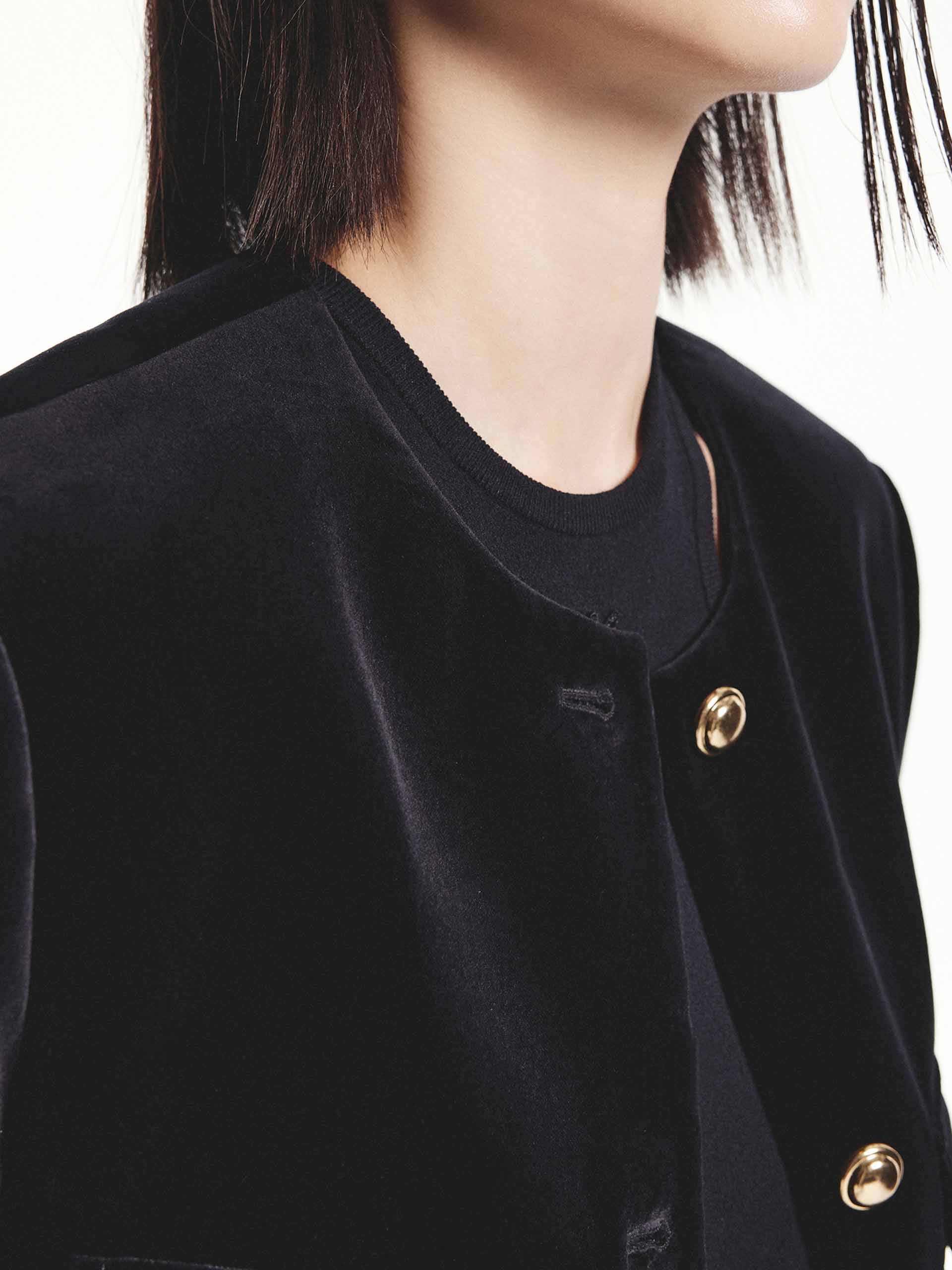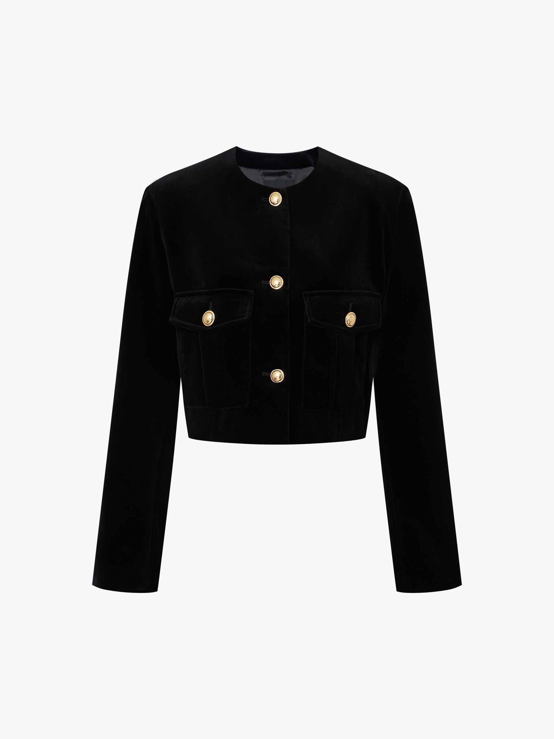 Made from comfortable cotton material with a luxurious velvet feel. This jacket is cut in short length with a collarless design and metallic button detailing adds a touch of sophistication, while the front flap pockets provide practicality.
