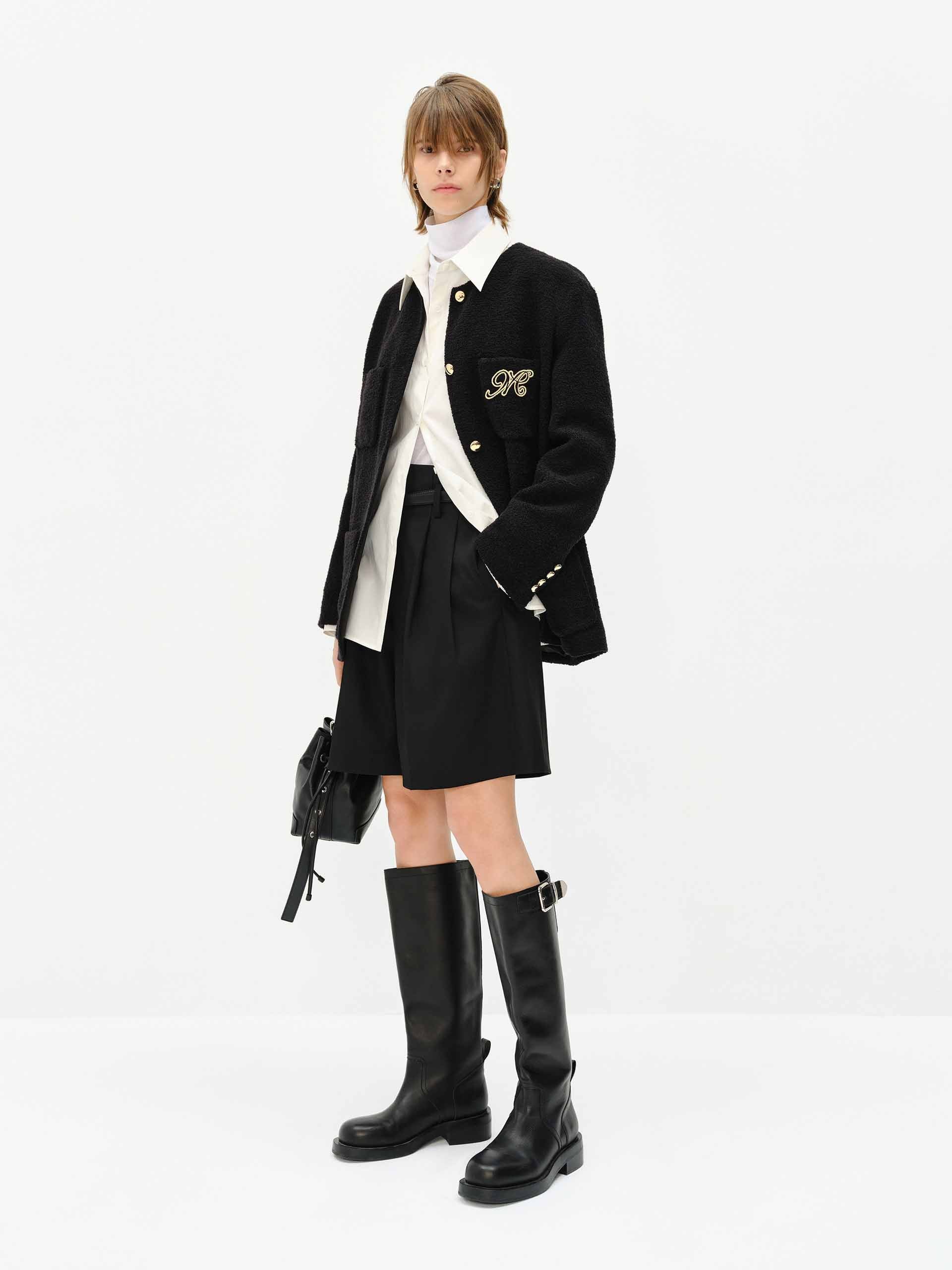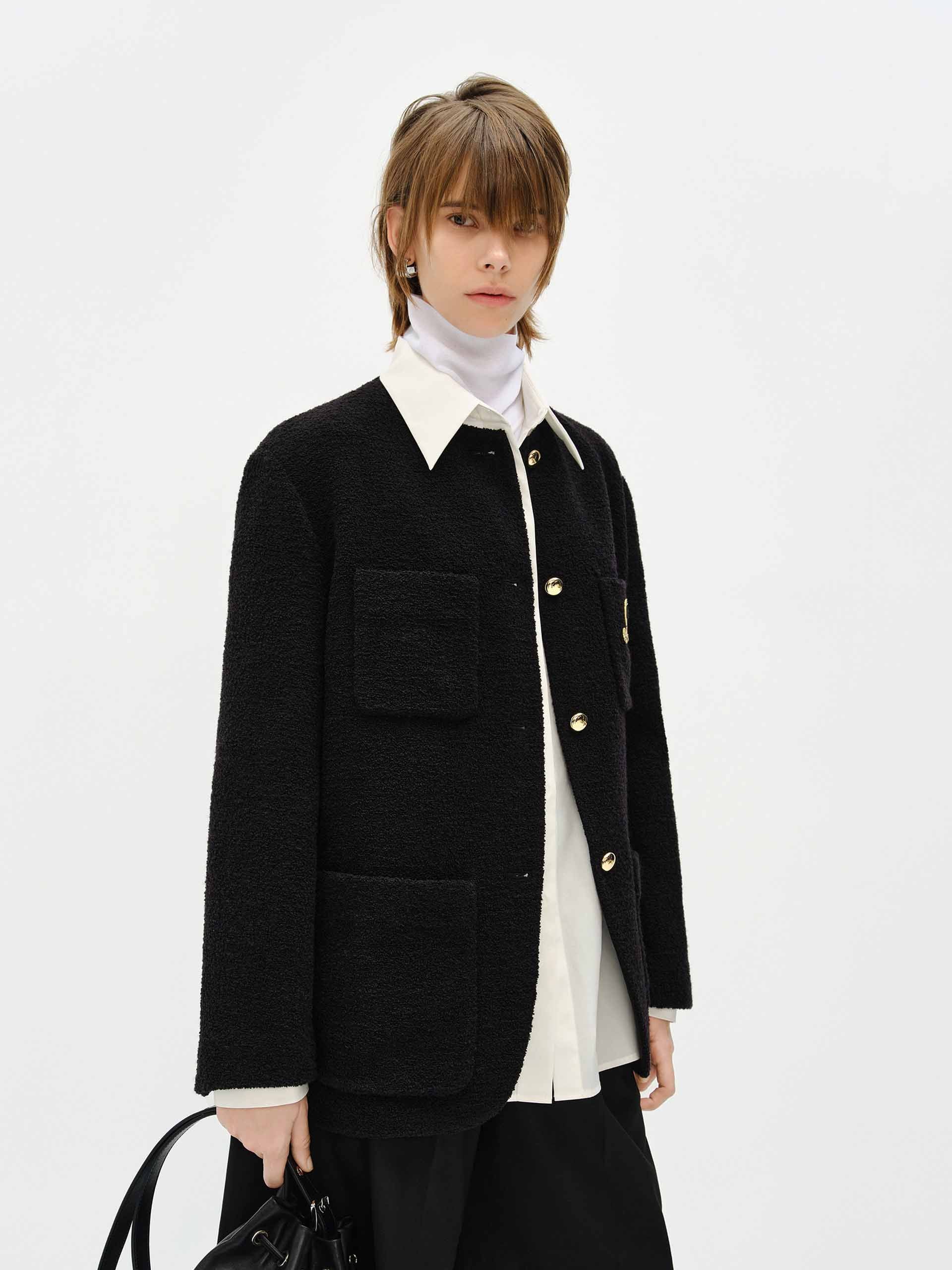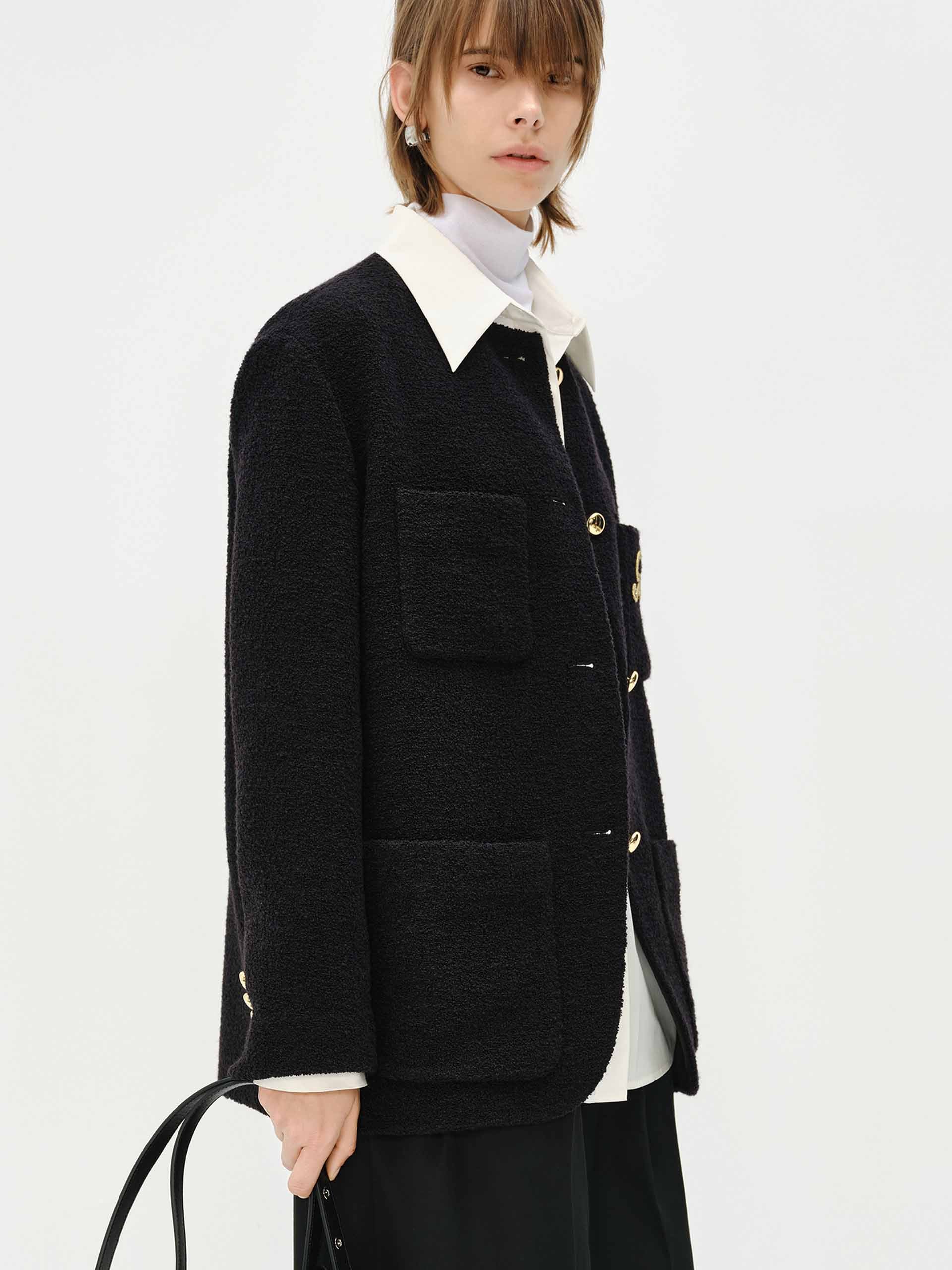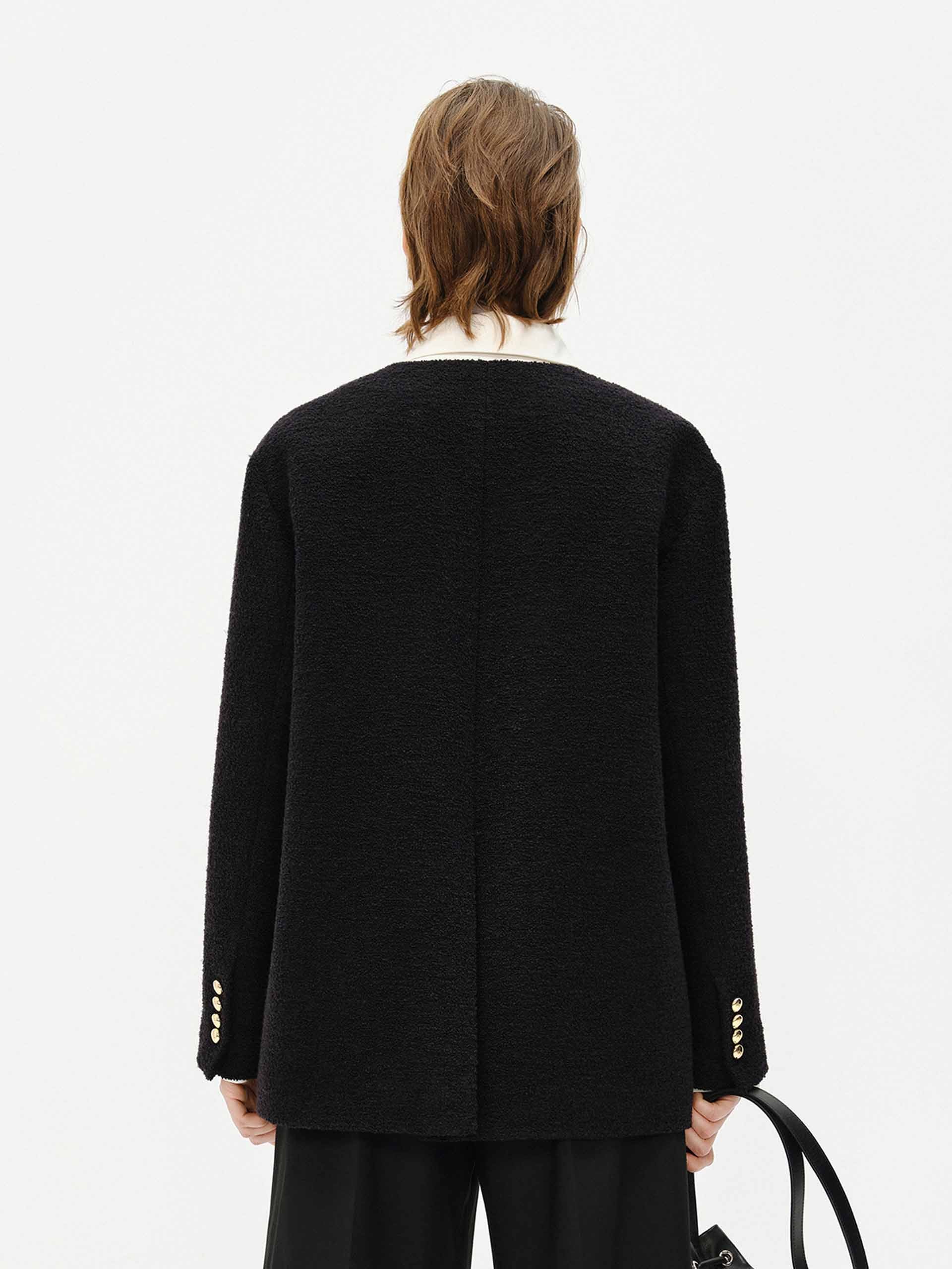 This transitional coat is perfect for layering during seasonal changes. Made with a blend of wool, cotton, and other fibers, it offers warmth and breathability. The Tweed texture adds a touch of class, while the collarless design and multi-pocket design make it practical for everyday wear.