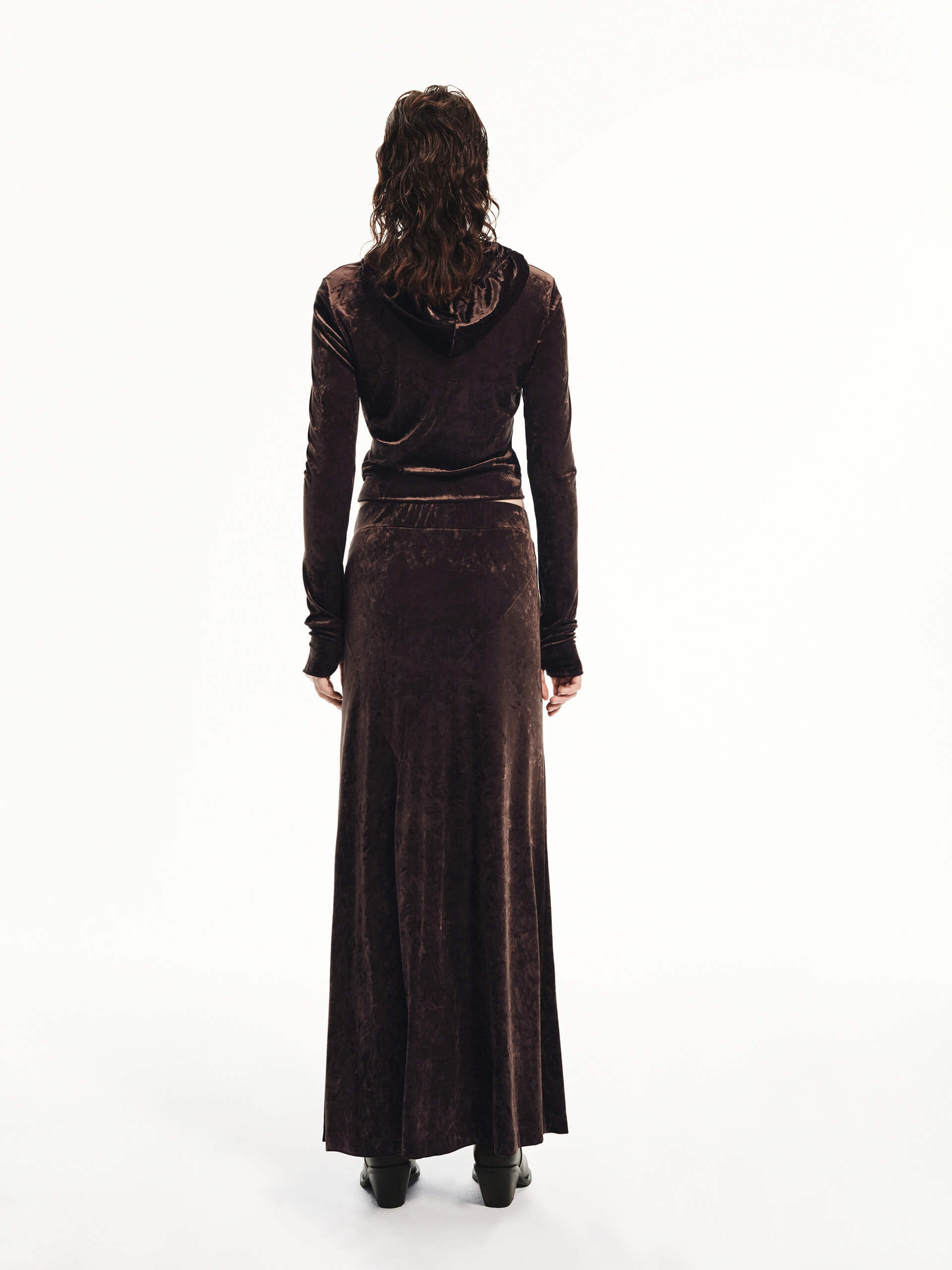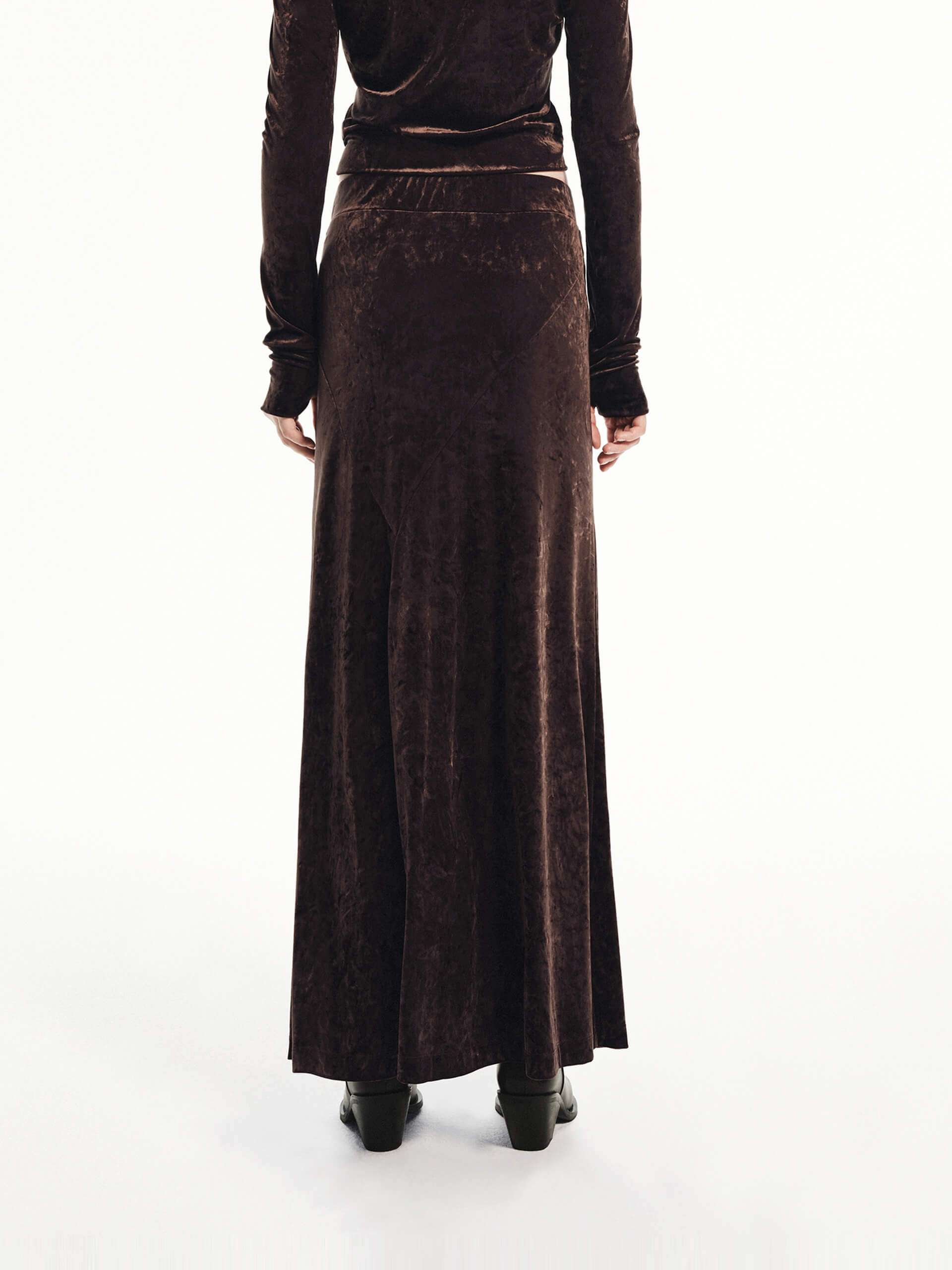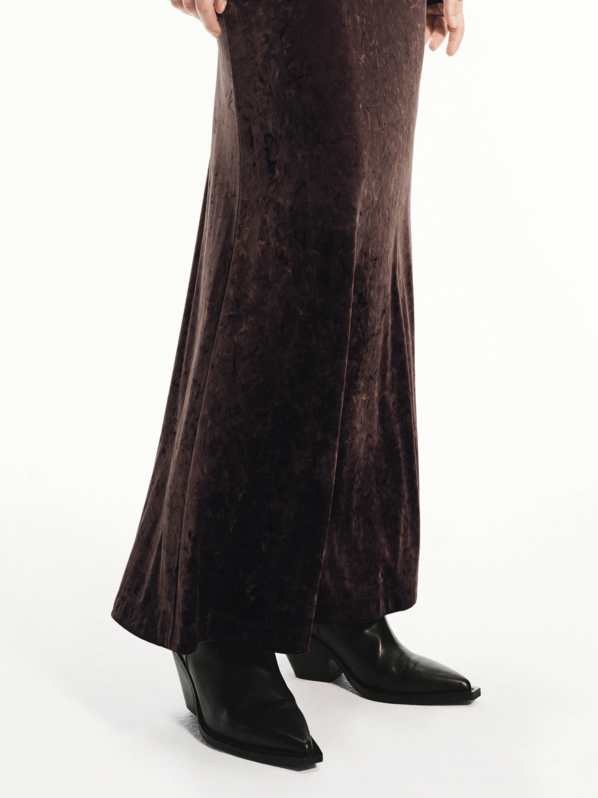 Crafted from soft-sheen velvet, it features a fitted waist and drawstring waistband for a perfect fit. The flared hem adds fluid movement, making it an elegant addition to any ensemble. Pair it with the matching jacket for a stunning look.