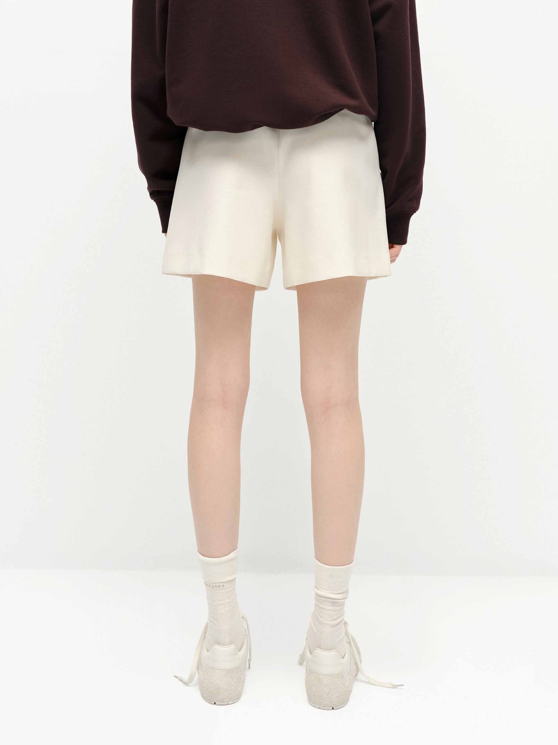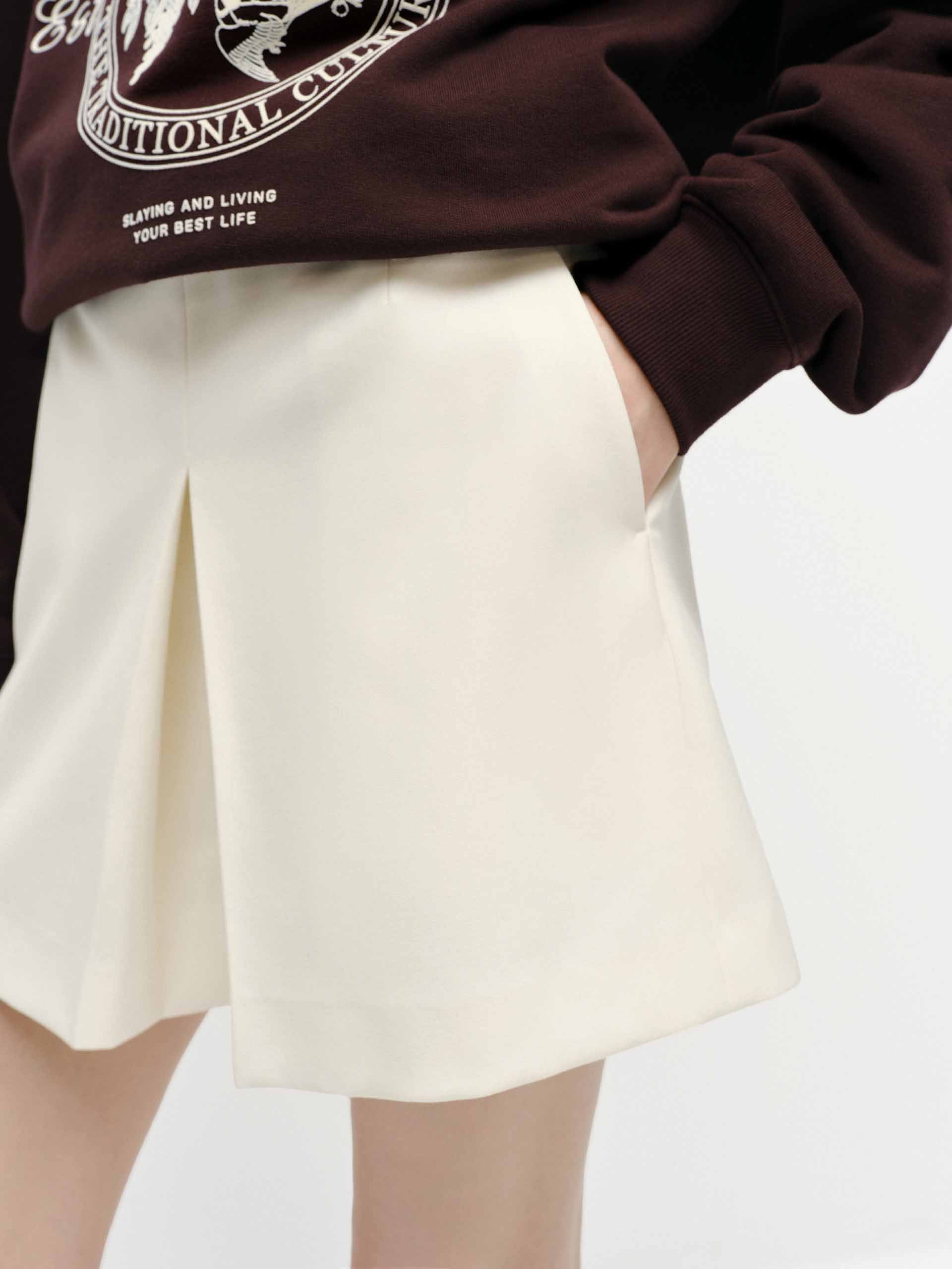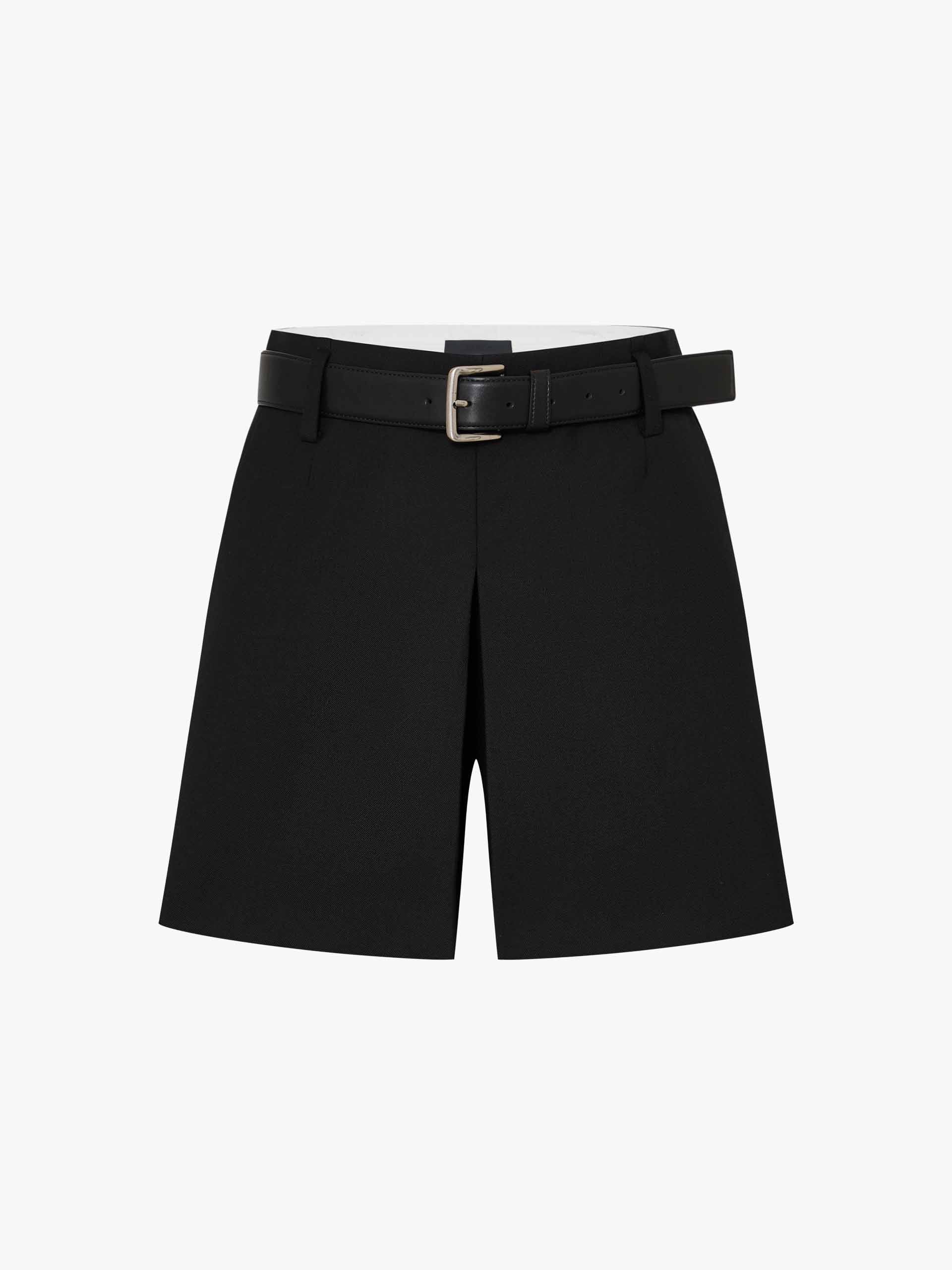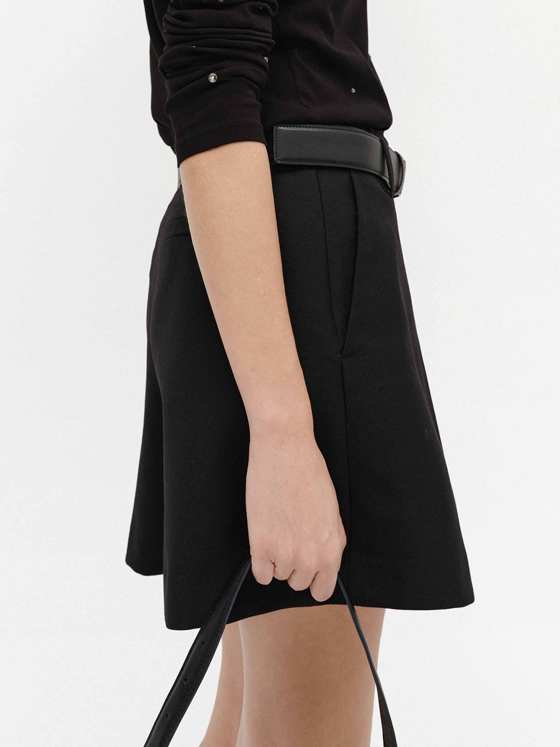 Crafted from a luxurious wool blend, these shorts feature a high waist for a flattering fit, they are tailored to A-line cut and designed with convenient side pockets and a secure zip closure.