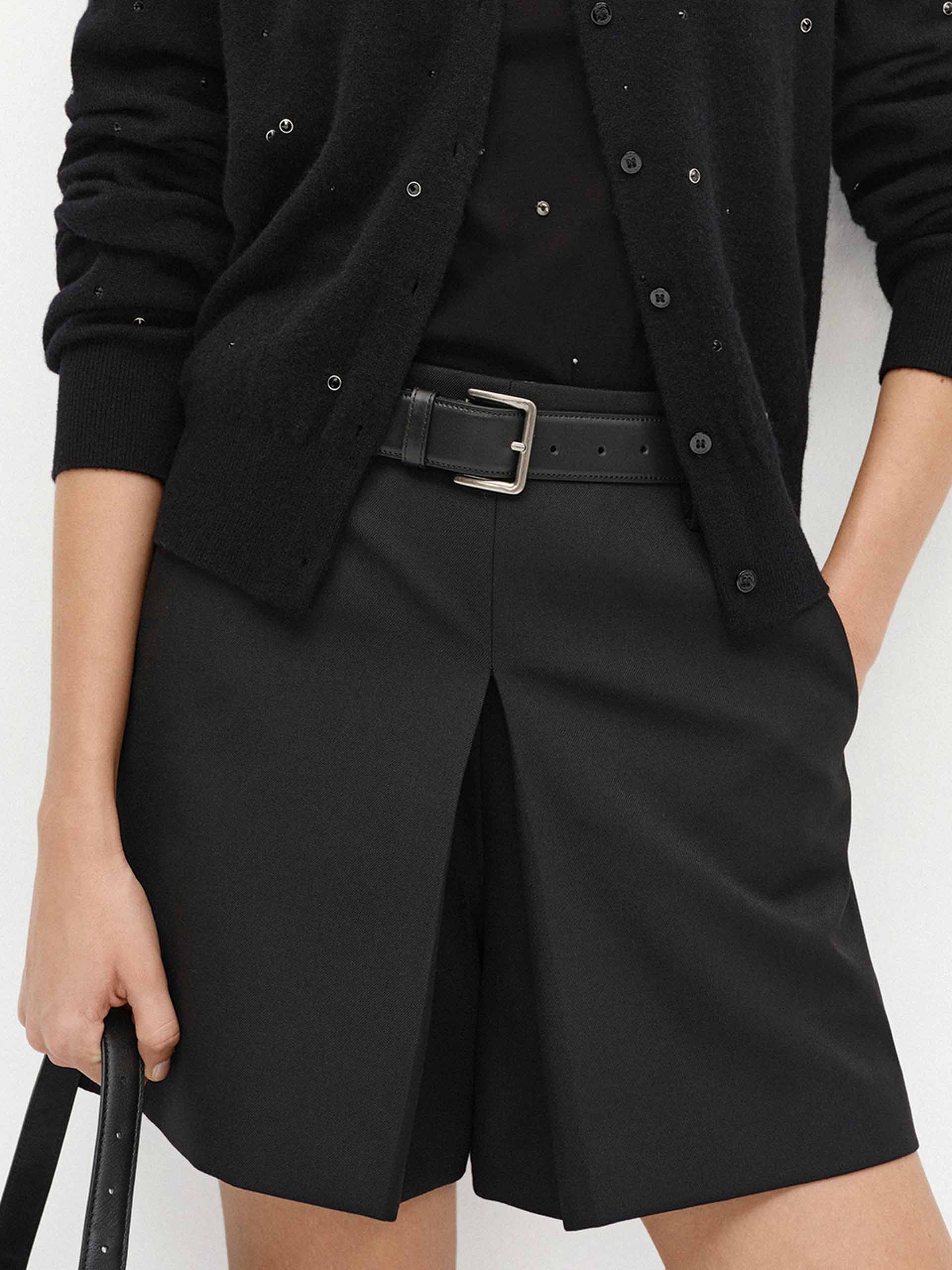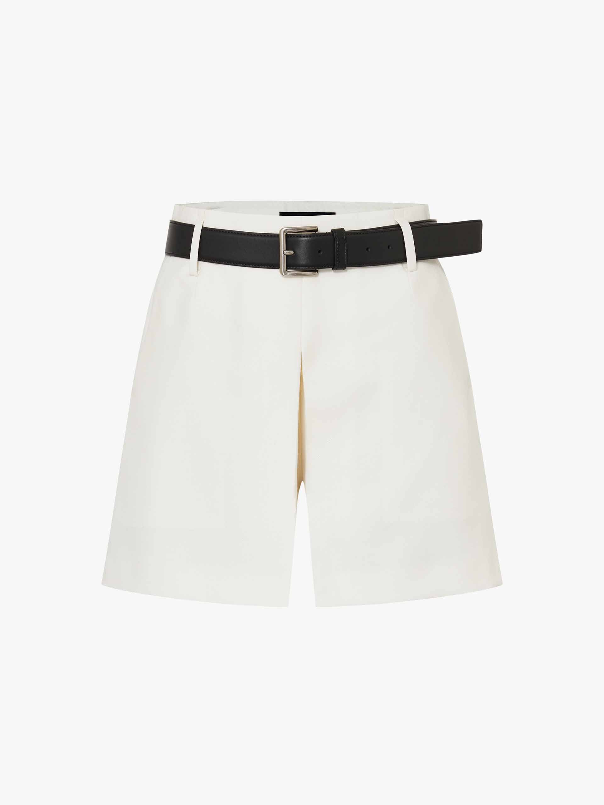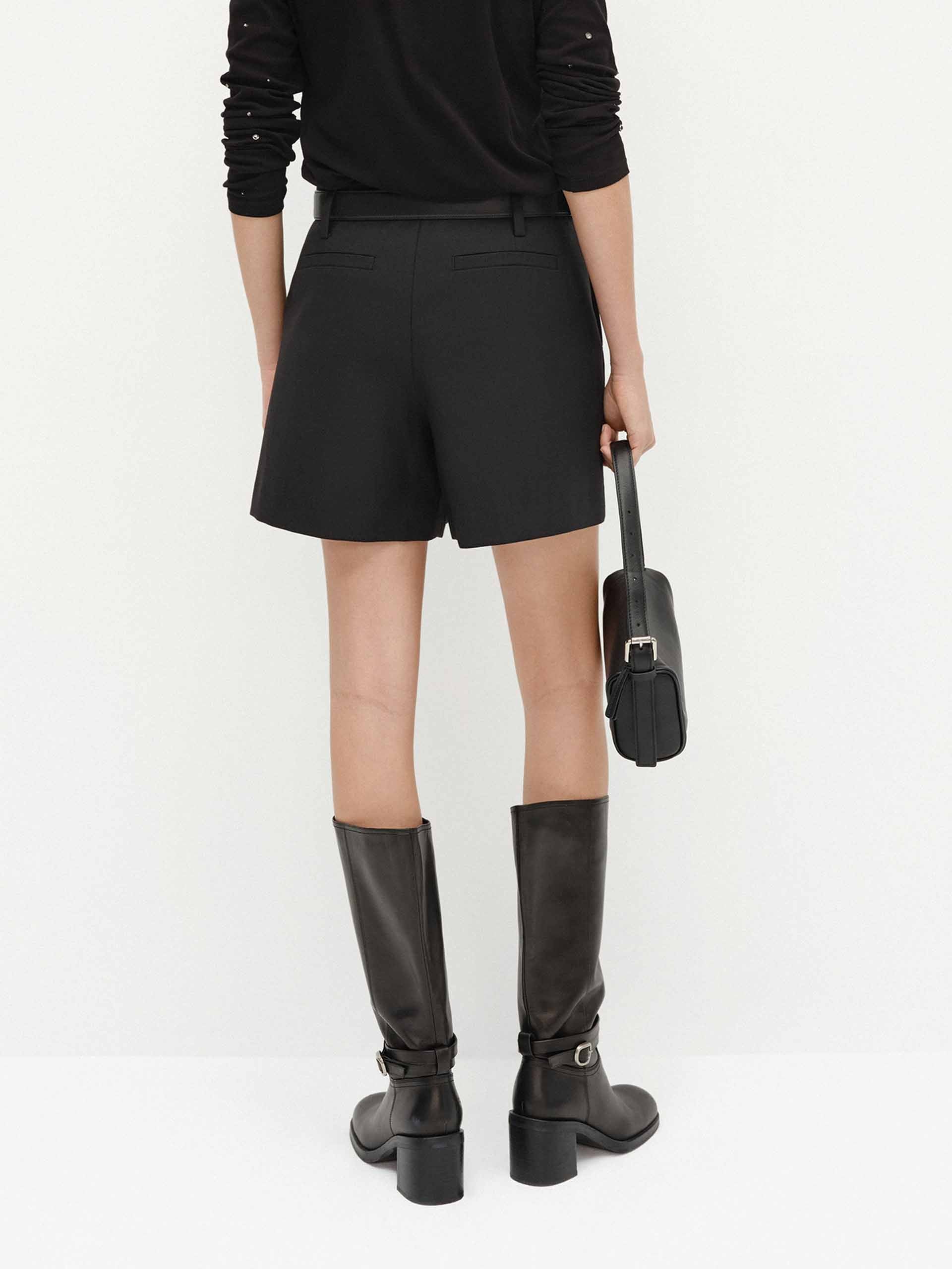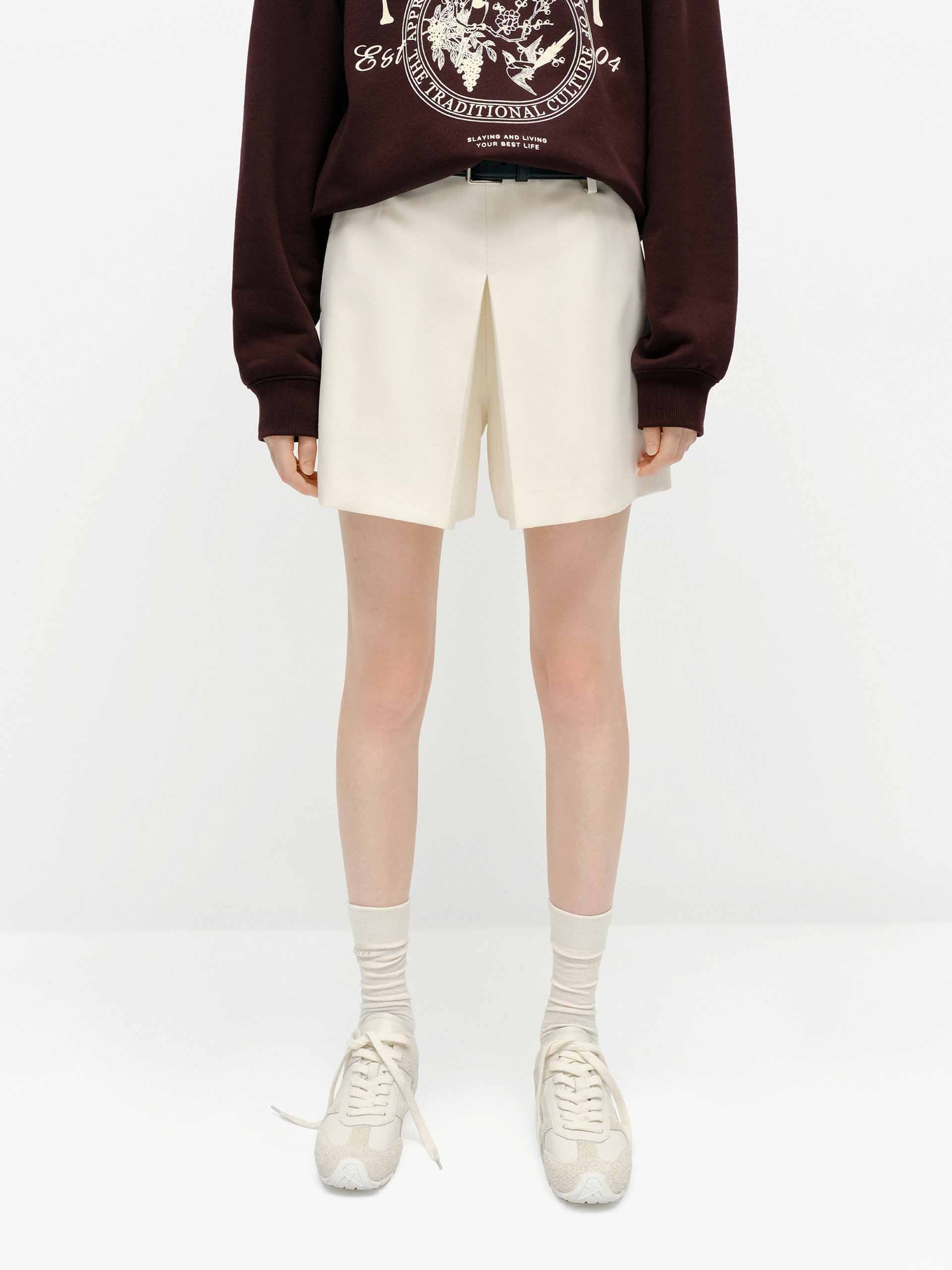 Crafted from a luxurious wool blend, these shorts feature a high waist for a flattering fit, they are tailored to A-line cut and designed with convenient side pockets and a secure zip closure.