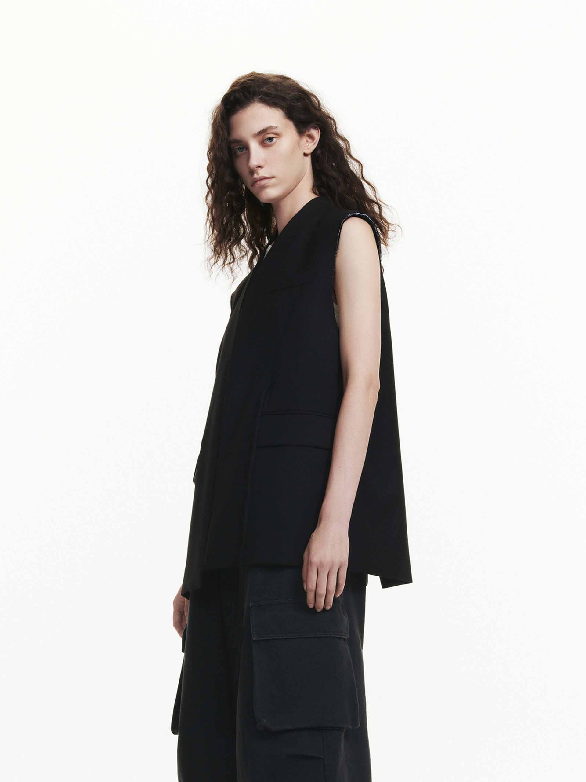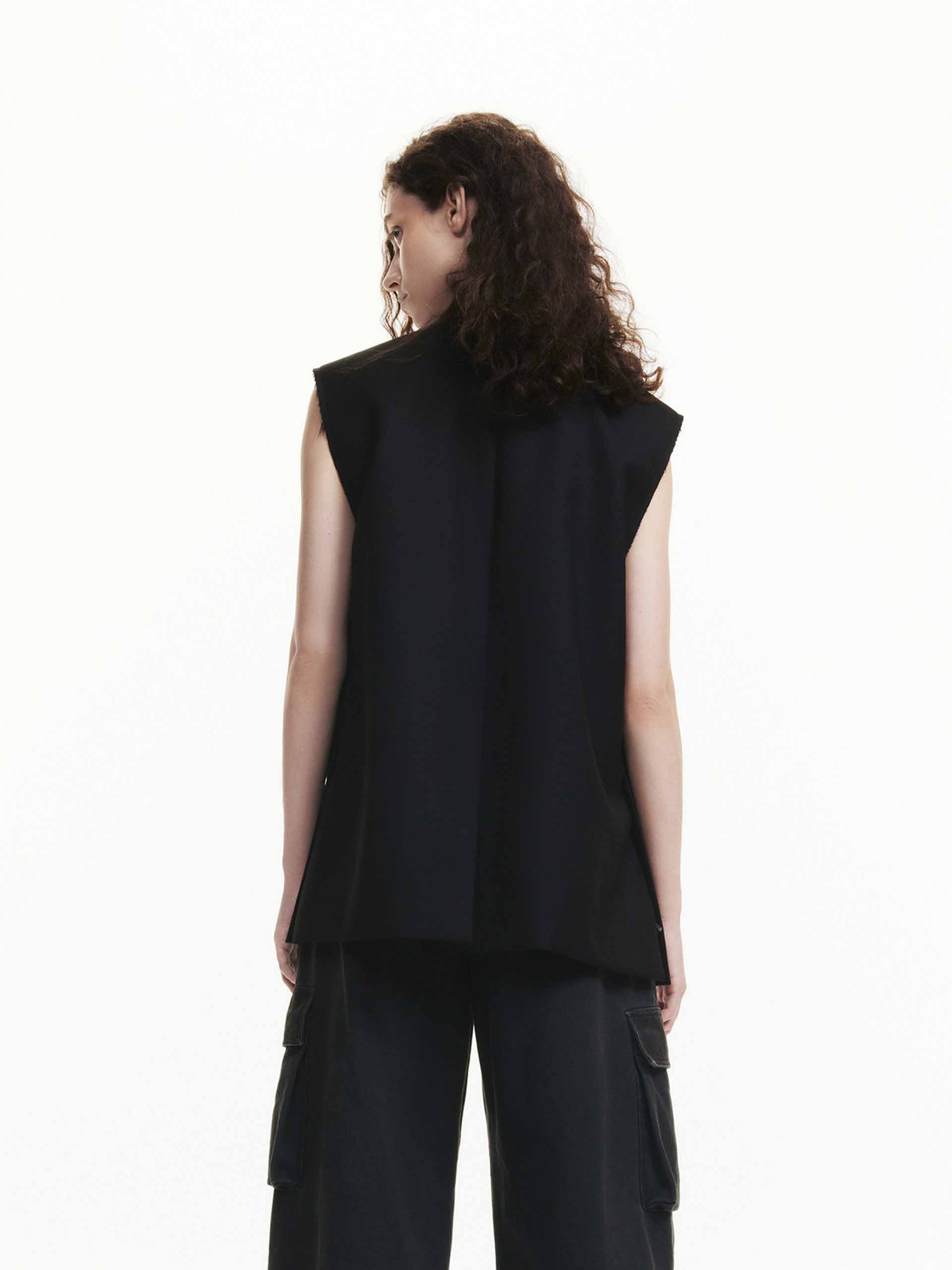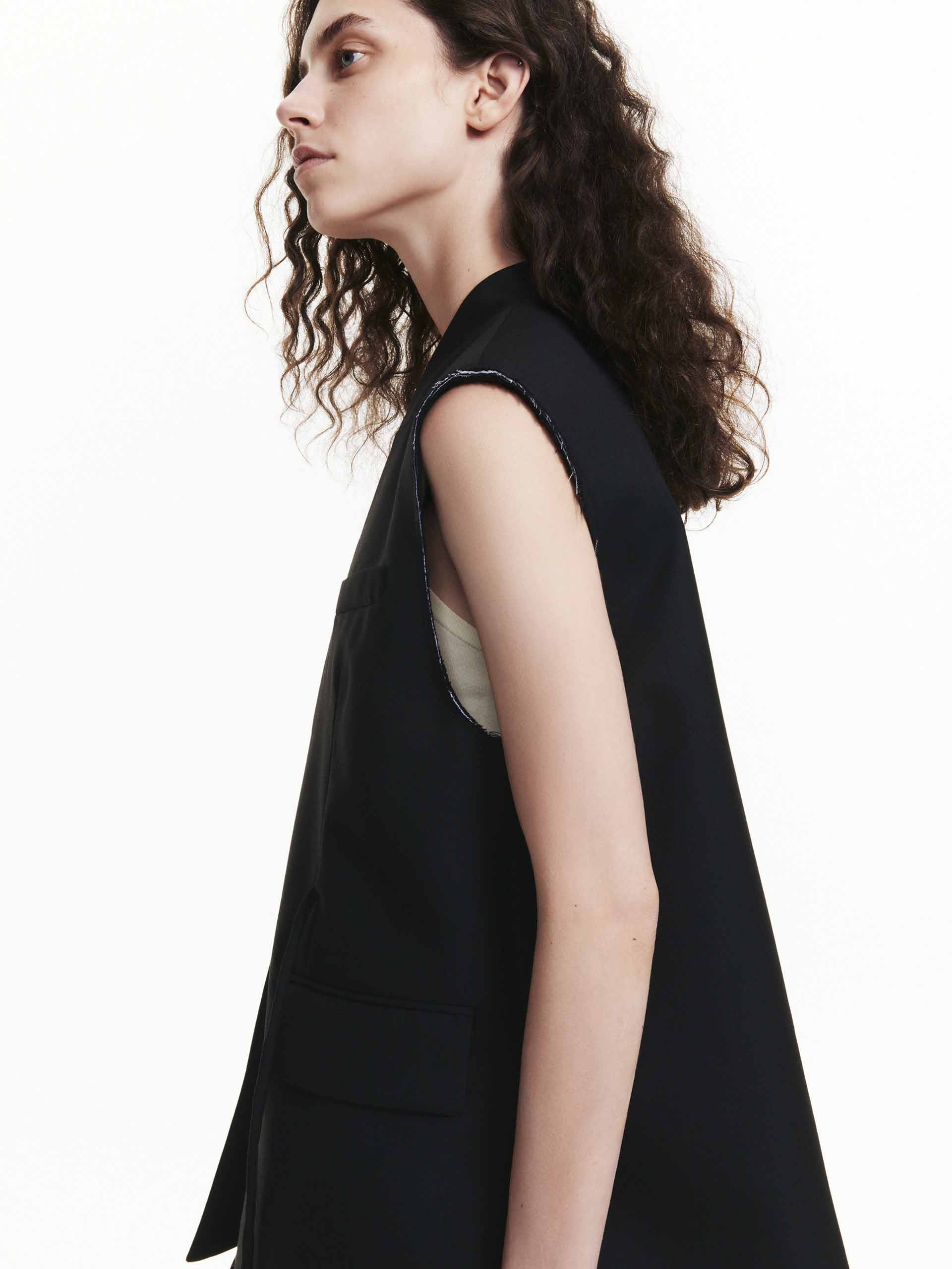 Expertly crafted in a blend of wool with full lining, this waistcoat features padded shoulders for added structure and a collarless design with raw trim at the cuffs. Perfect for layering, this midi length waistcoat is a versatile addition to any wardrobe.