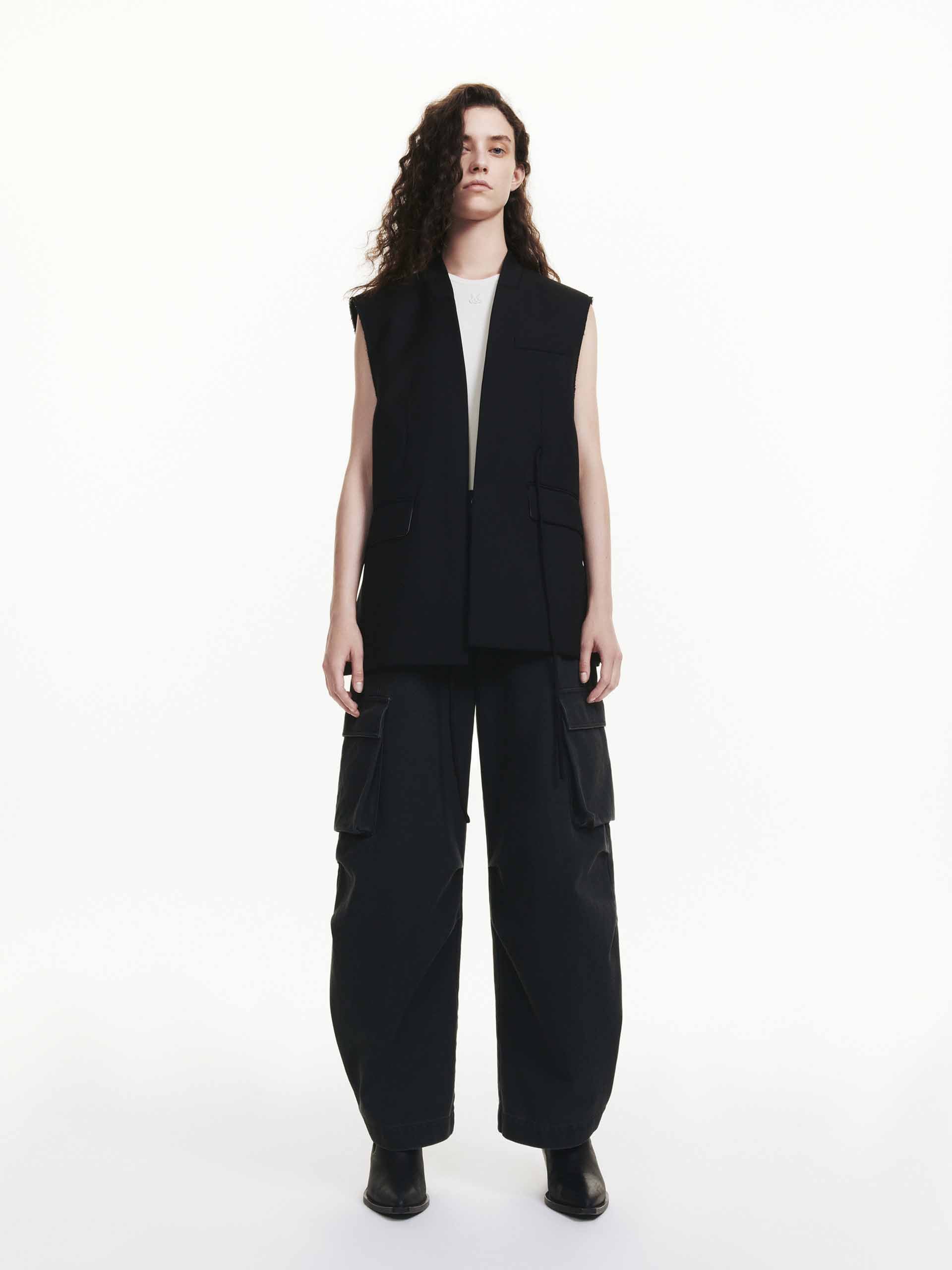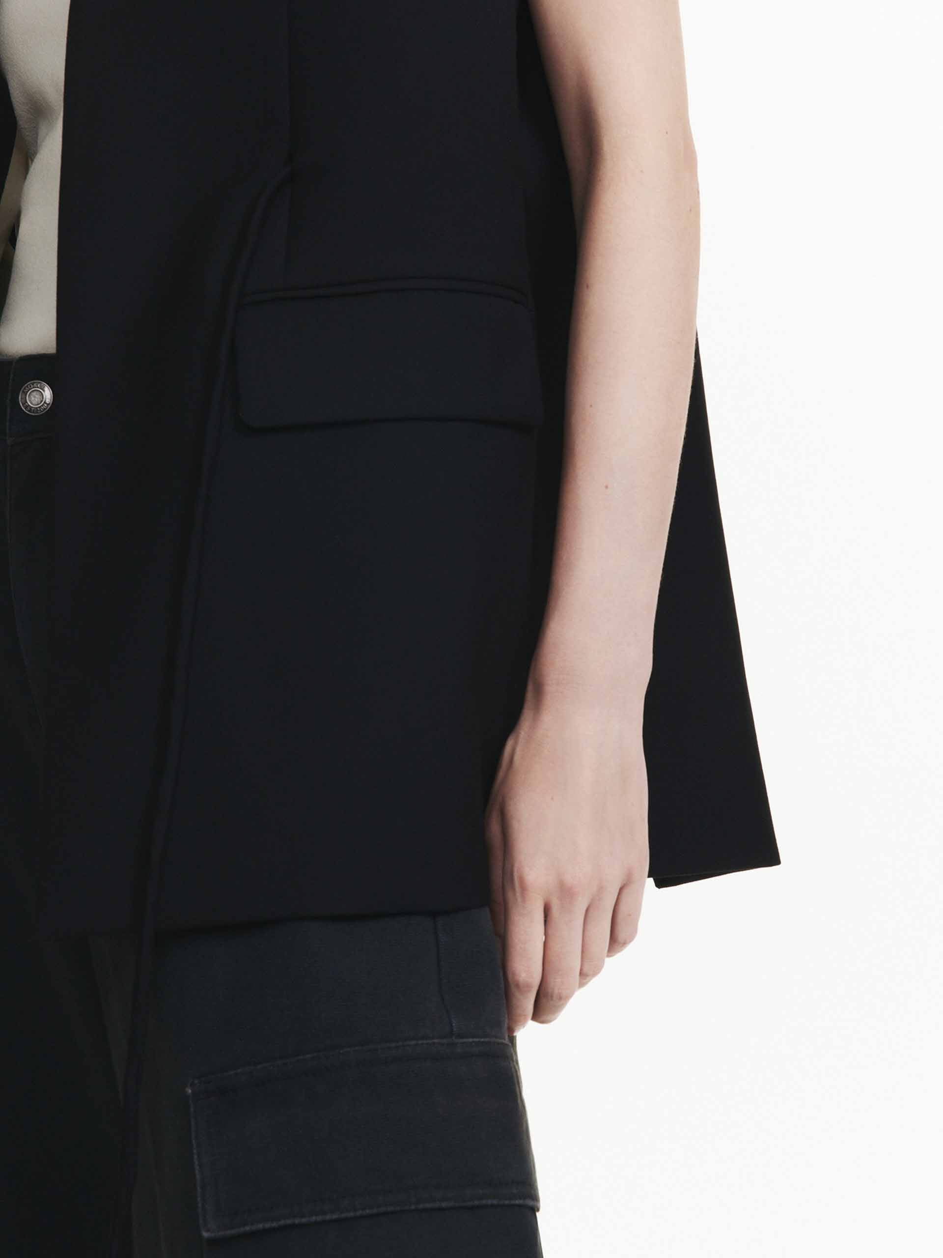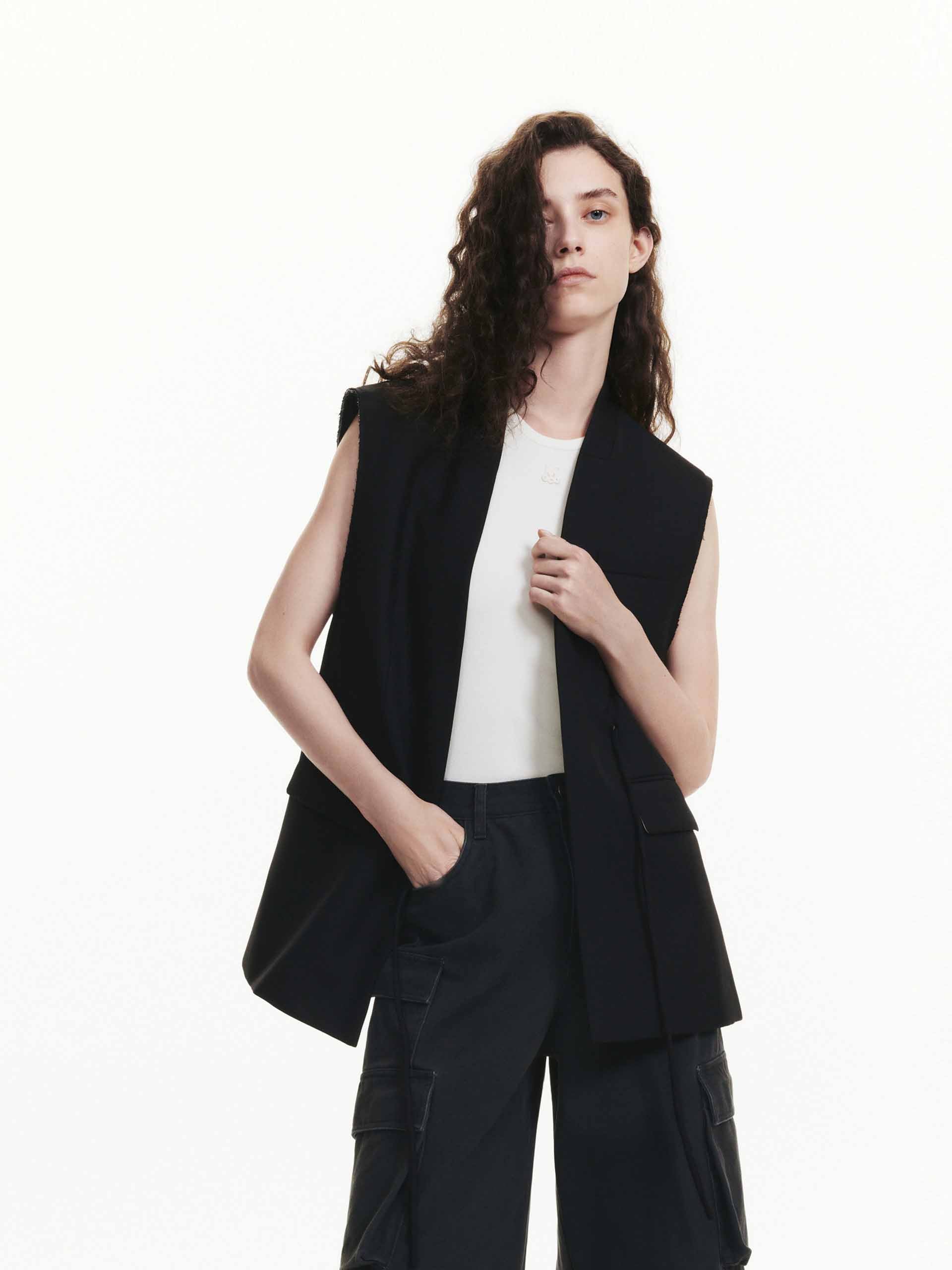 Expertly crafted in a blend of wool with full lining, this waistcoat features padded shoulders for added structure and a collarless design with raw trim at the cuffs. Perfect for layering, this midi length waistcoat is a versatile addition to any wardrobe.