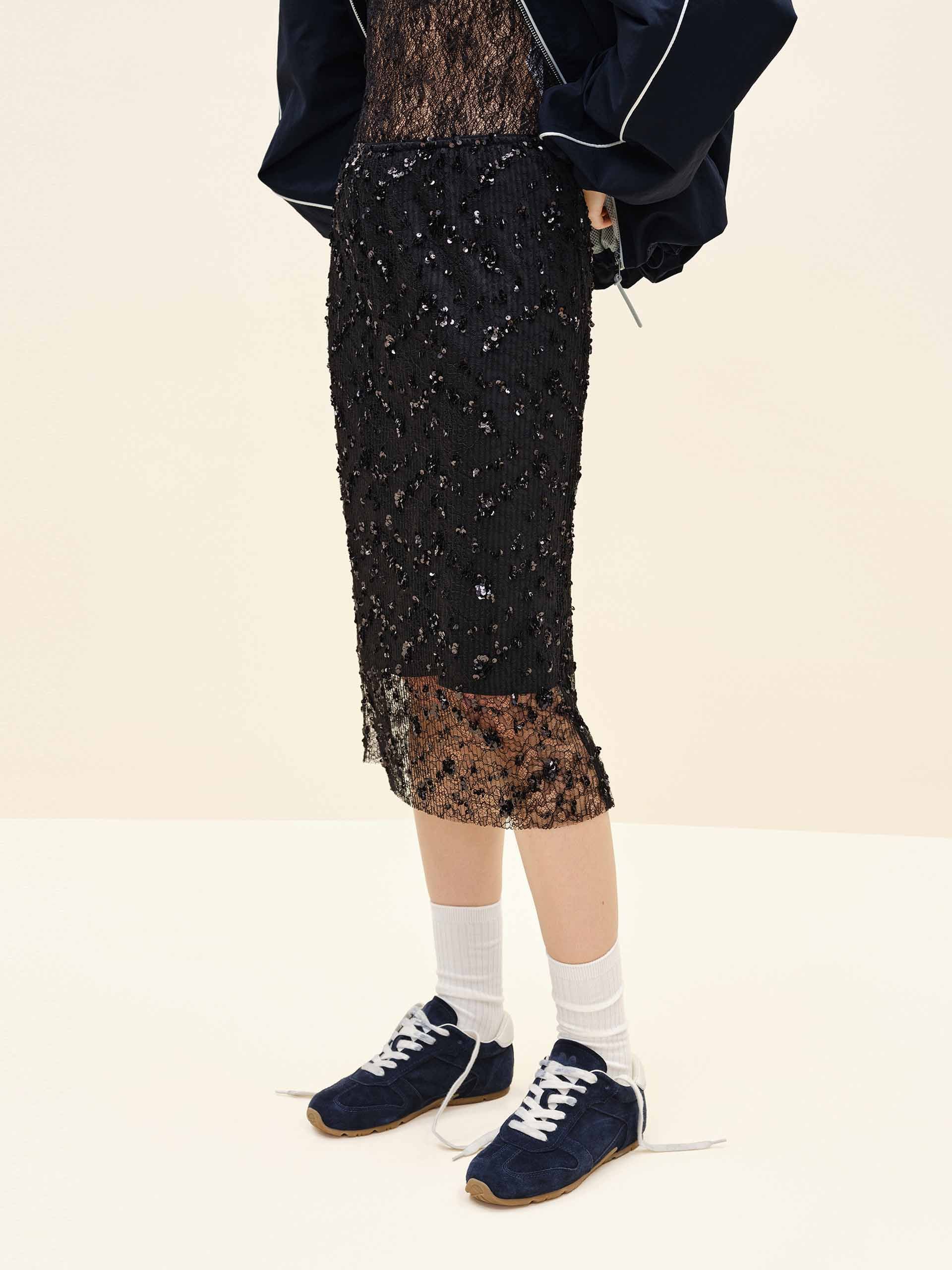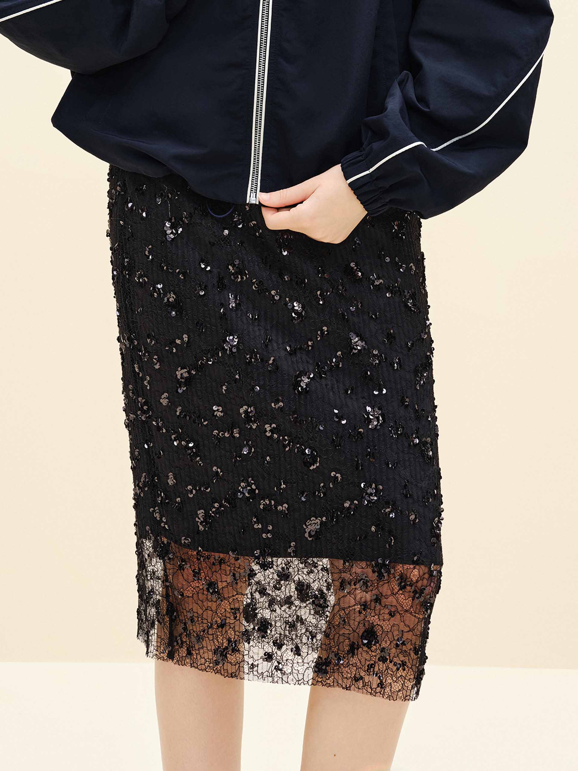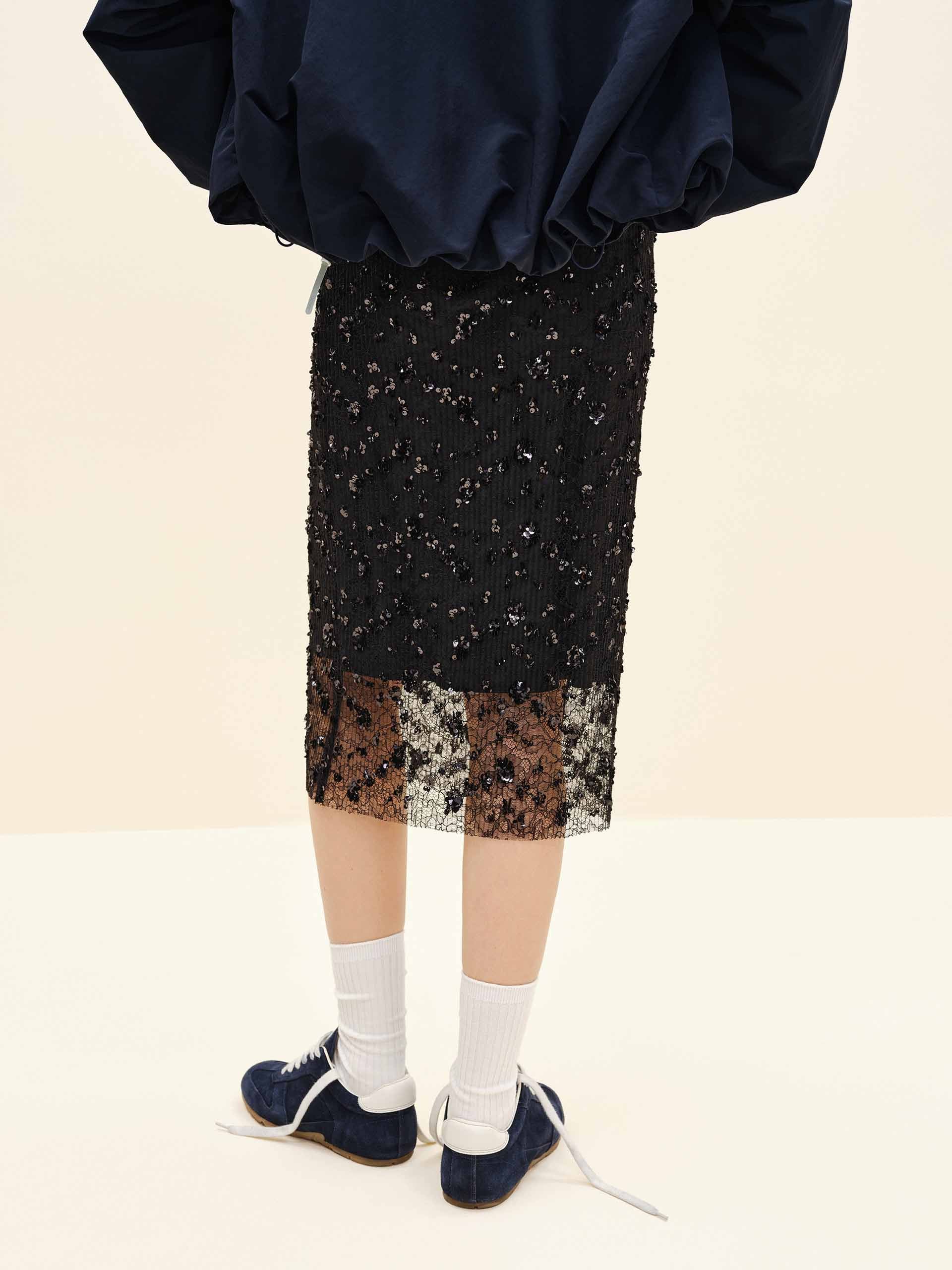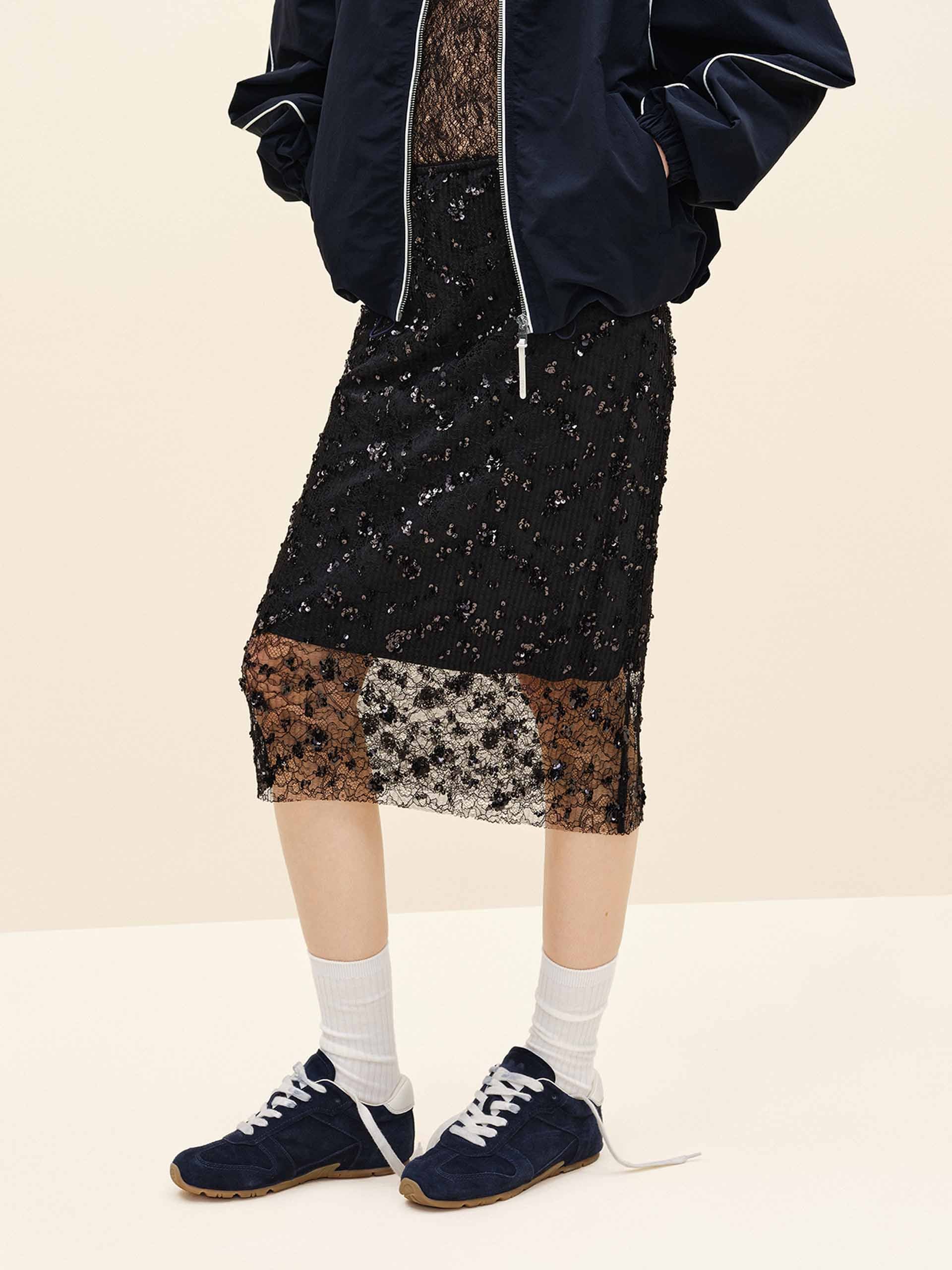 這款高腰設計裙裝能拉長身形線條,精緻蕾絲拼接增添浪漫質感,滿版亮片面料確保每一步都閃耀奪目。光滑內裡提供舒適與遮蓋度,特別適合特殊場合穿著。