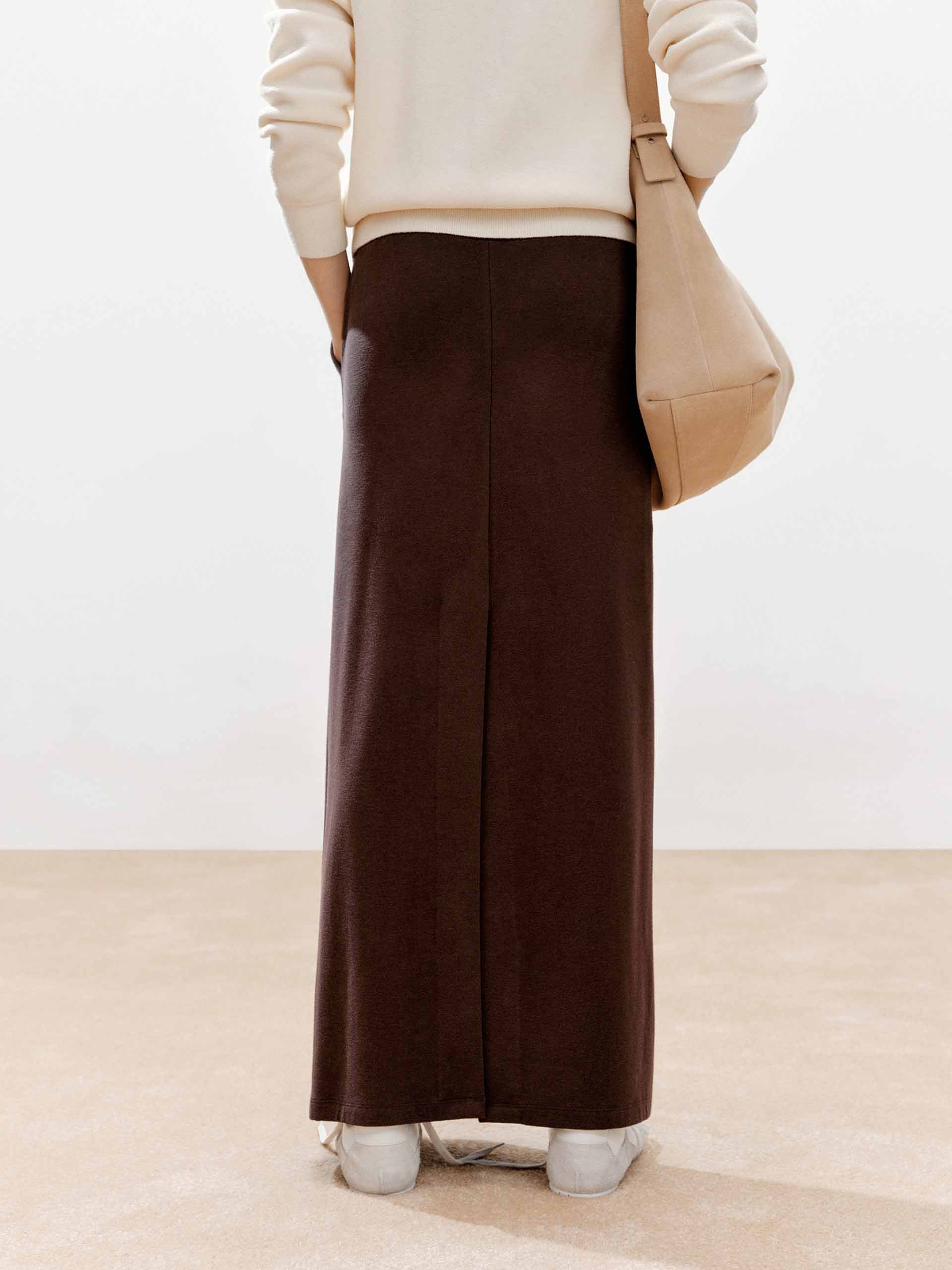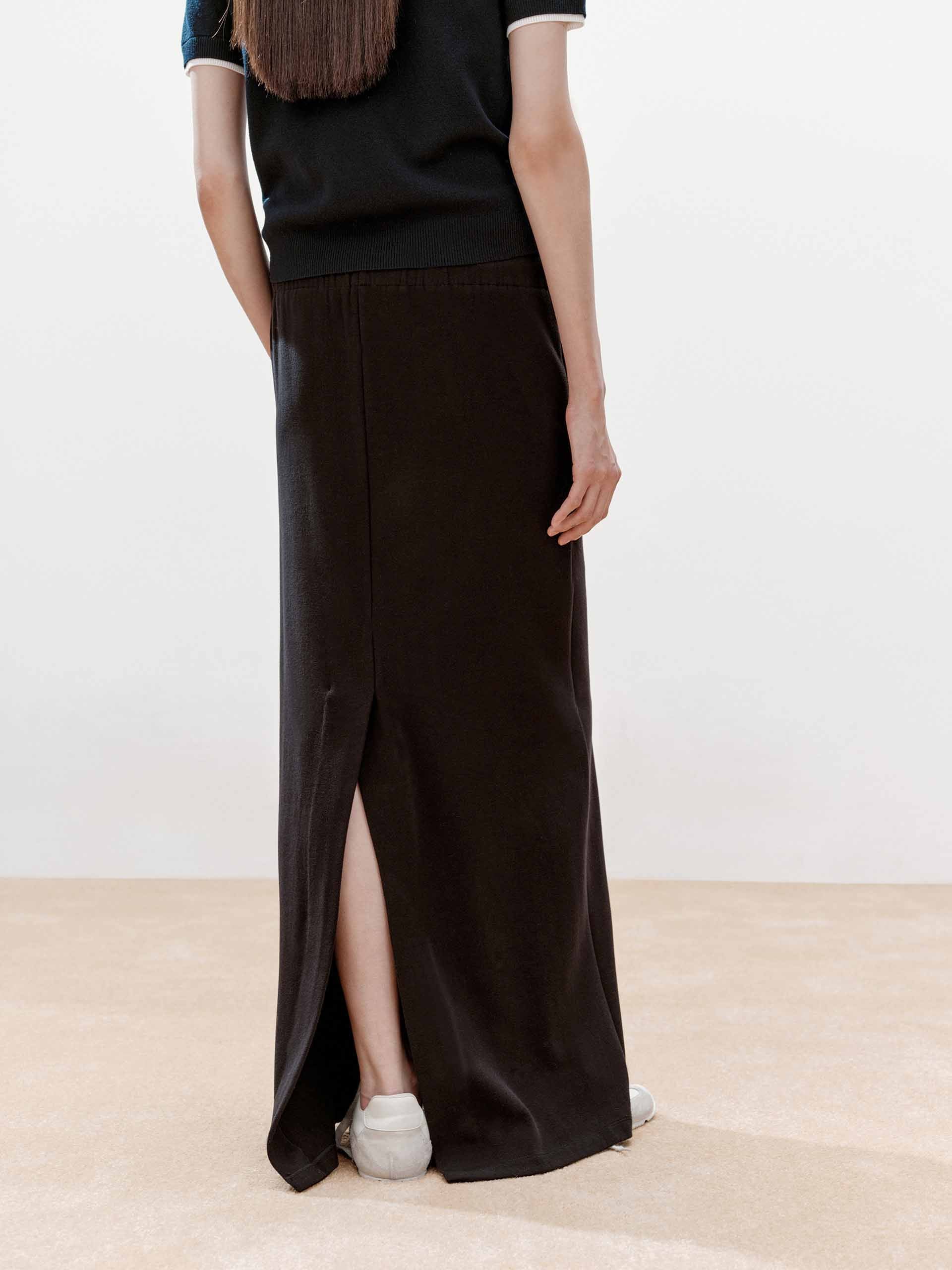 - 後開衩和層次拼接腰頭設計