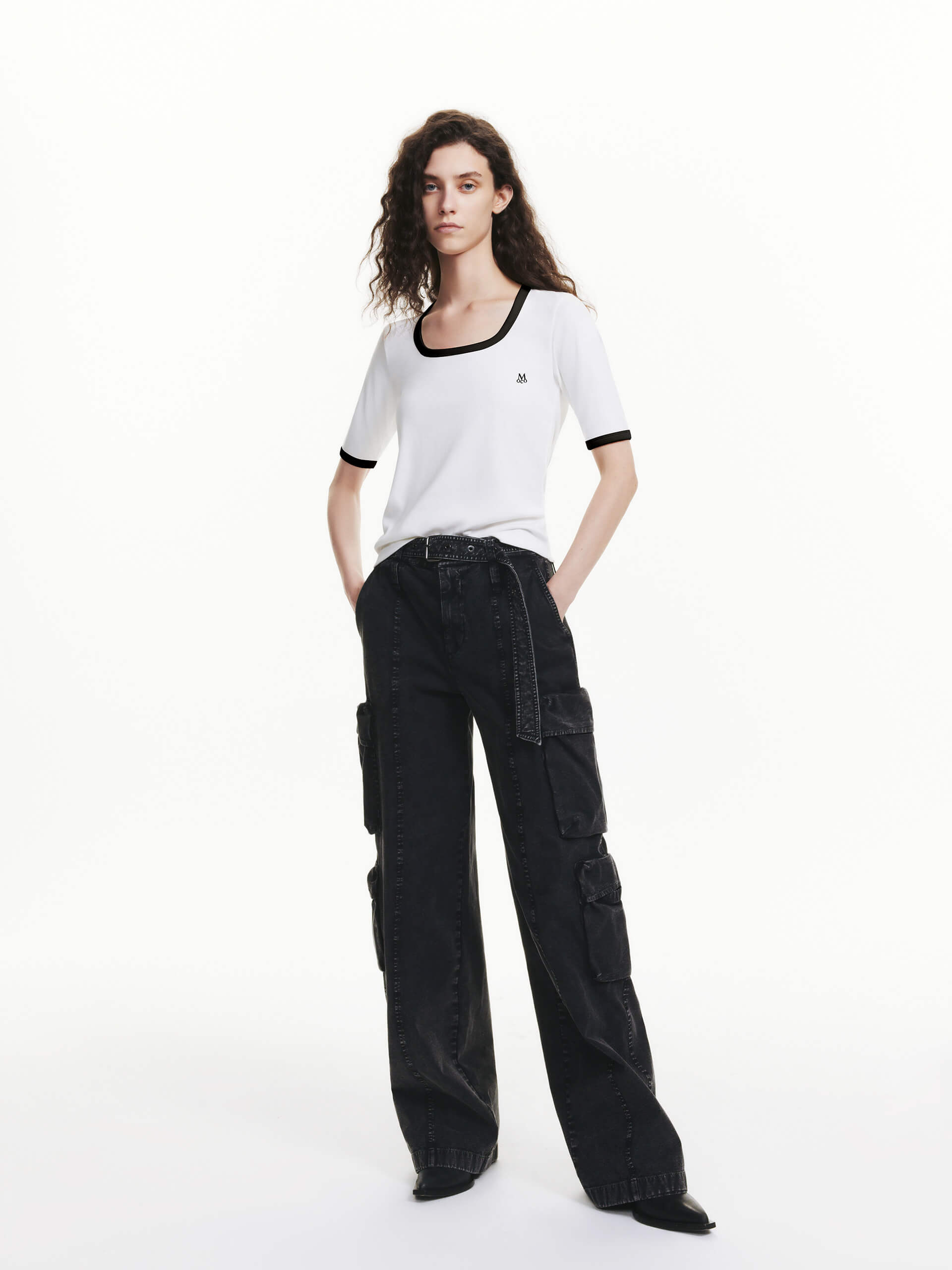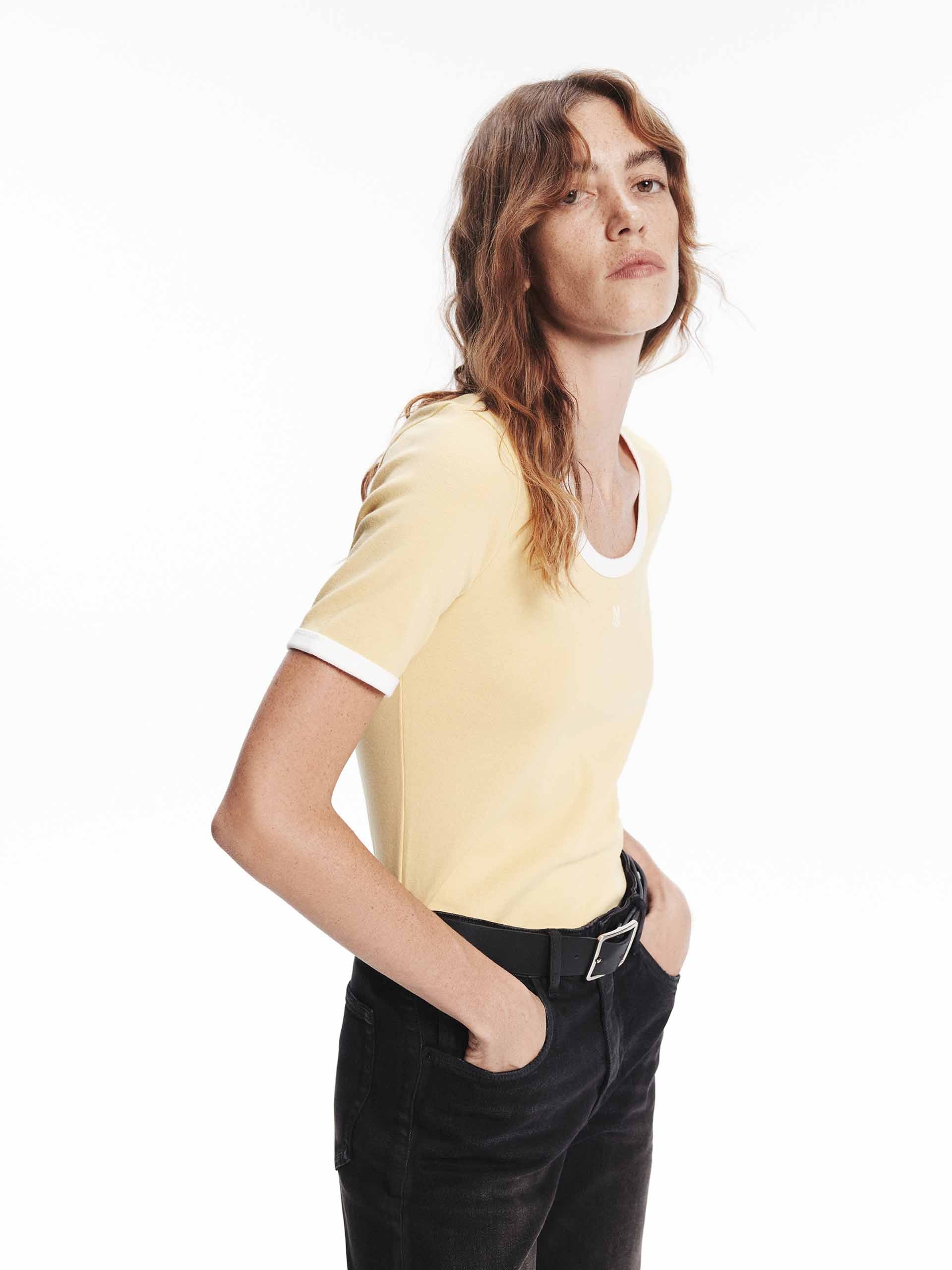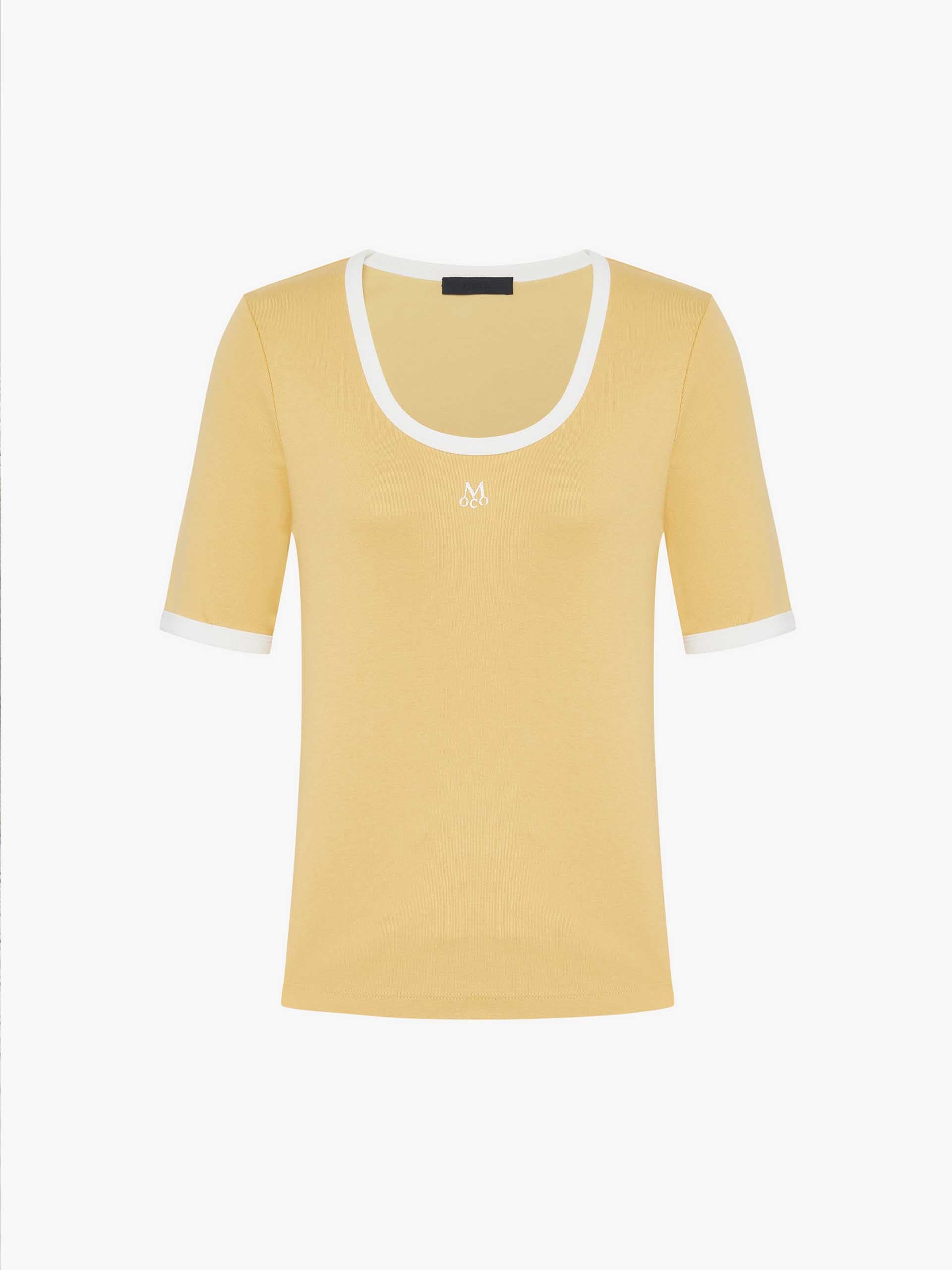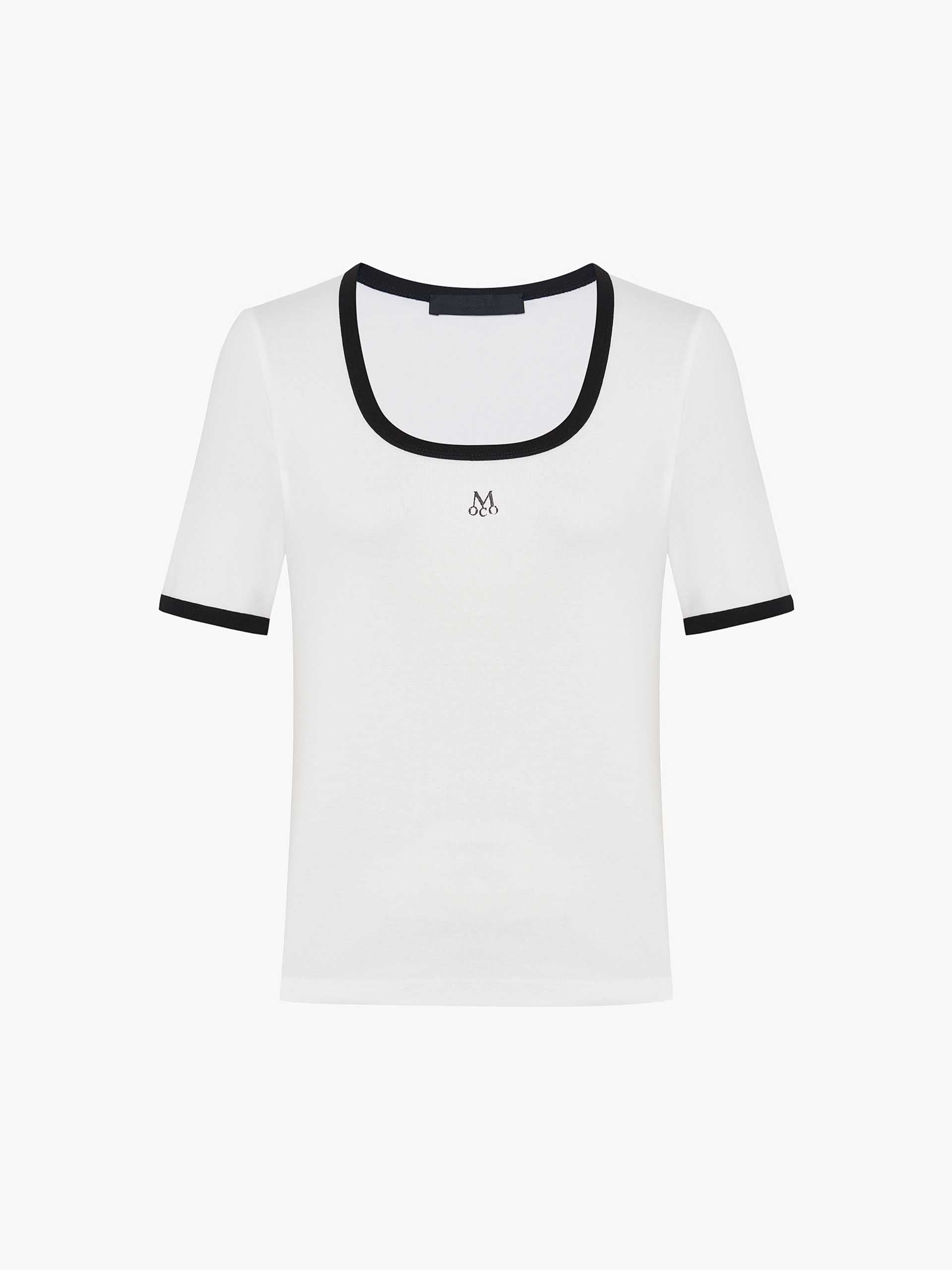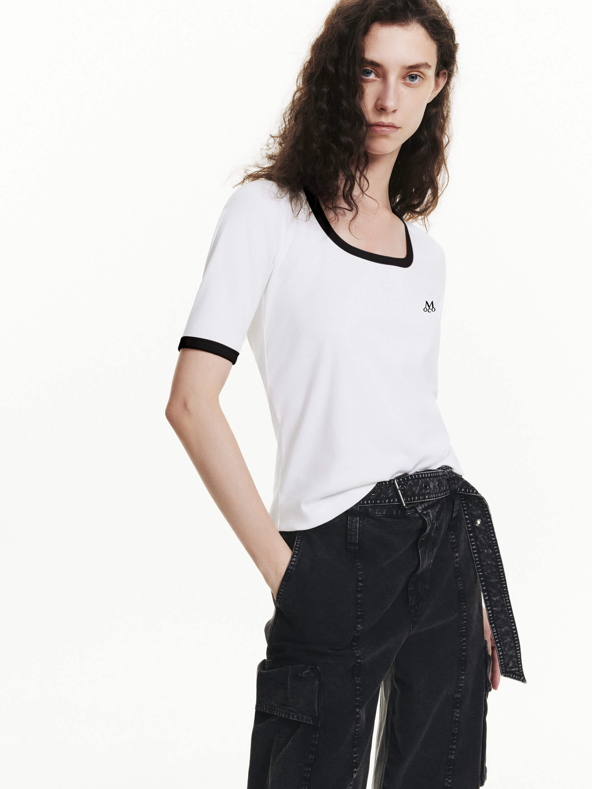 這款T恤採用舒適的棉混紡面料,U型領口和醒目的對比飾邊設計。合身剪裁提供現代修身的輪廓。