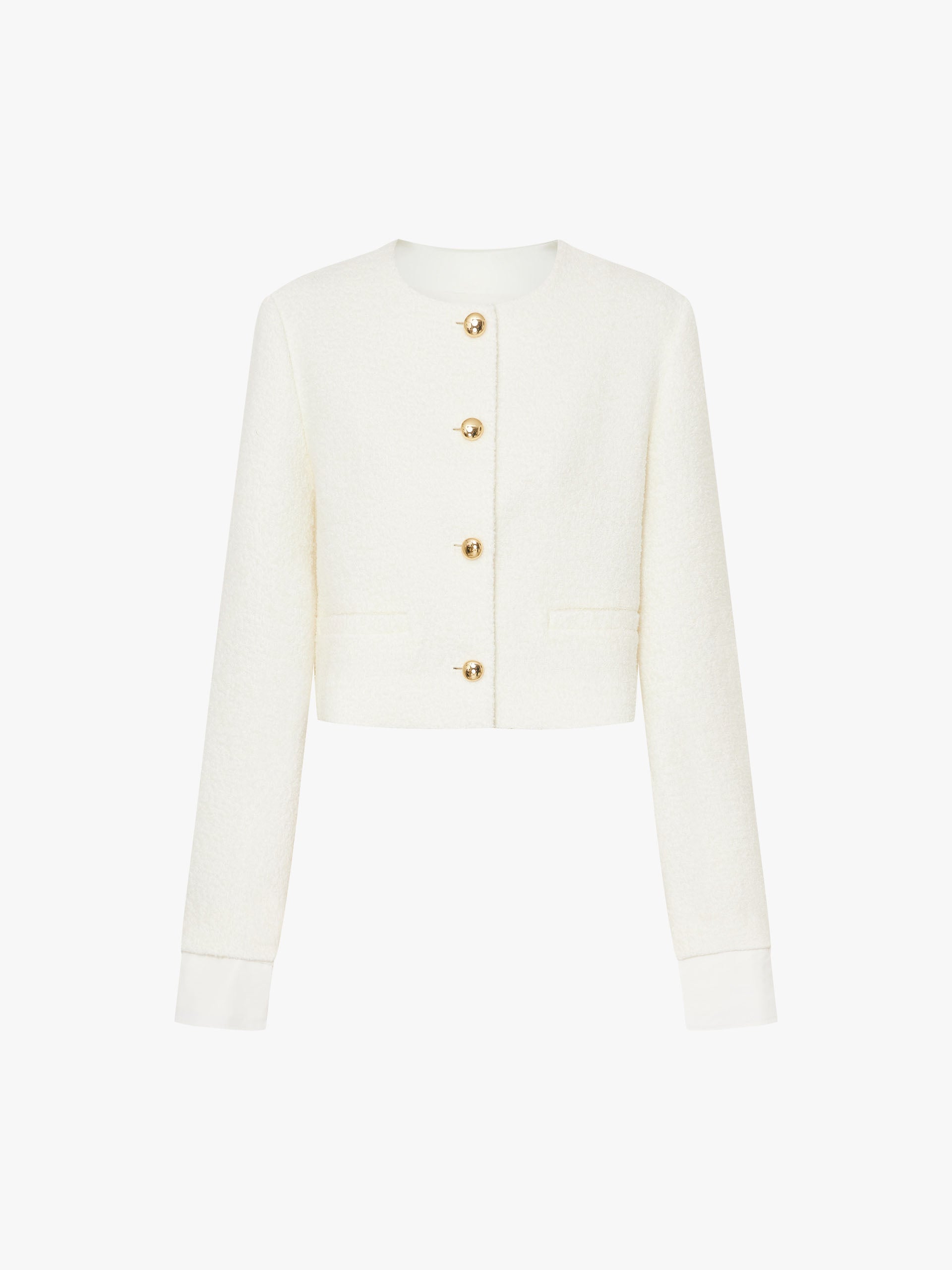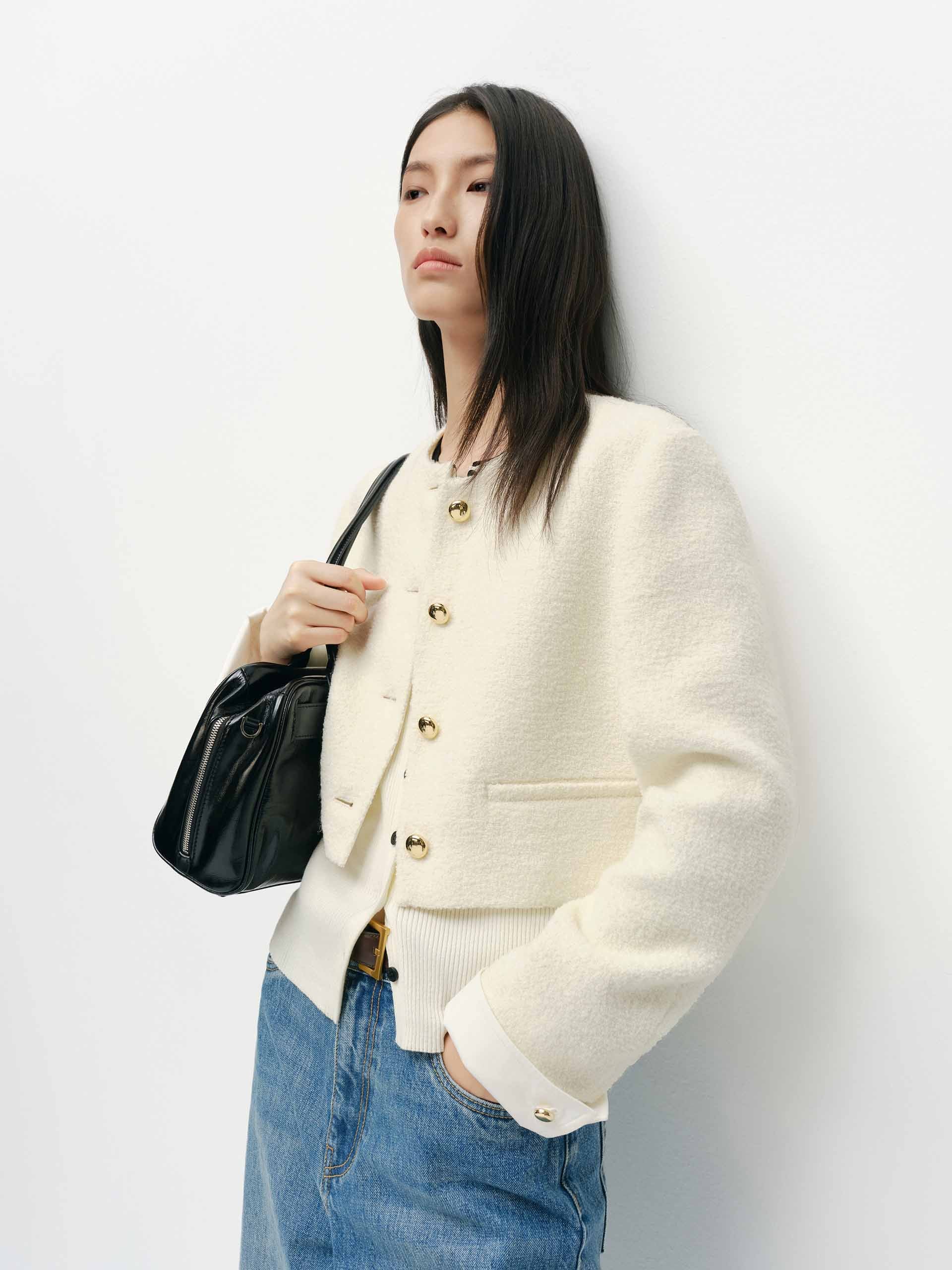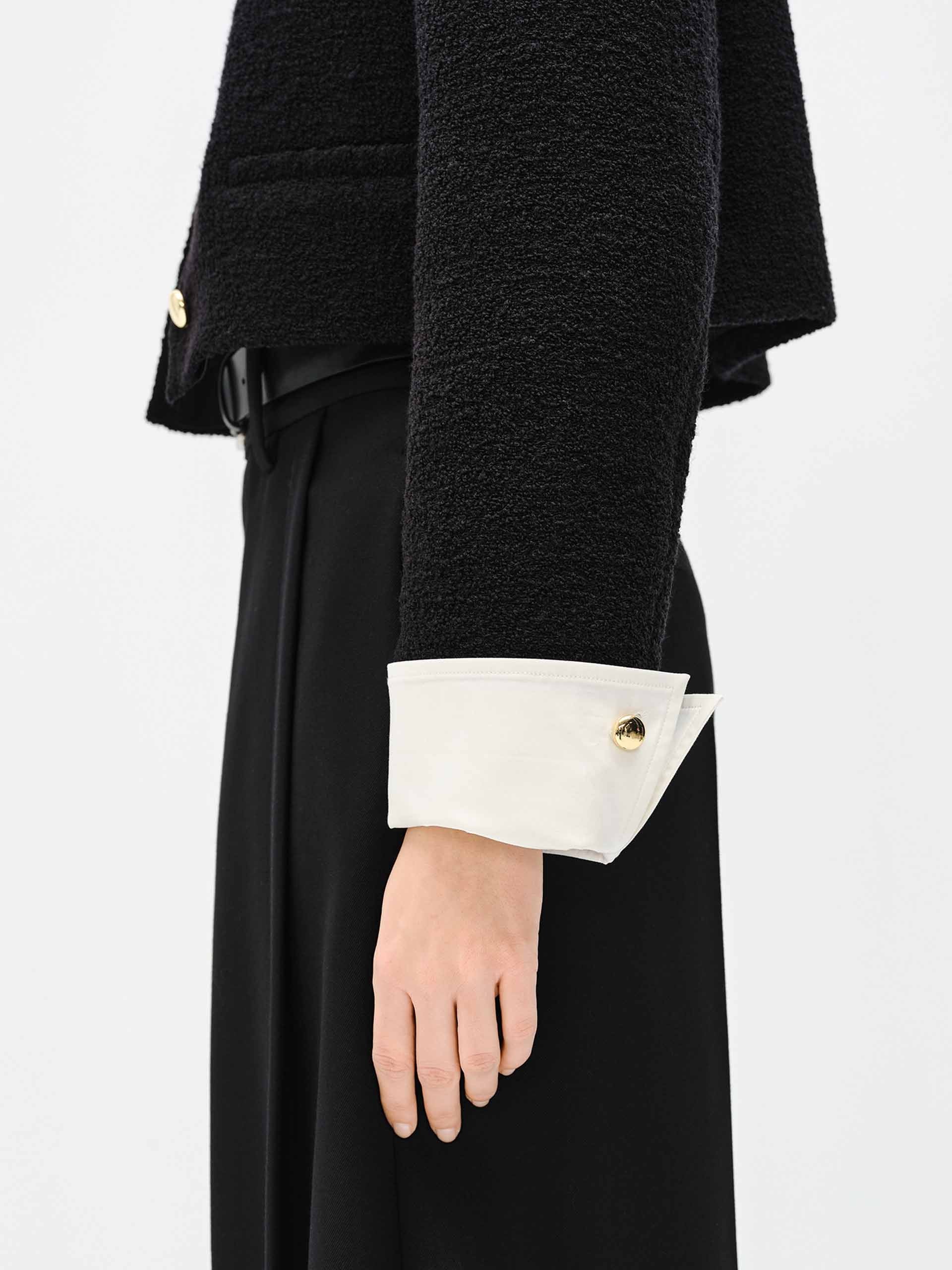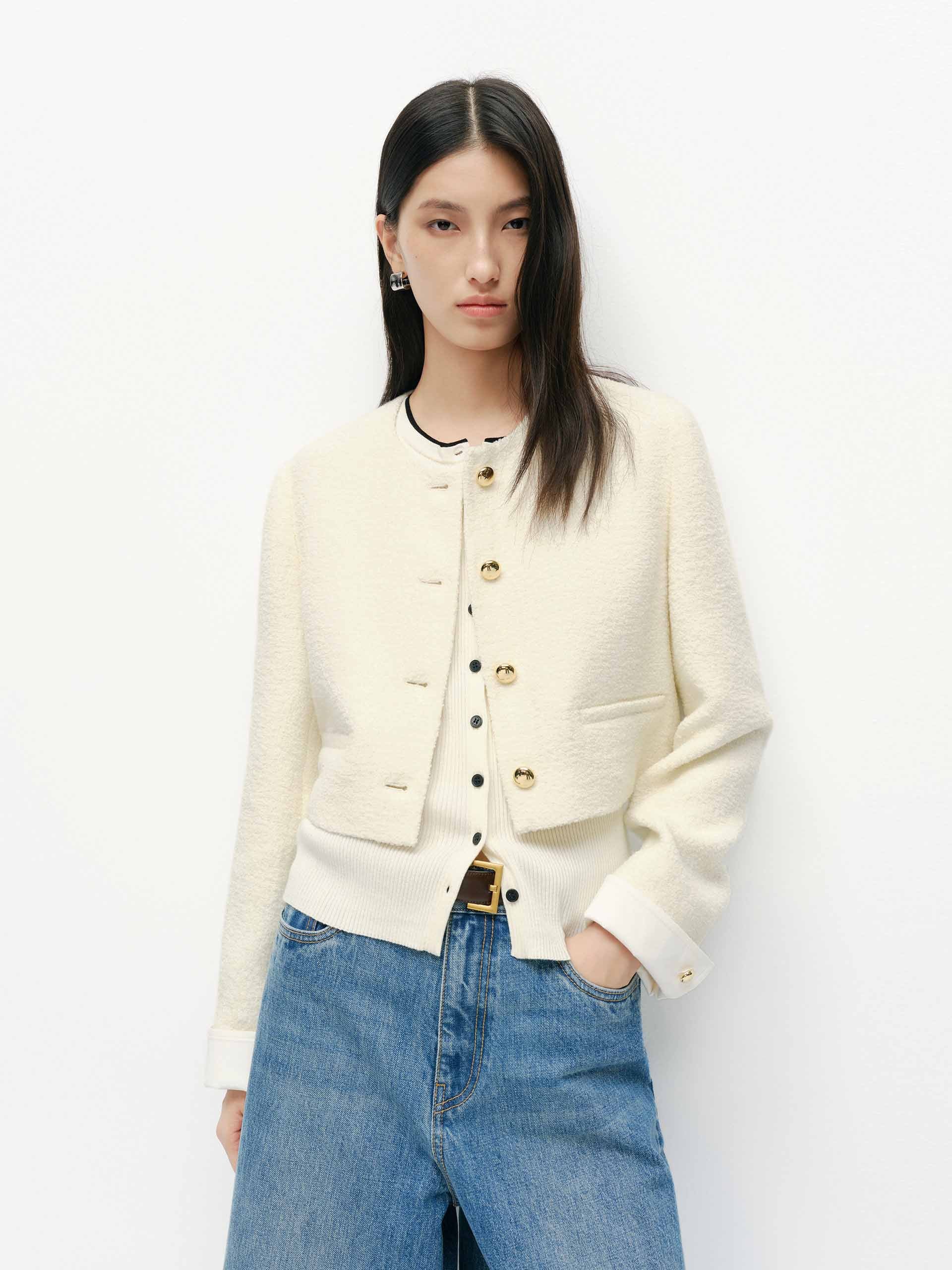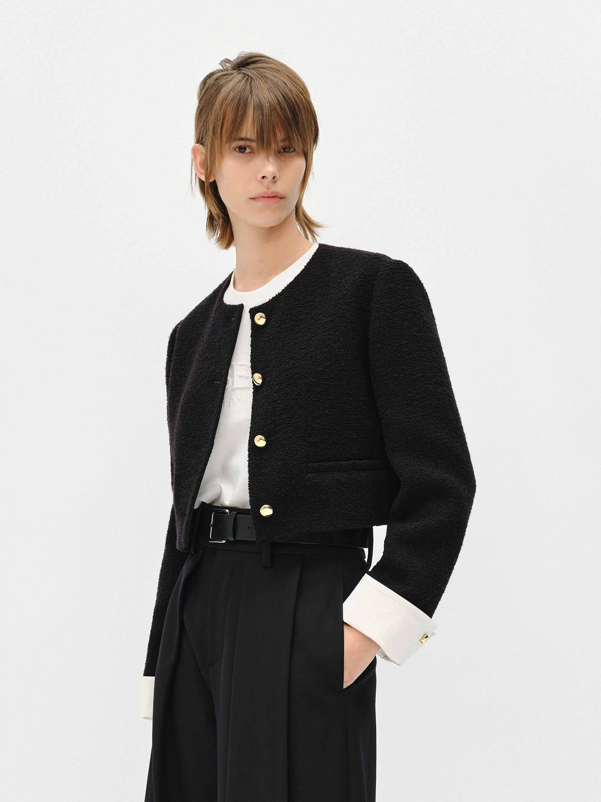 這款外套專為過渡季節設計,採用高品質羊毛和棉混紡,帶有獨特的粗花呢紋理和時尚的金屬鈕扣閉合。短款設計和拼接袖口為任何造型增添了一絲精緻感。