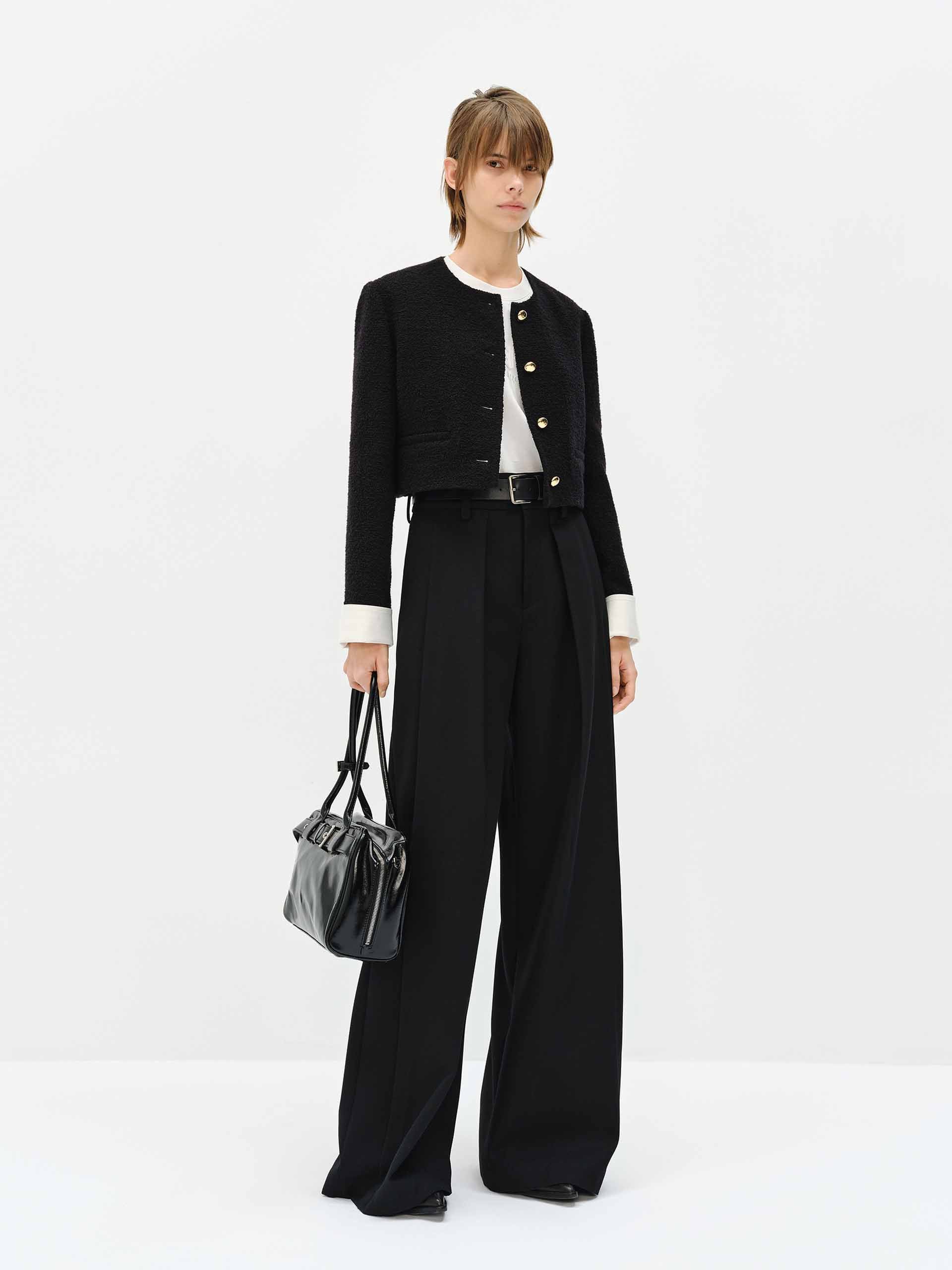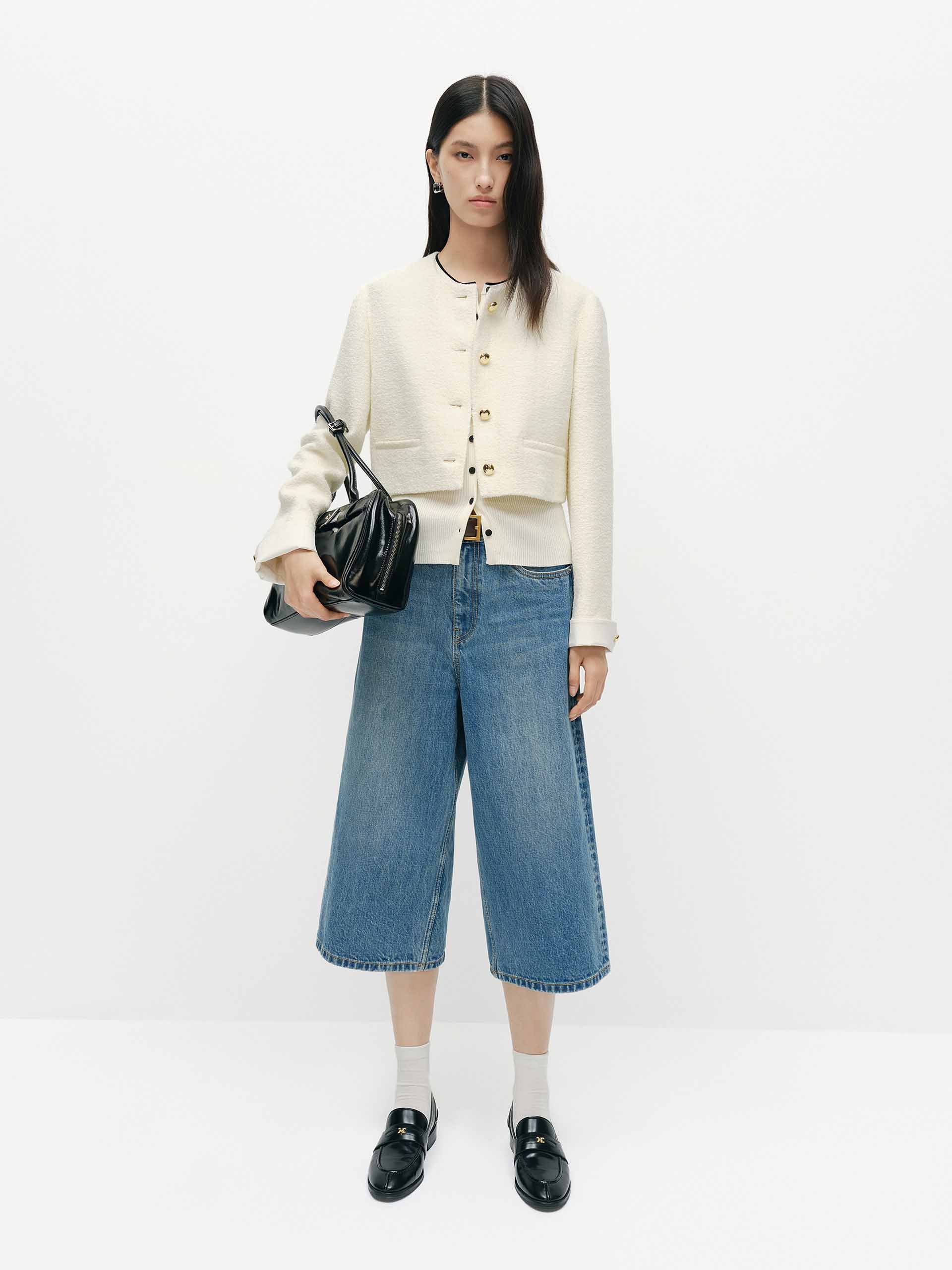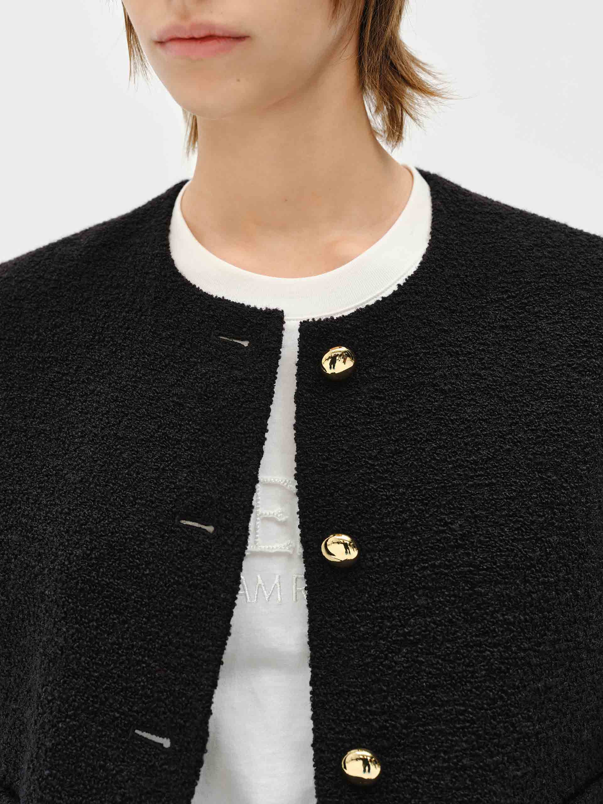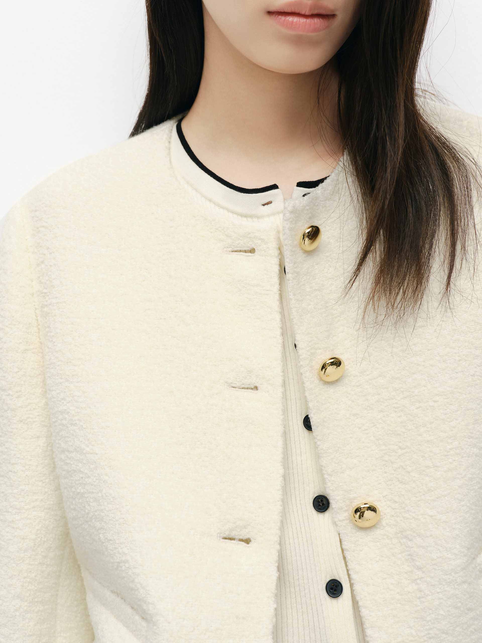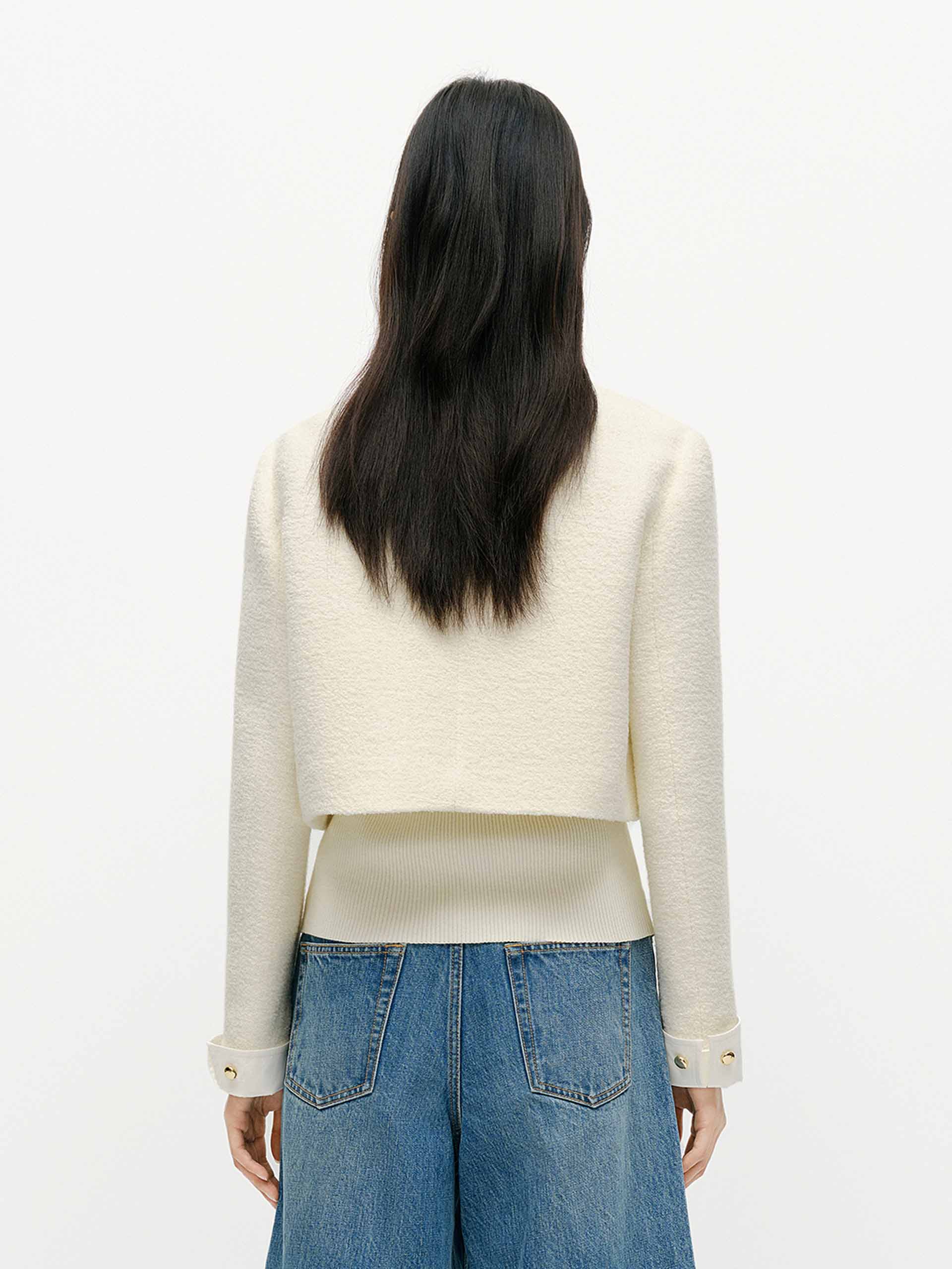這款外套專為過渡季節設計,採用高品質羊毛和棉混紡,帶有獨特的粗花呢紋理和時尚的金屬鈕扣閉合。短款設計和拼接袖口為任何造型增添了一絲精緻感。