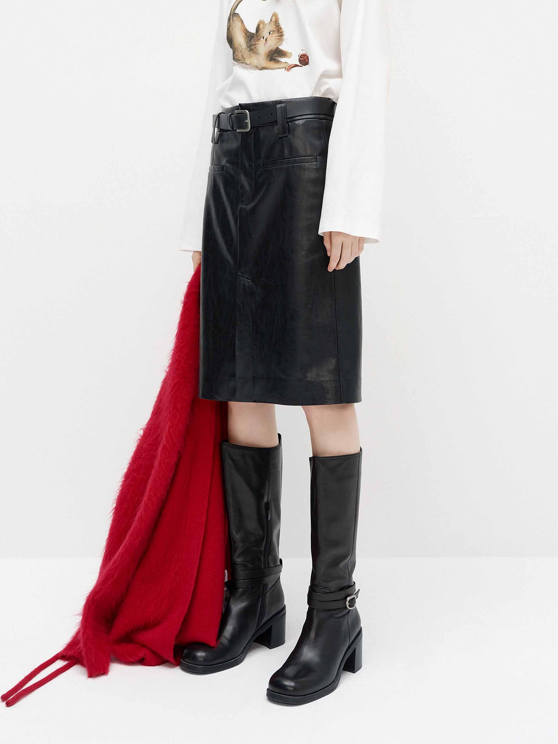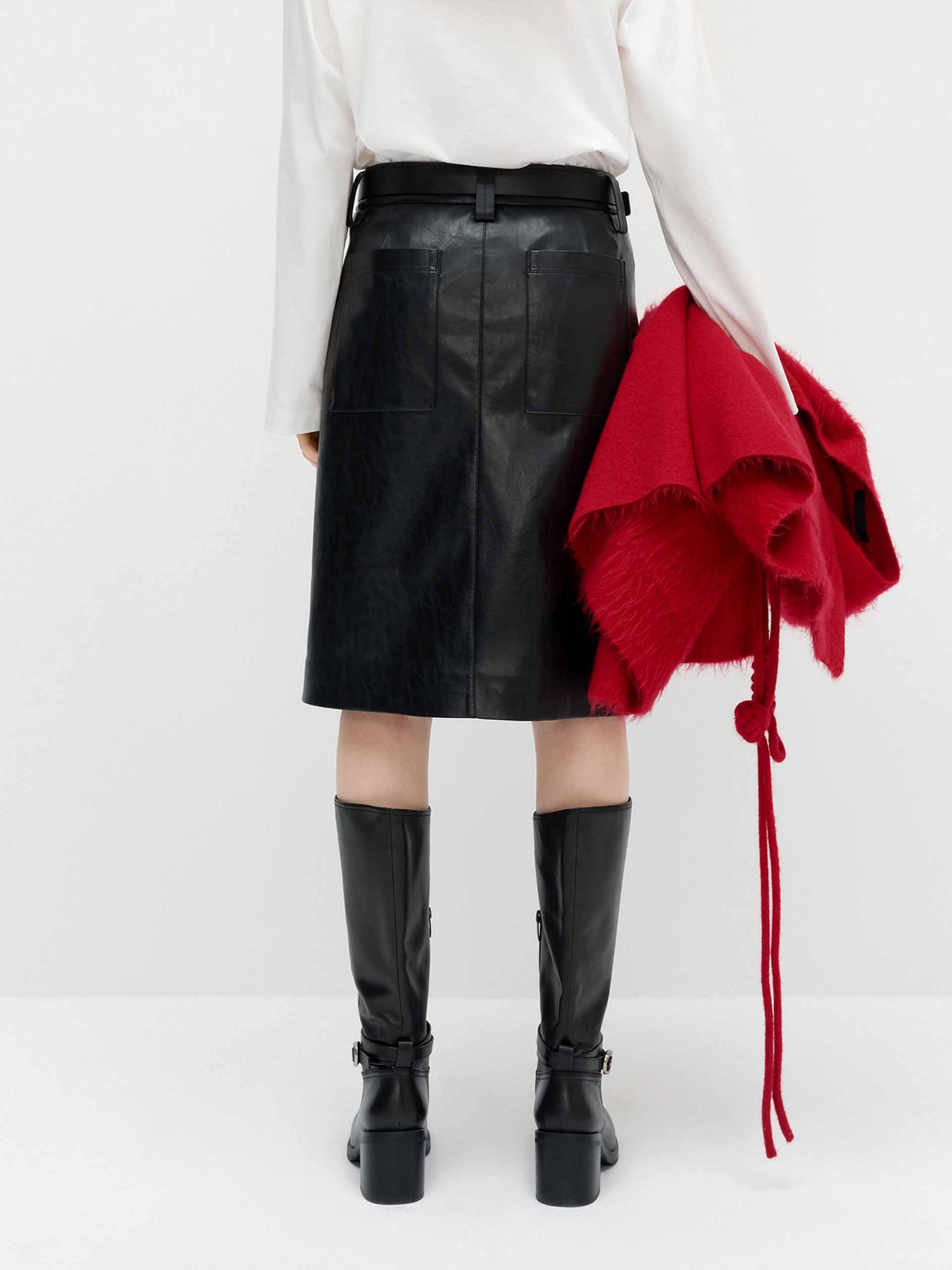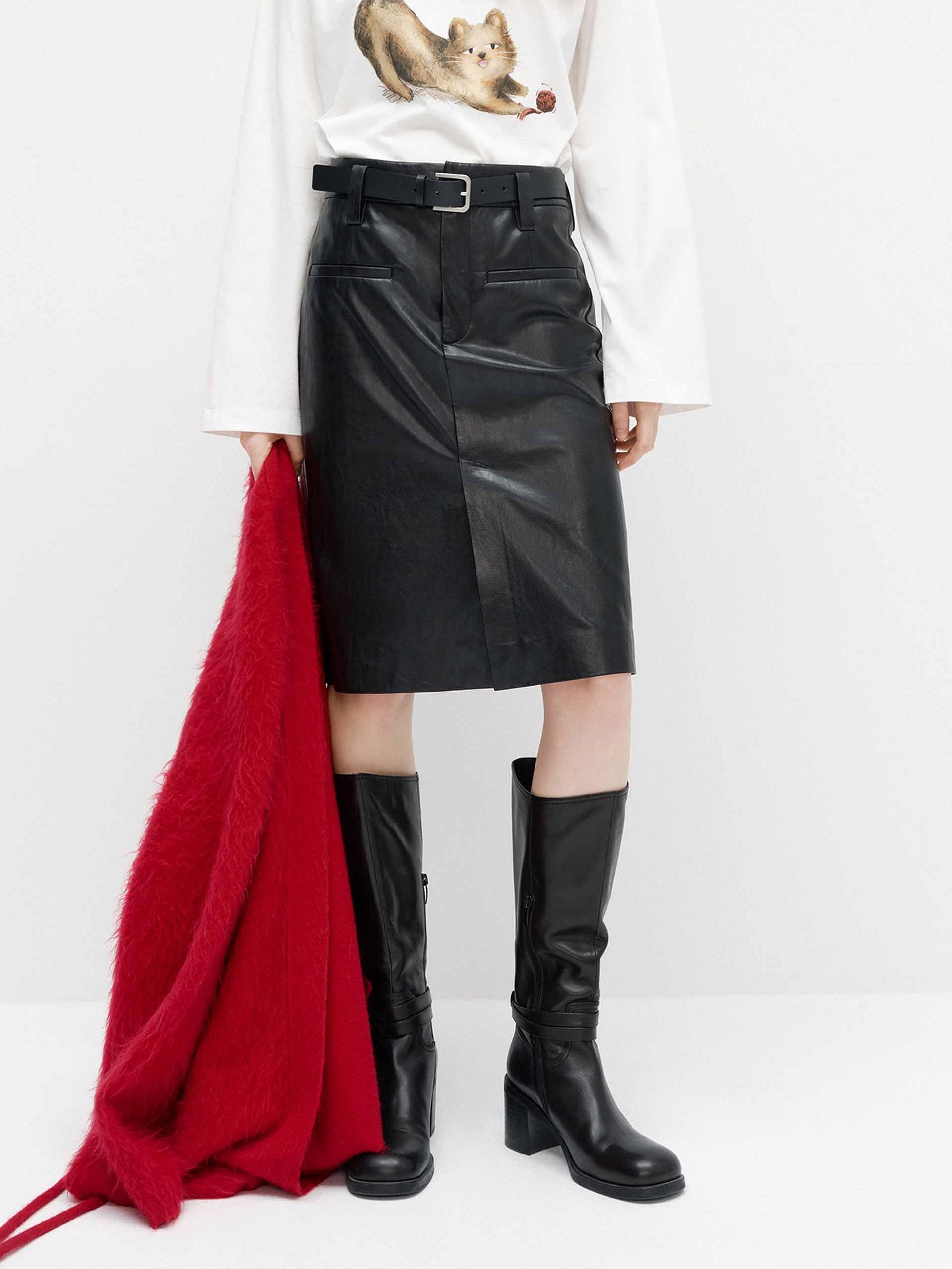 這款裙子採用柔軟的人造皮革製作,具有時尚的前開衩設計。修身的直筒輪廓,搭配皮革靴子,展現時尚造型。