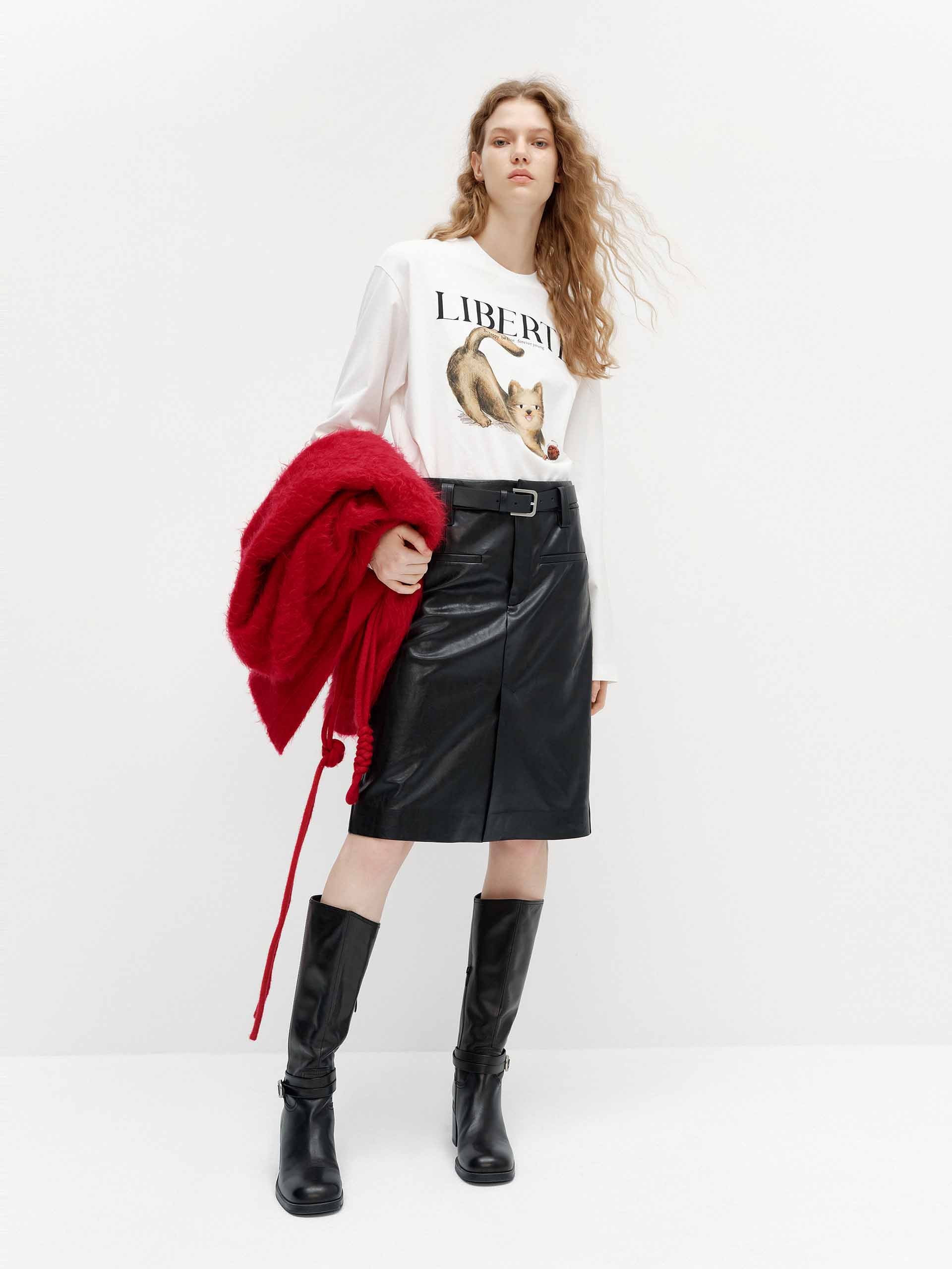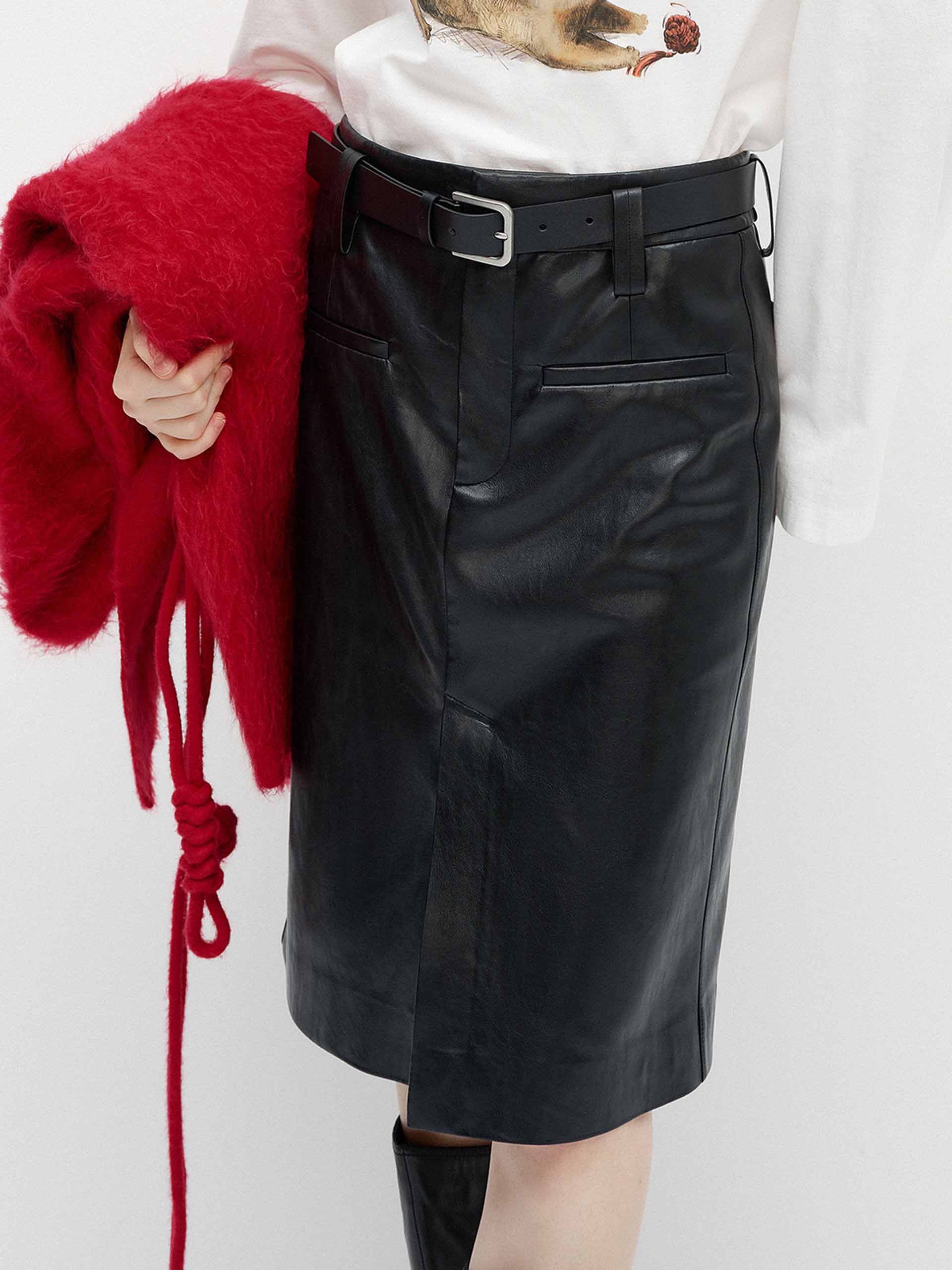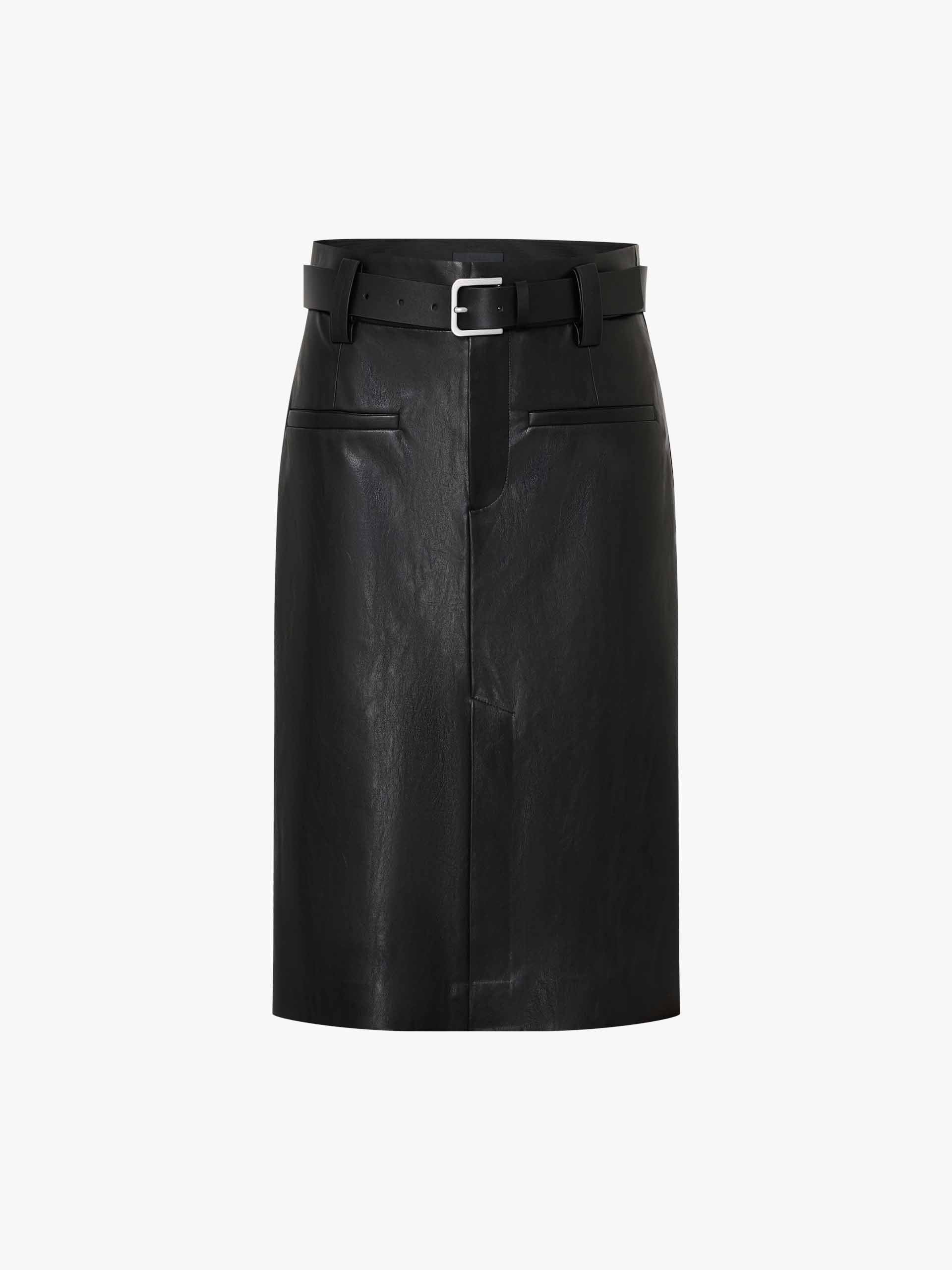 這款裙子採用柔軟的人造皮革製作,具有時尚的前開衩設計。修身的直筒輪廓,搭配皮革靴子,展現時尚造型。