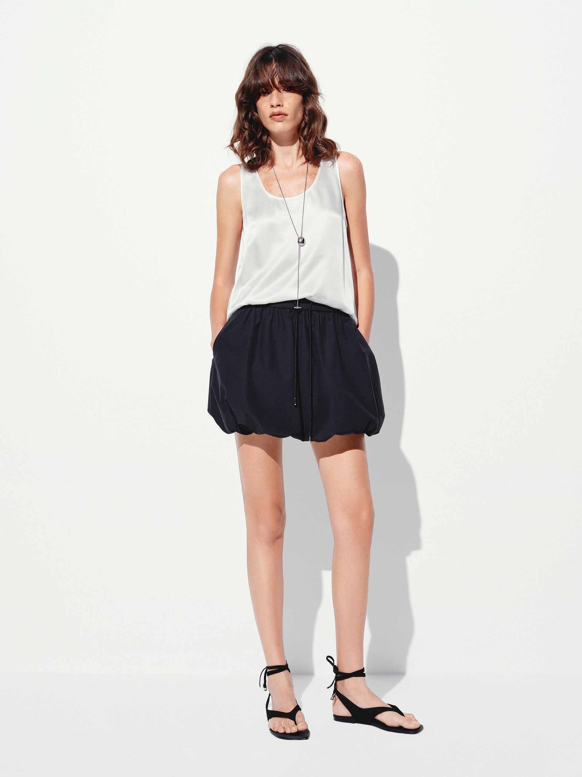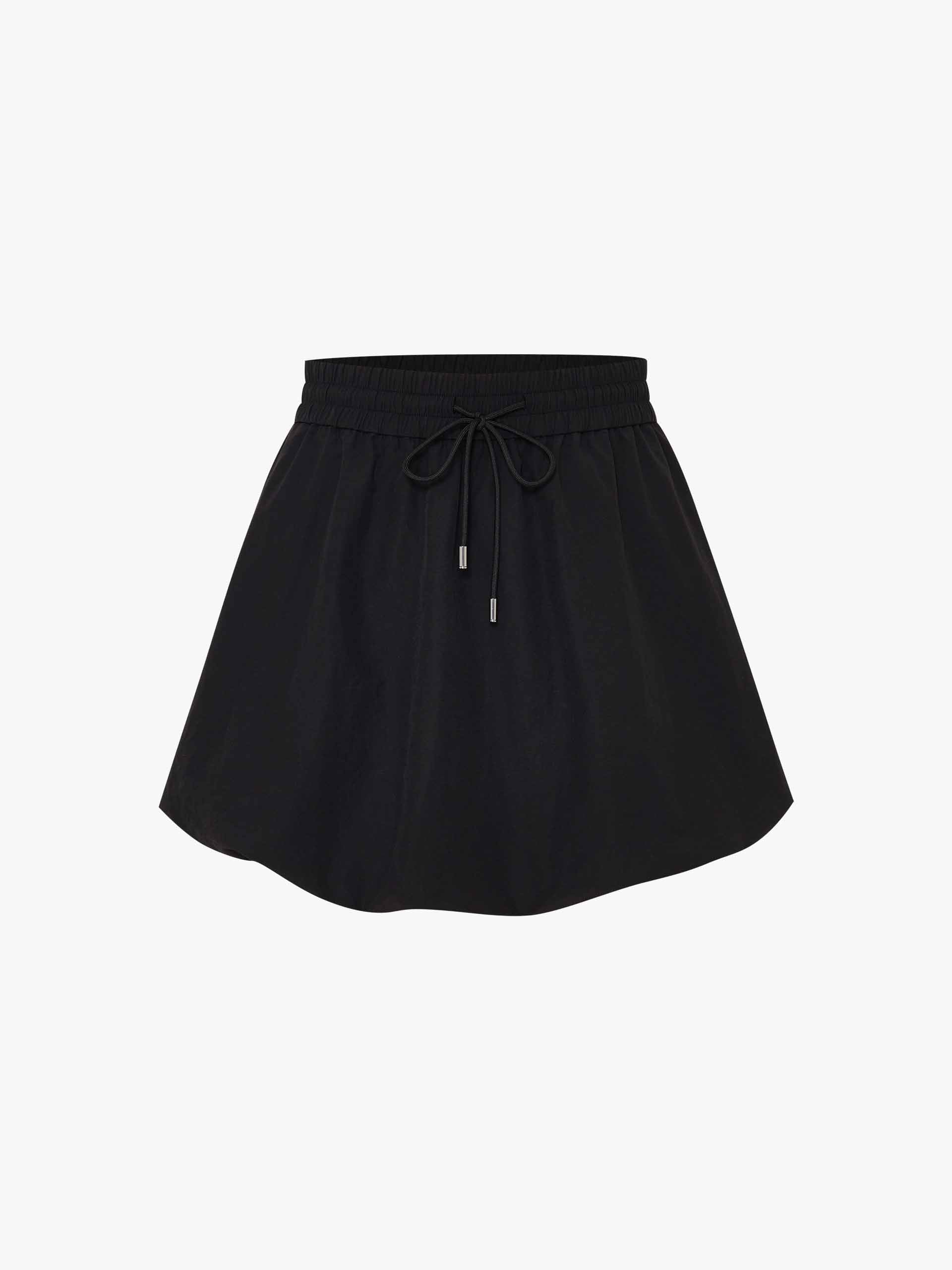 夏日專屬抽繩短裙,輕量面料與可調節腰圍確保舒適度,荷葉邊下襬與側口袋增添俏皮感。