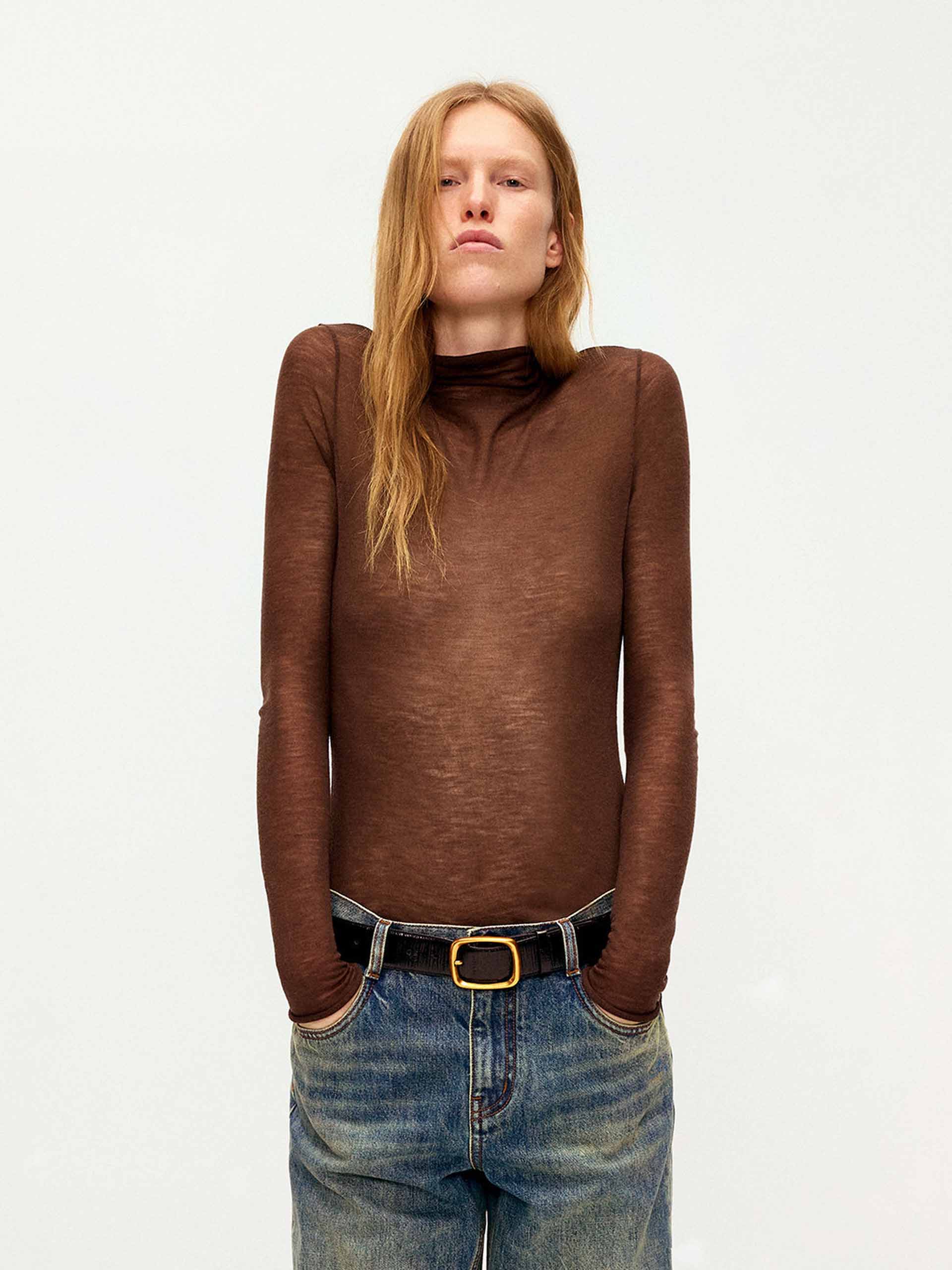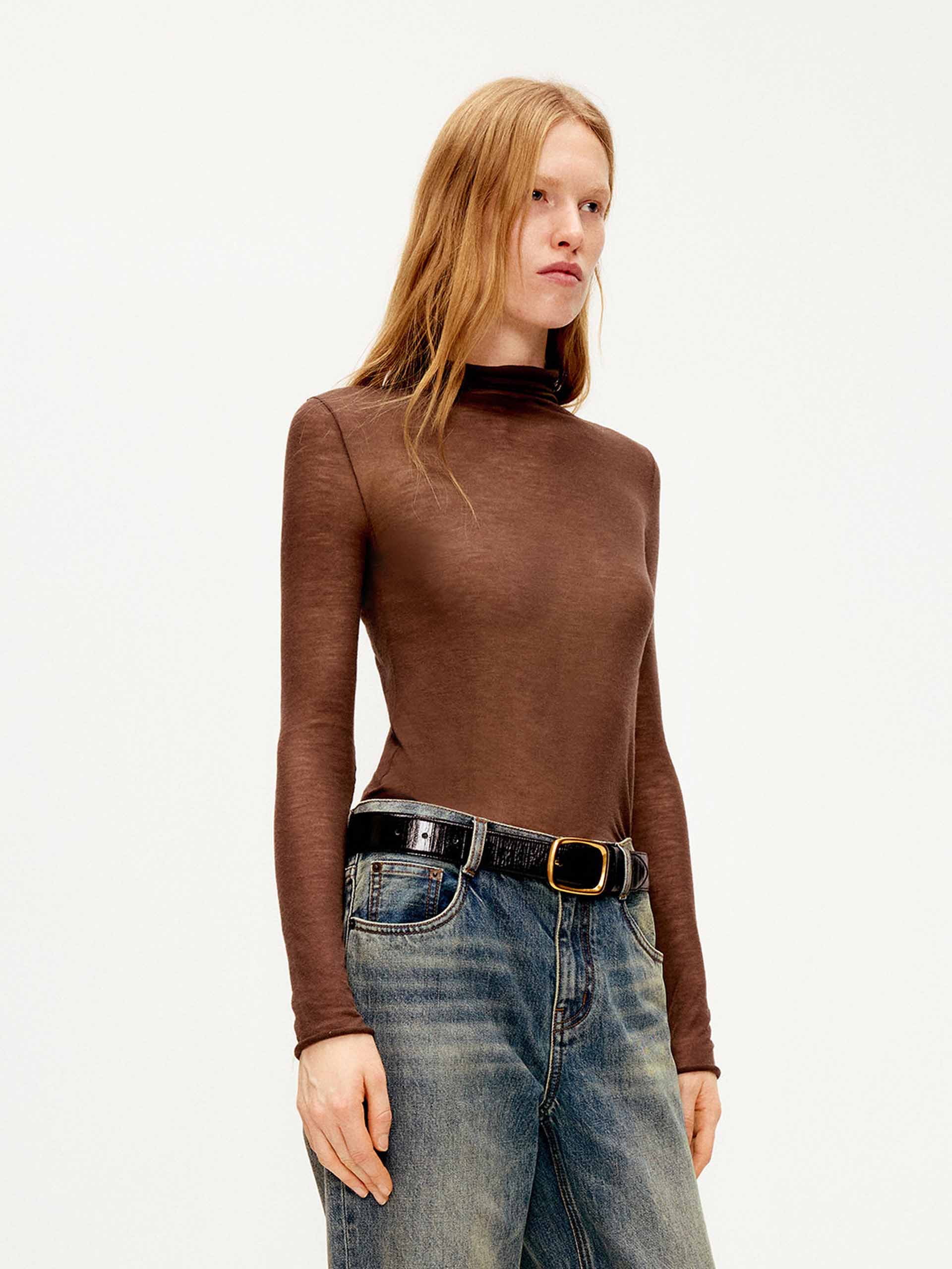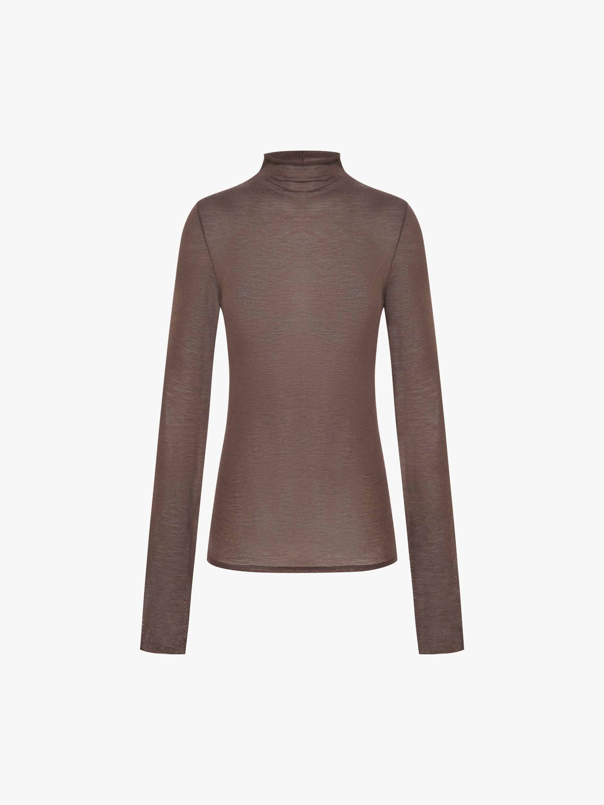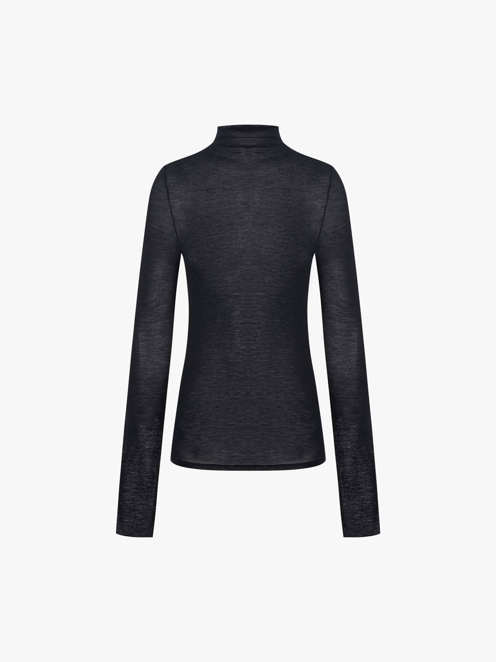 採用羊毛與羊絨的奢華混紡面料製成,這款上衣提供俐落的修身版型,展現精緻、流線型的輪廓。優雅的高領配捲邊飾與獨特的金屬片細節,創造出摩登的雅緻感,而微妙的後中縫線確保了精美的合身剪裁。這款上衣巧妙結合了奢華的舒適感與永恆的設計,展現多樣化的優雅。