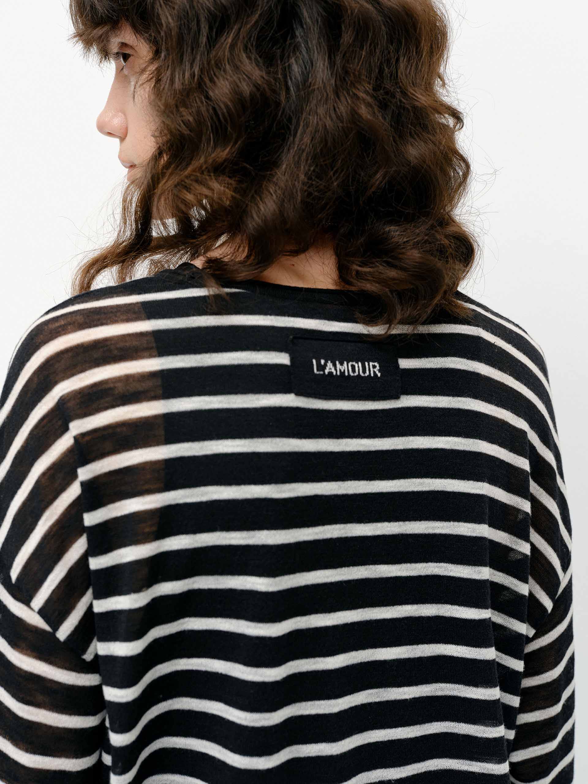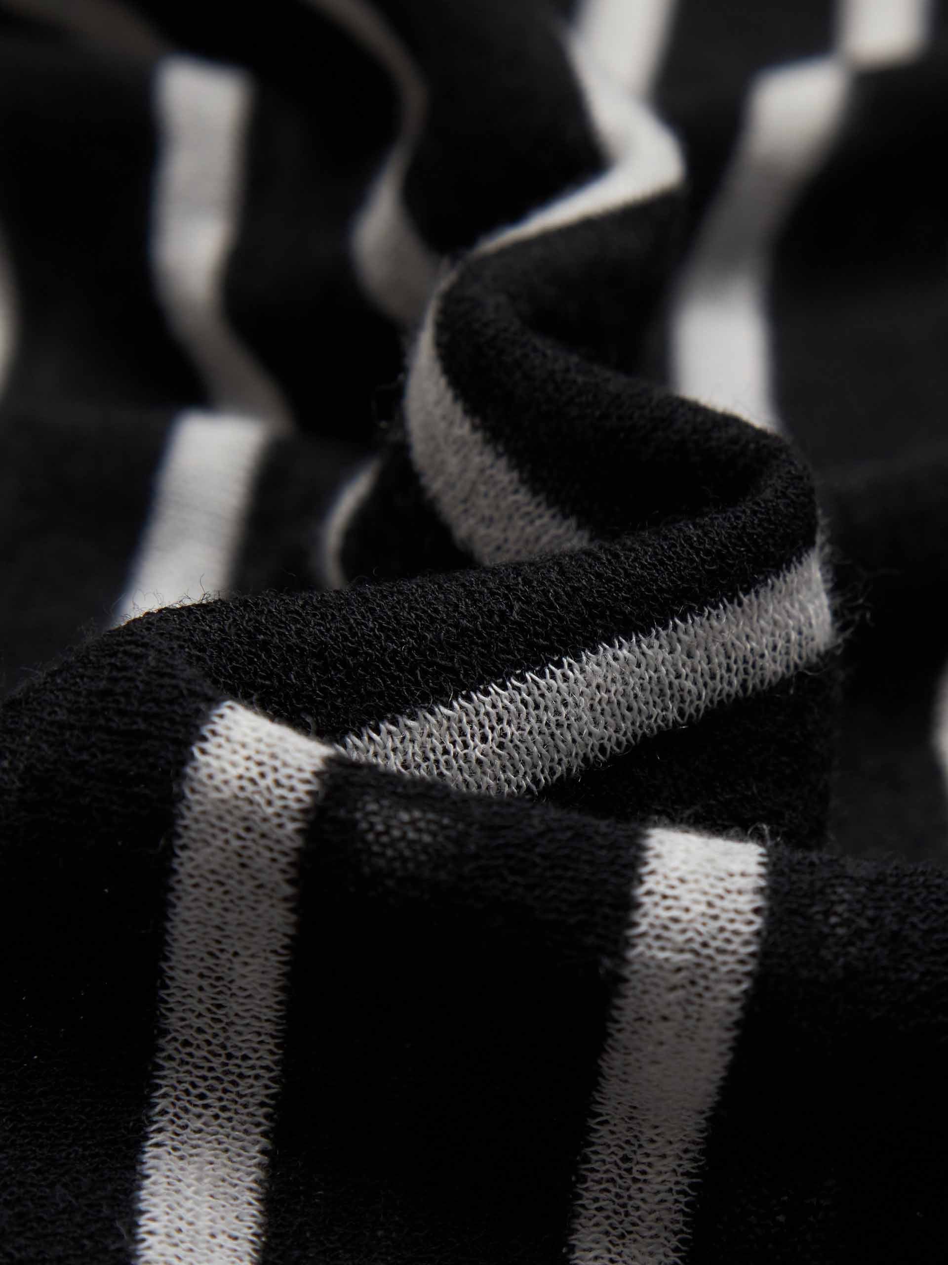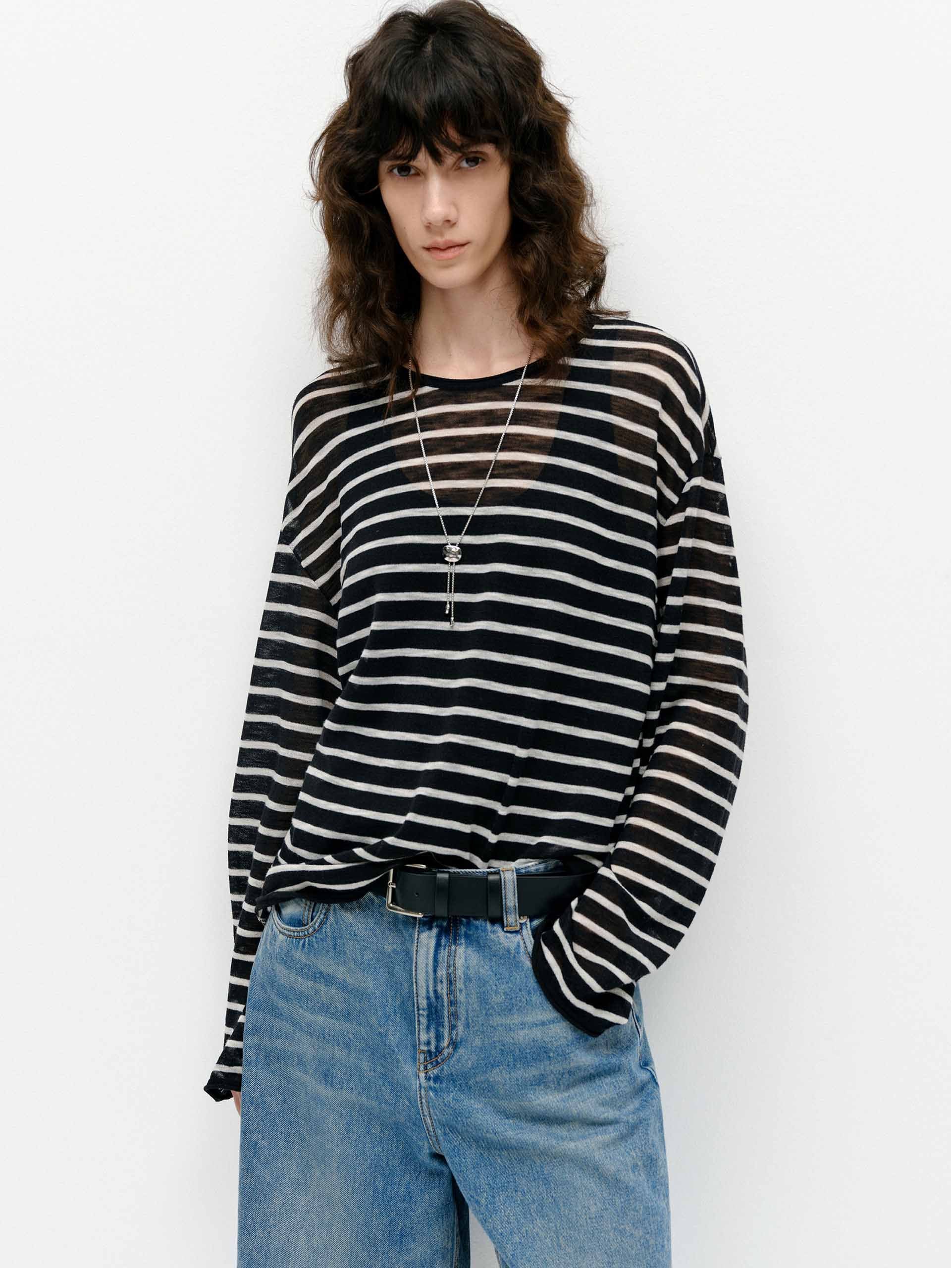 這款毛衣讓您體驗輕鬆的舒適與風格。採用柔軟的羊毛混紡面料製作,具有寬鬆剪裁、經典的黑白條紋和落肩設計。非常適合打造休閒時尚造型。