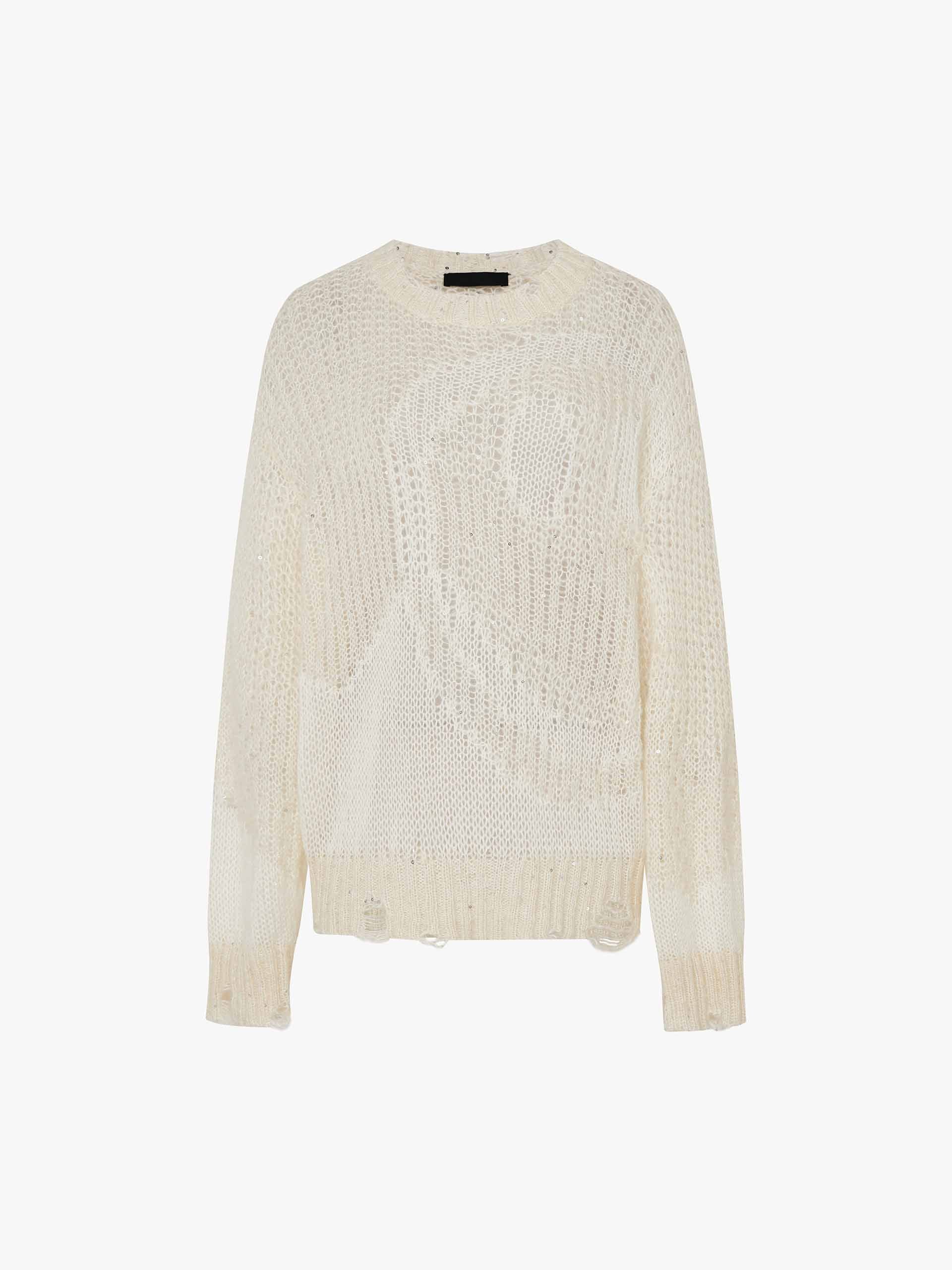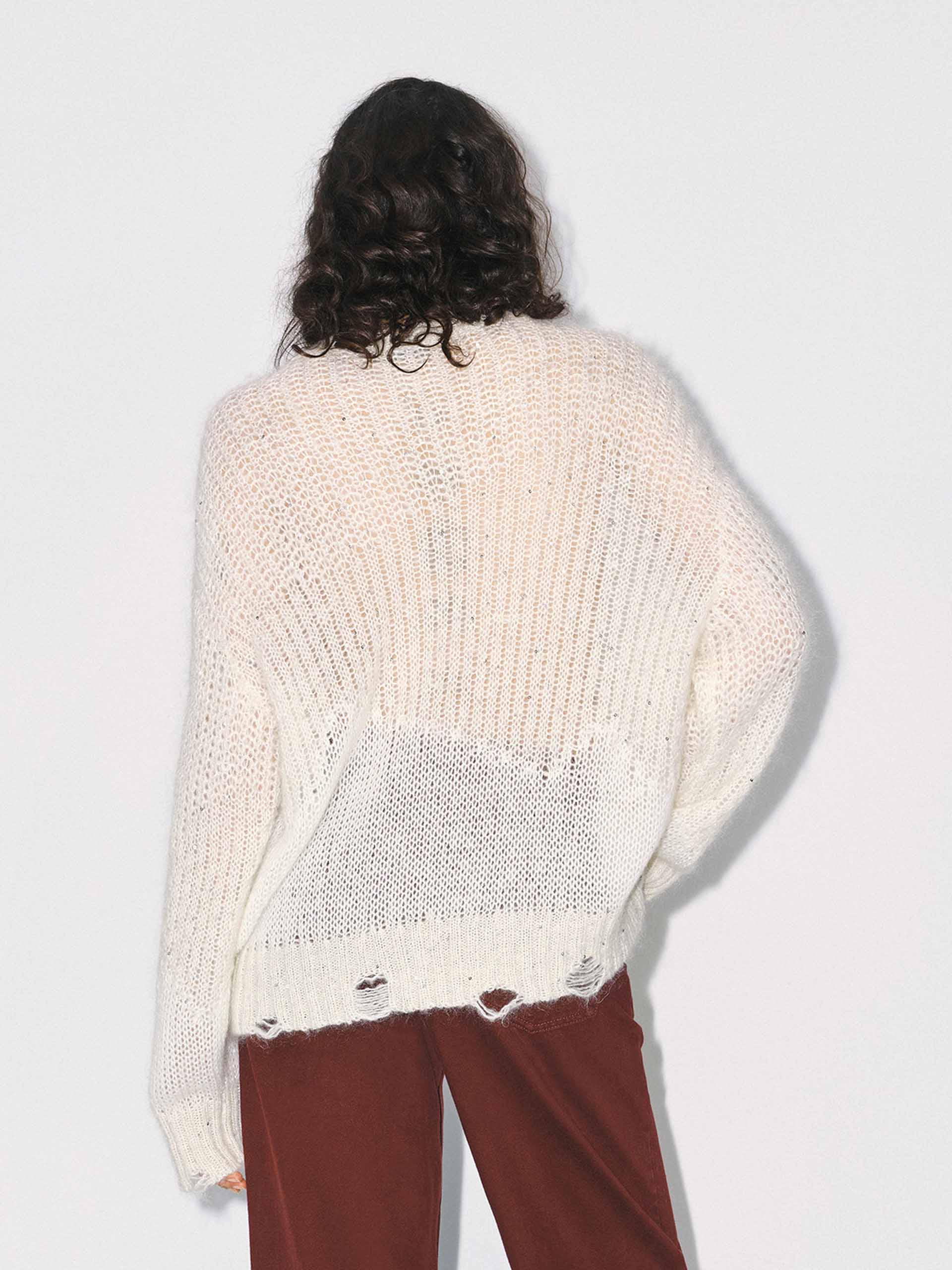 這件毛衣巧妙地融合了輕鬆舒適與耀眼魅力。經典的圓領搭配現代的破損細節,增添前衛時尚感。開針結構創造出輕盈且具紋理的美麗面料,而全身的亮片加工則捕捉光線,呈現真正令人驚豔的亮眼效果。