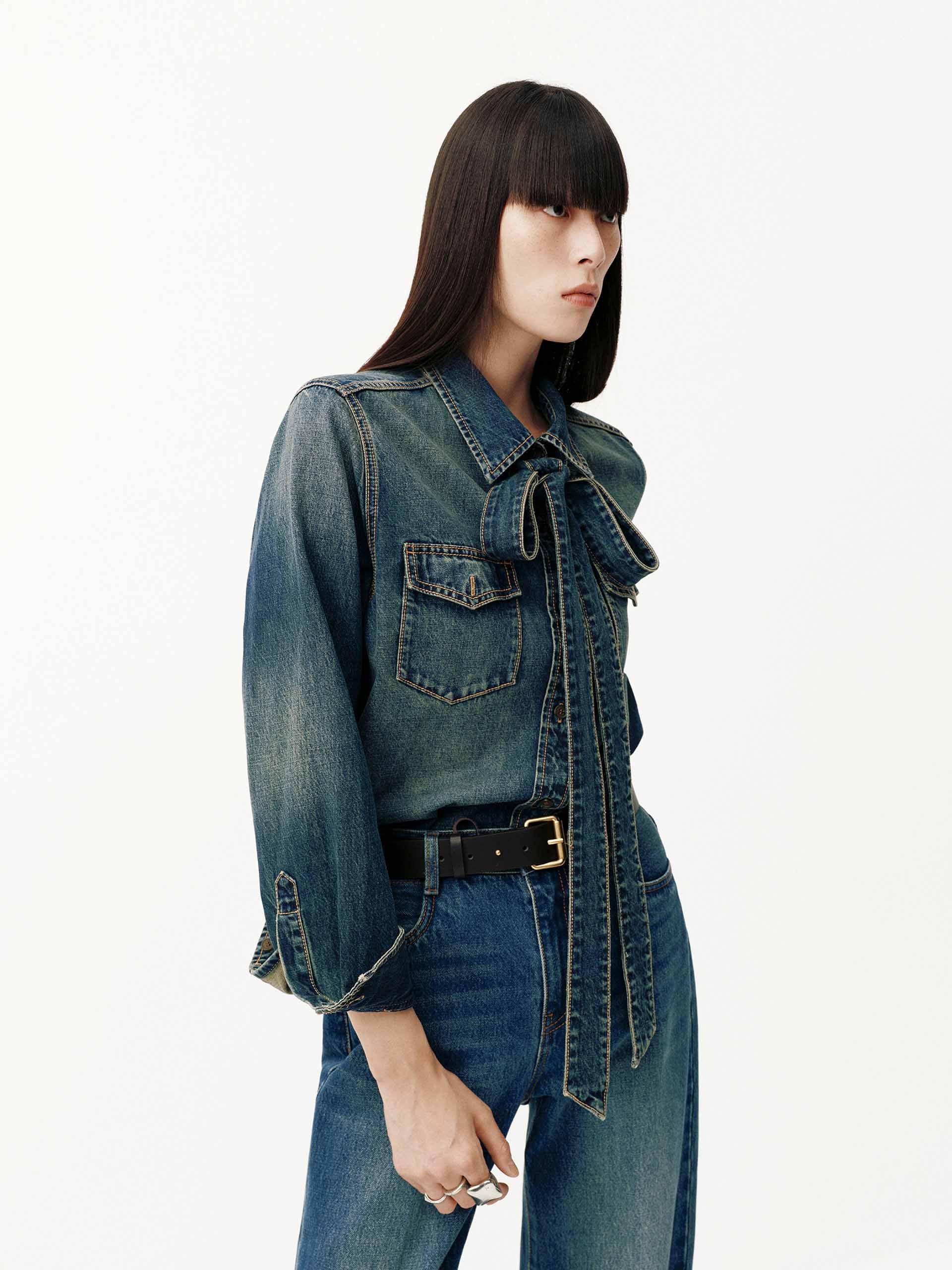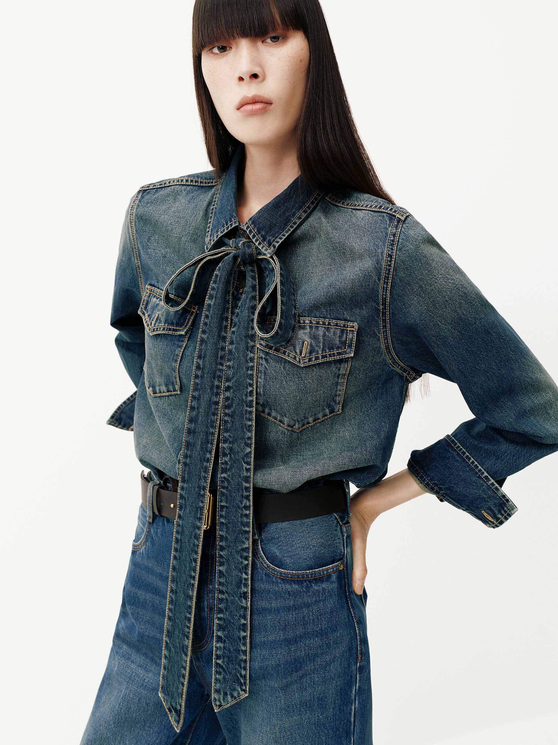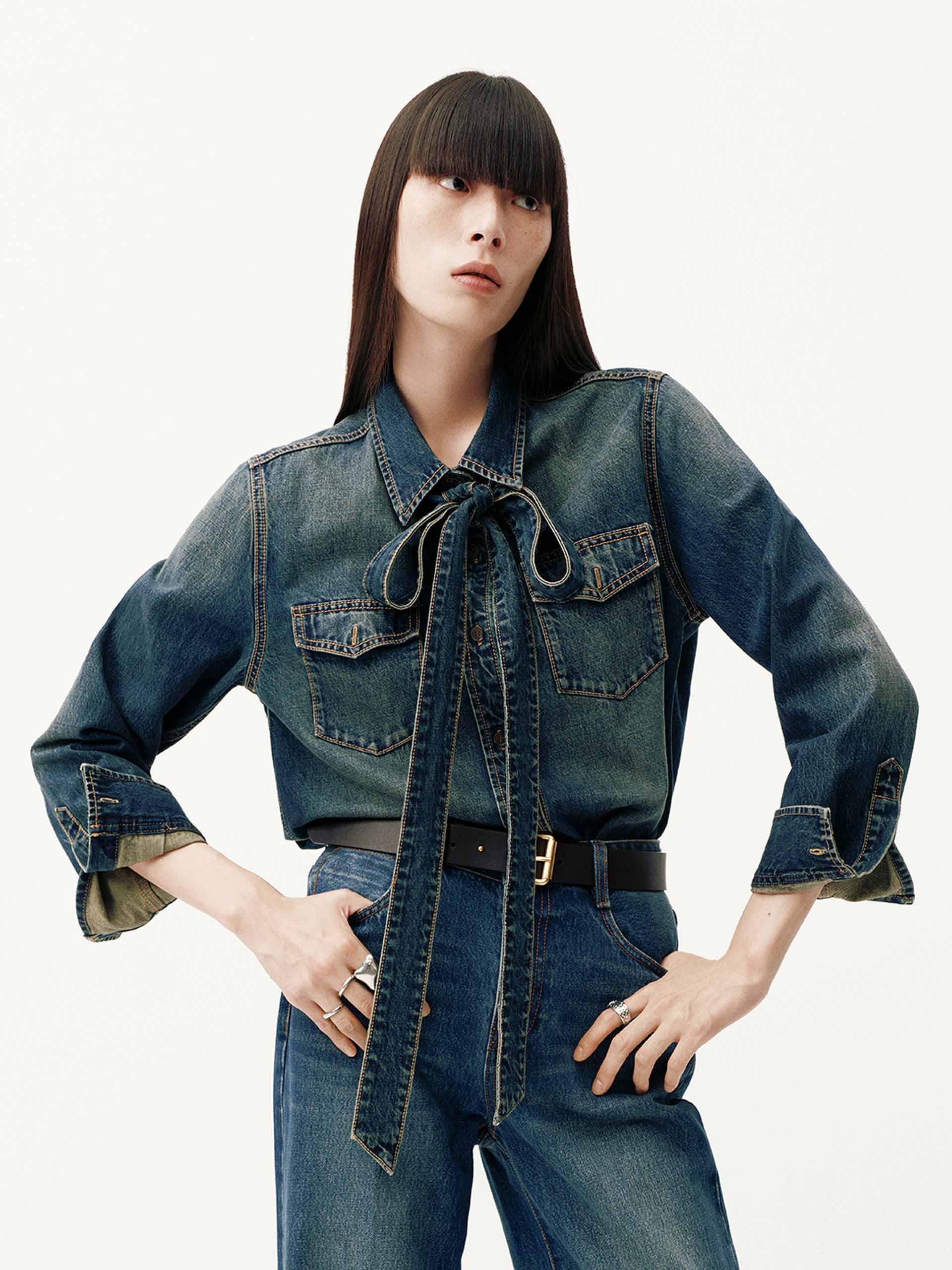 用這款多功能丹寧襯衫提升您的休閒風格,設計採用經典常規版型,帶來永恆的舒適感和輕鬆感。其特點是全鈕釦前襟閉合,輔以優雅、一體式的領帶細節,增添一絲精緻感。實用的胸袋和可調節的鈕釦袖口完善了設計,使這件單品成為實用功能與精緻感的完美結合。