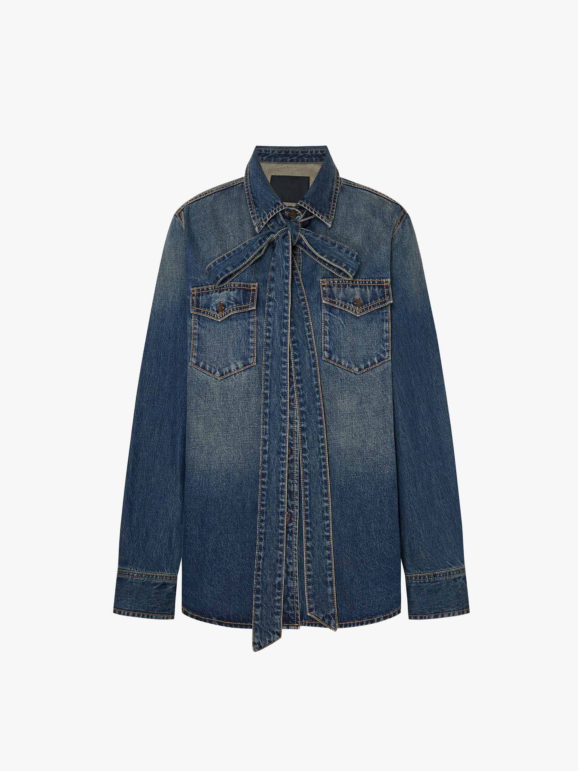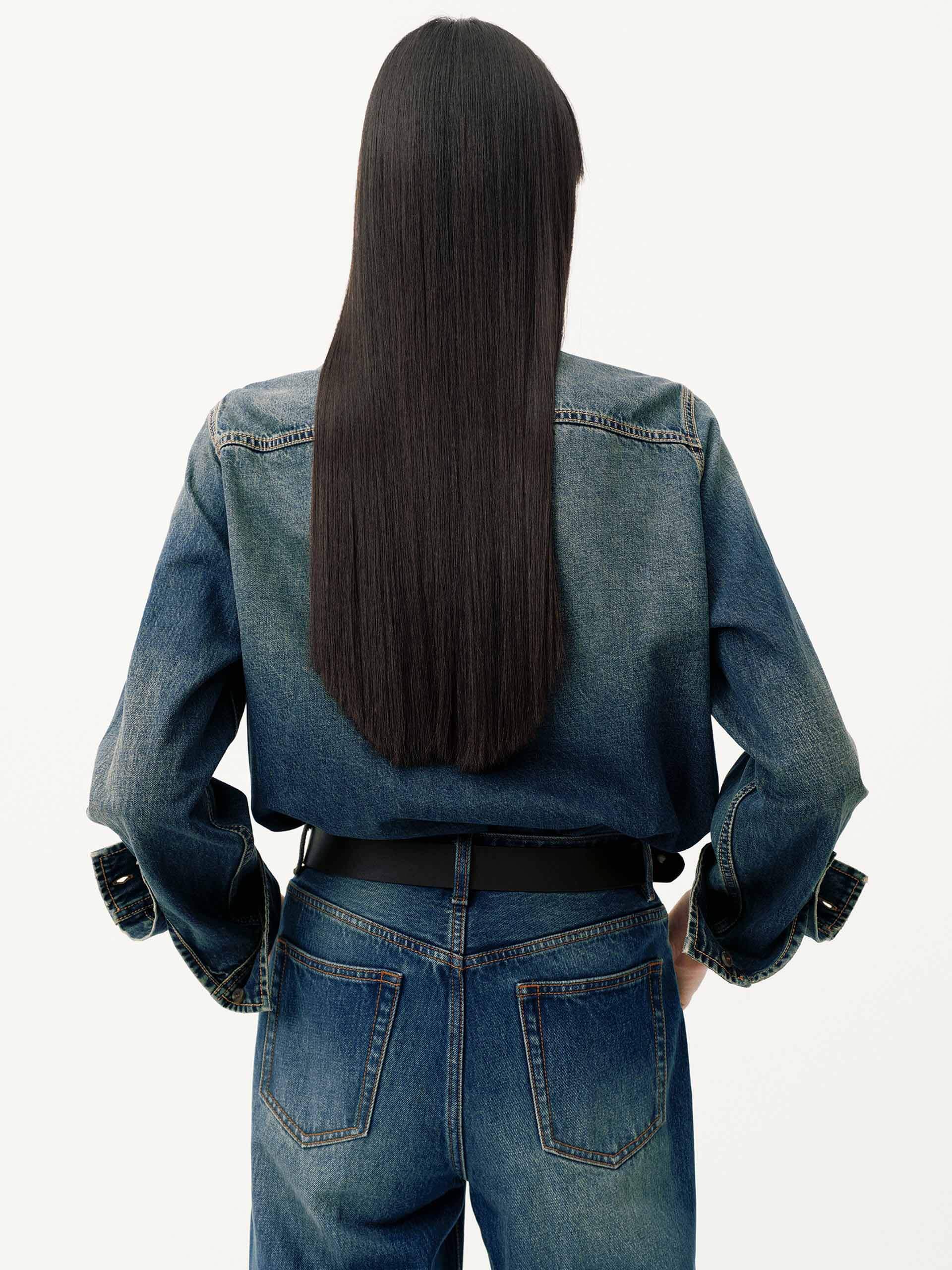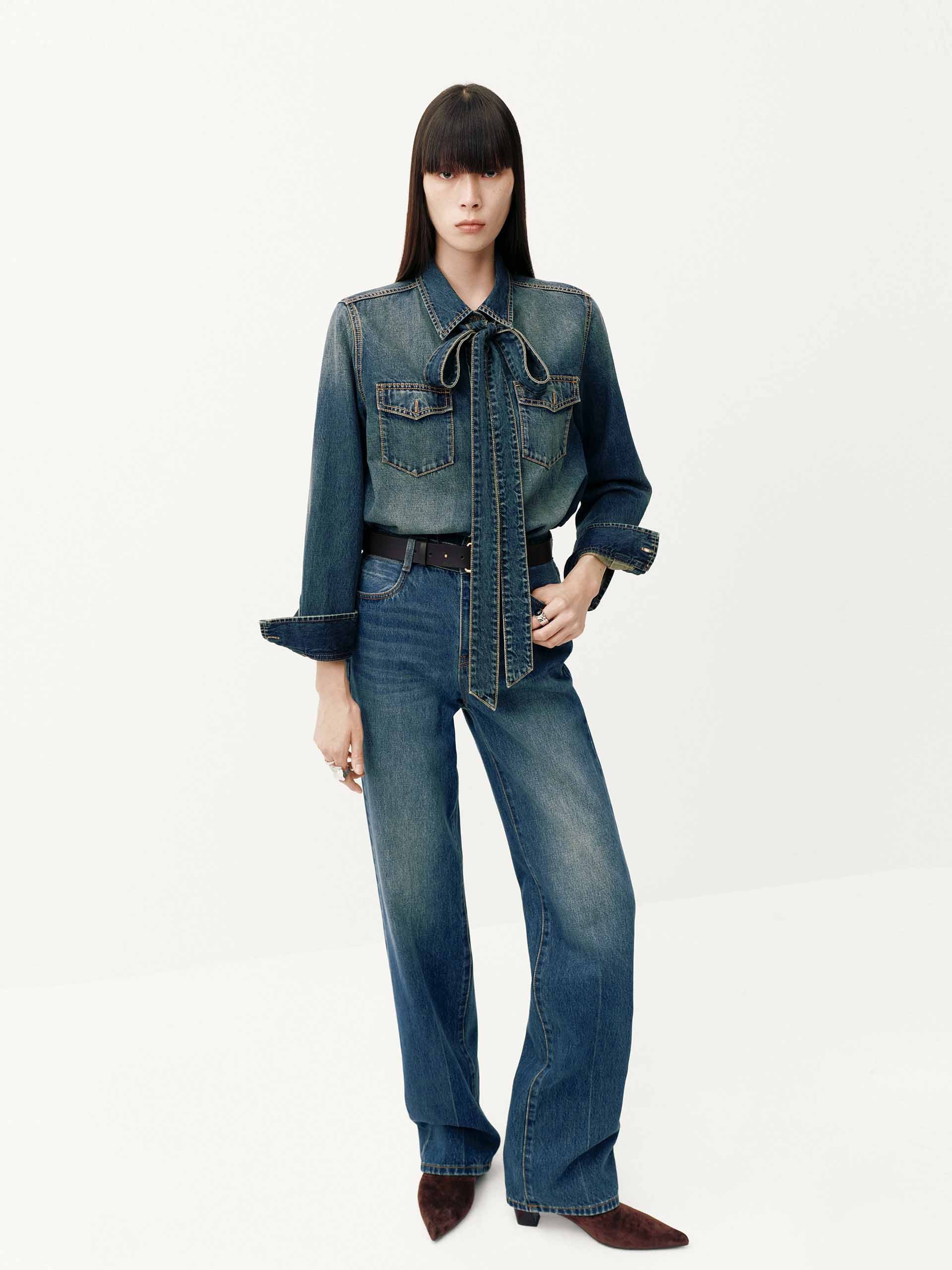 用這款多功能丹寧襯衫提升您的休閒風格,設計採用經典常規版型,帶來永恆的舒適感和輕鬆感。其特點是全鈕釦前襟閉合,輔以優雅、一體式的領帶細節,增添一絲精緻感。實用的胸袋和可調節的鈕釦袖口完善了設計,使這件單品成為實用功能與精緻感的完美結合。
