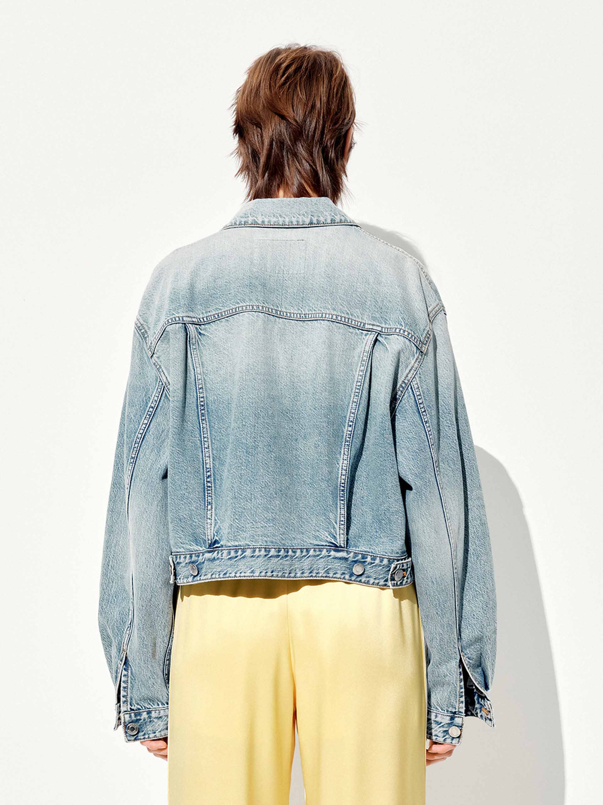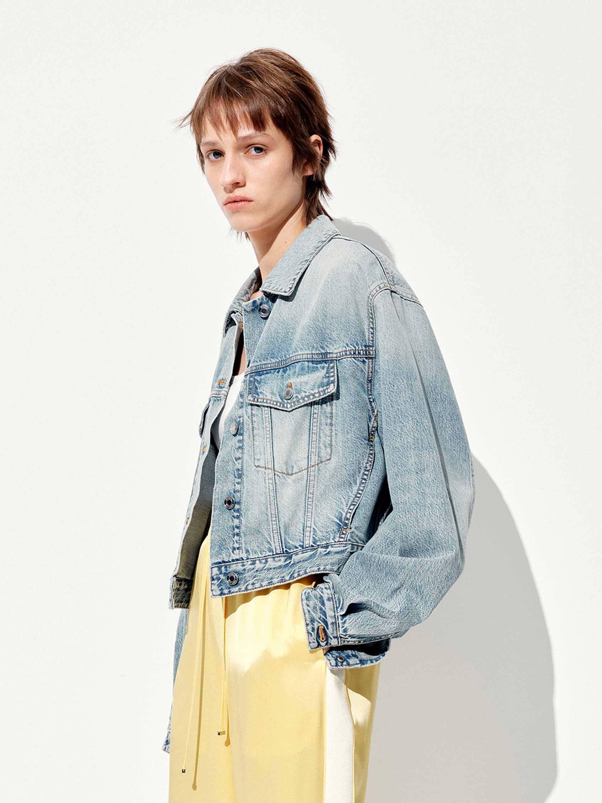 這款牛仔外套為任何造型增添輕鬆酷感。短版剪裁呈現修身的及腰輪廓,完美搭配高腰下裝,長袖設計為過渡季節提供多樣化的覆蓋。經典鈕扣閉合和實用胸袋保持設計真實實用,柔軟棉質牛仔確保全天舒適,帶有磨舊感。
