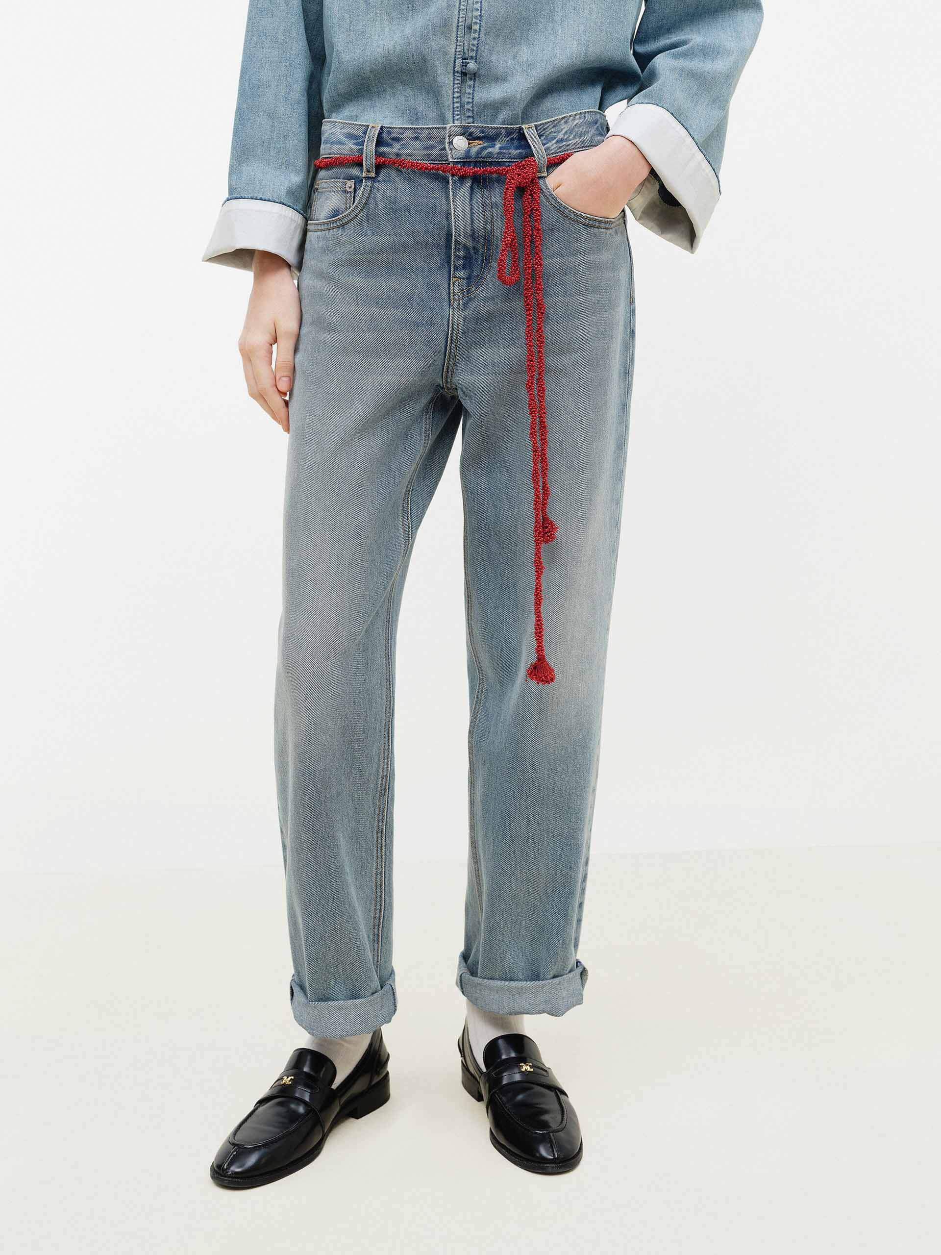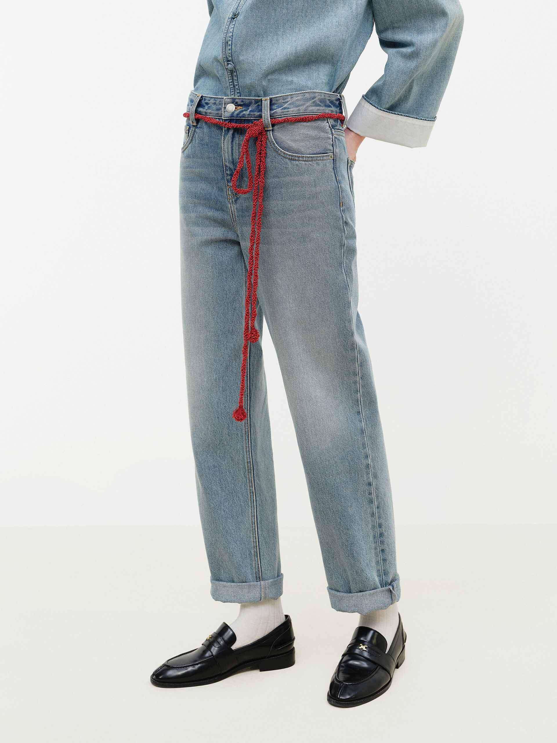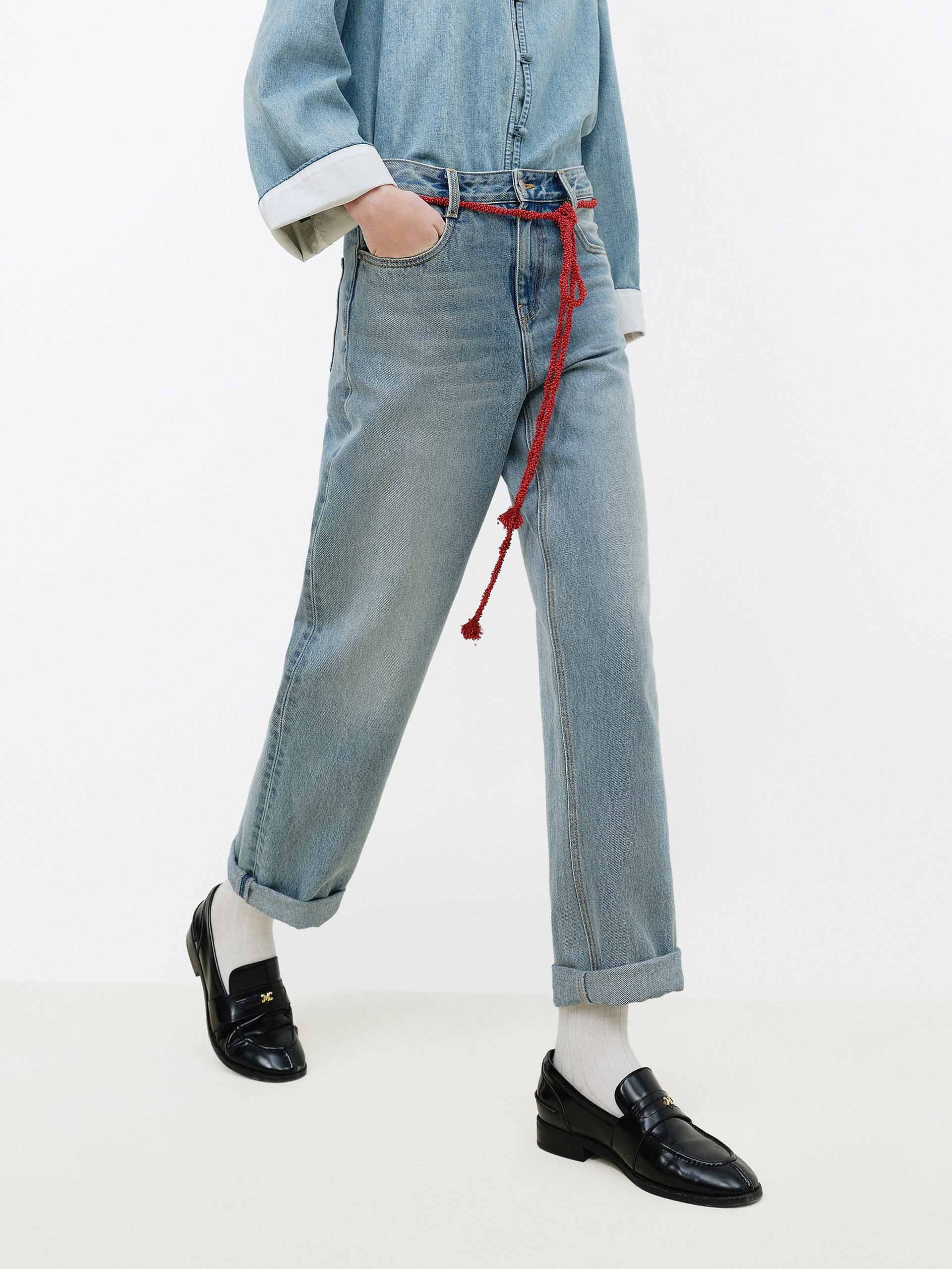 這款牛仔褲採用弧形折疊設計,增添獨特的層次細節。搭配現代中式流蘇腰帶,不僅可調整腰線優化比例,更能凸顯東方美學的優雅風格。採用 100% 純棉製成,透氣舒適,讓您輕鬆打造時尚舒適造型。