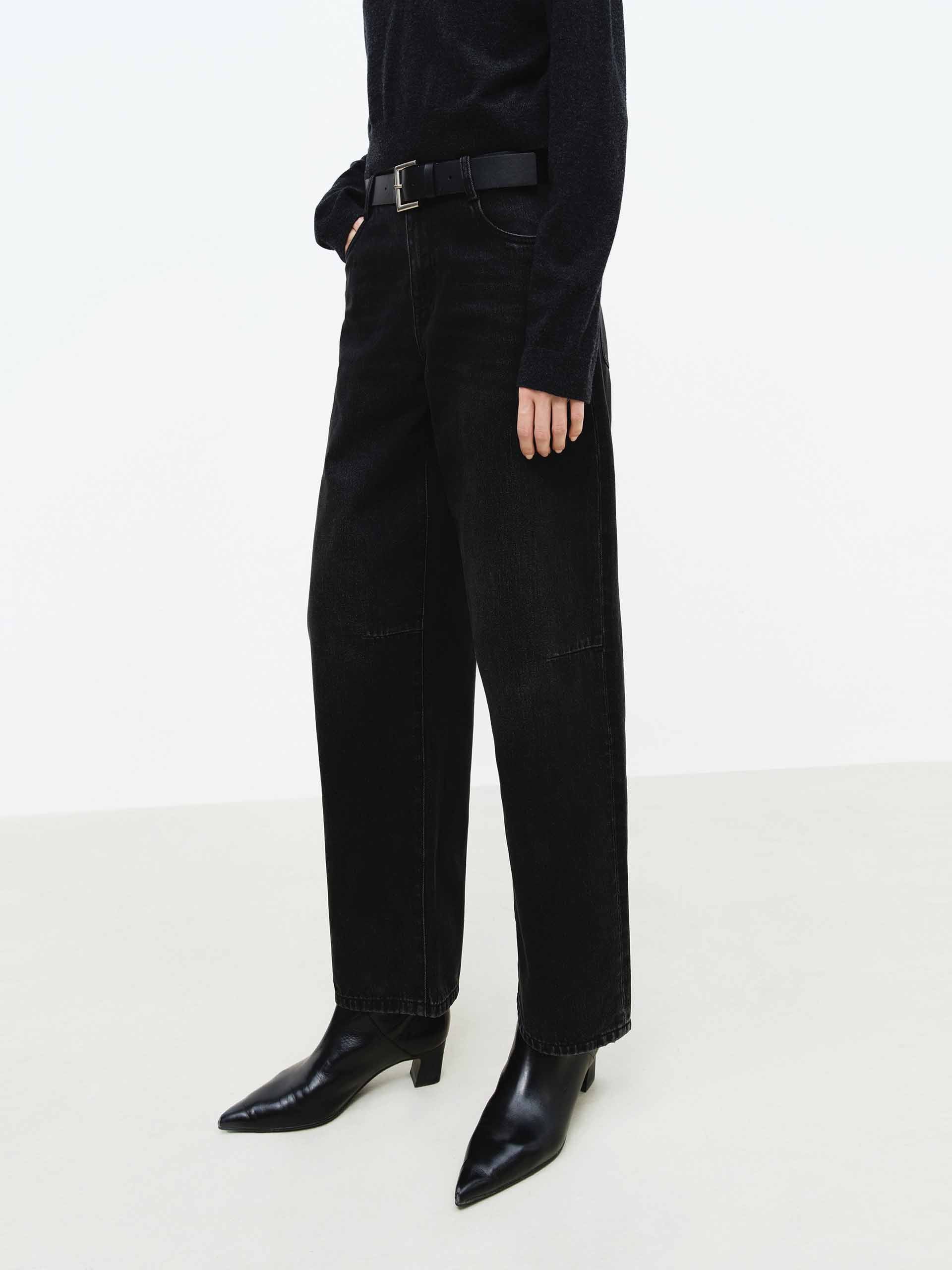 這款牛仔褲以醒目且平衡的線條定義,獨特的桶型褲腳輪廓在腳踝處收窄,營造現代建築感。採用傳統拉鍊與鈕扣開合及實用五口袋佈局。膝蓋處的精準褶飾強化腿部的獨特曲線,而真皮標誌貼布則增添純正工藝的最後點綴。