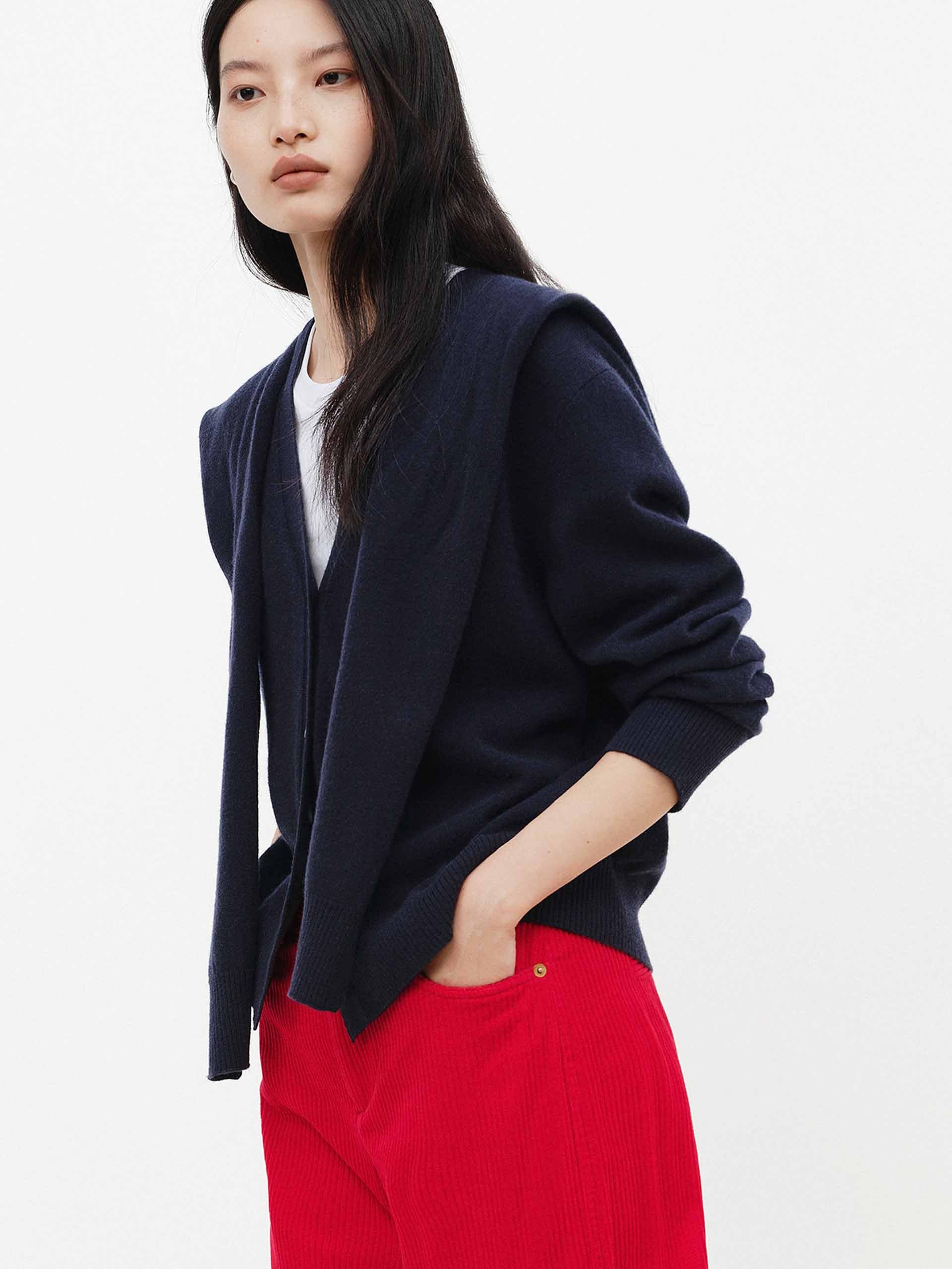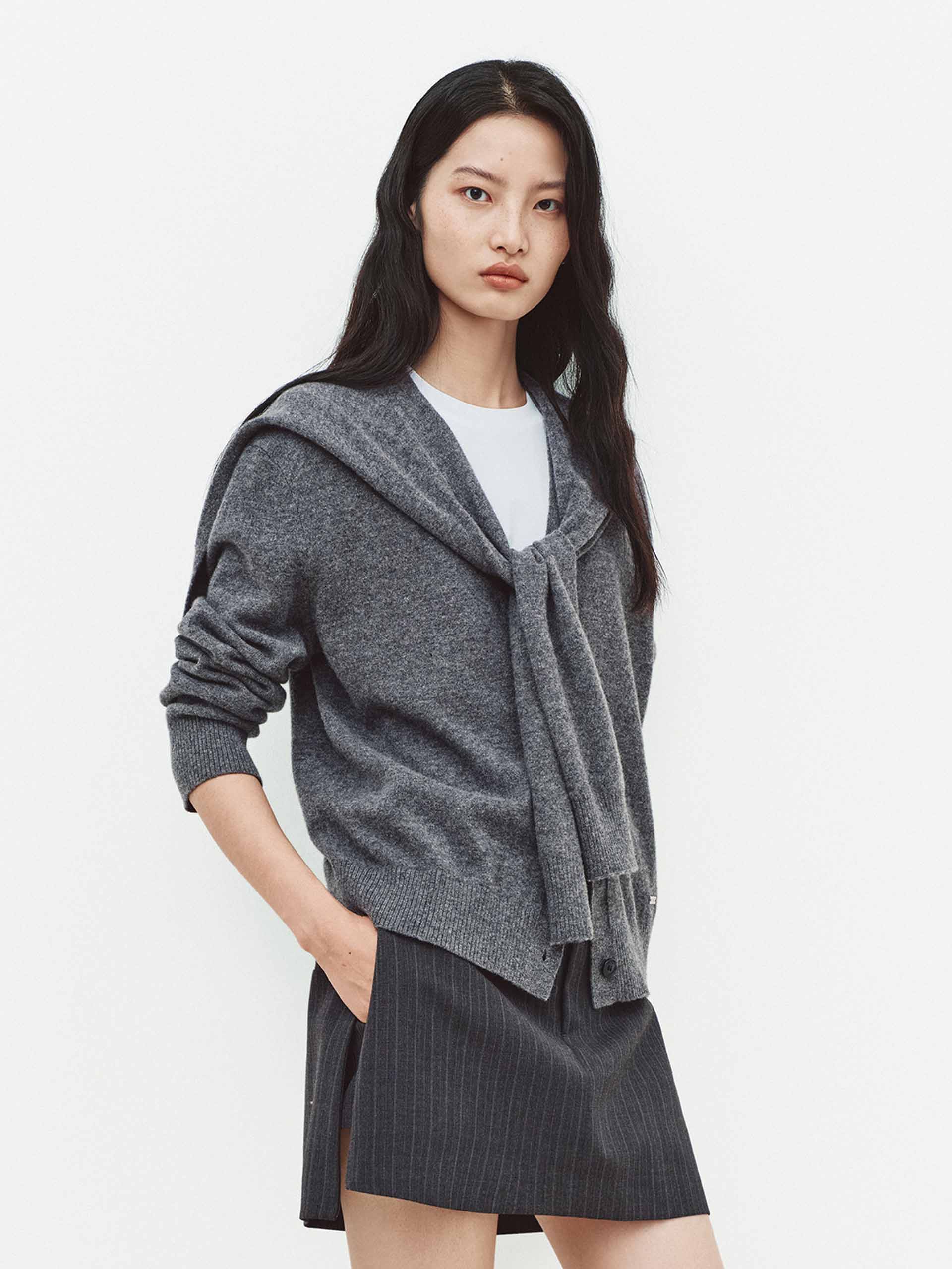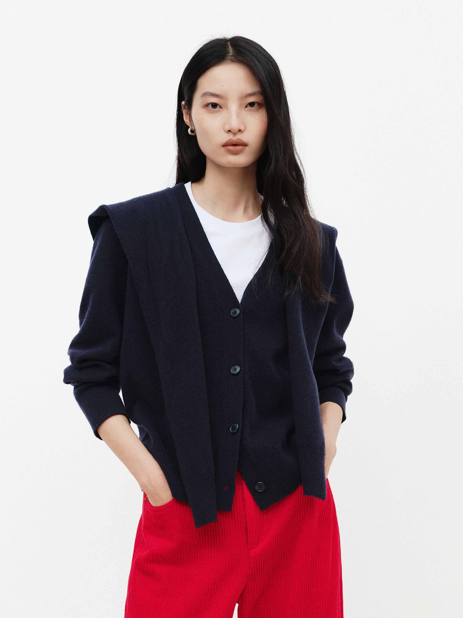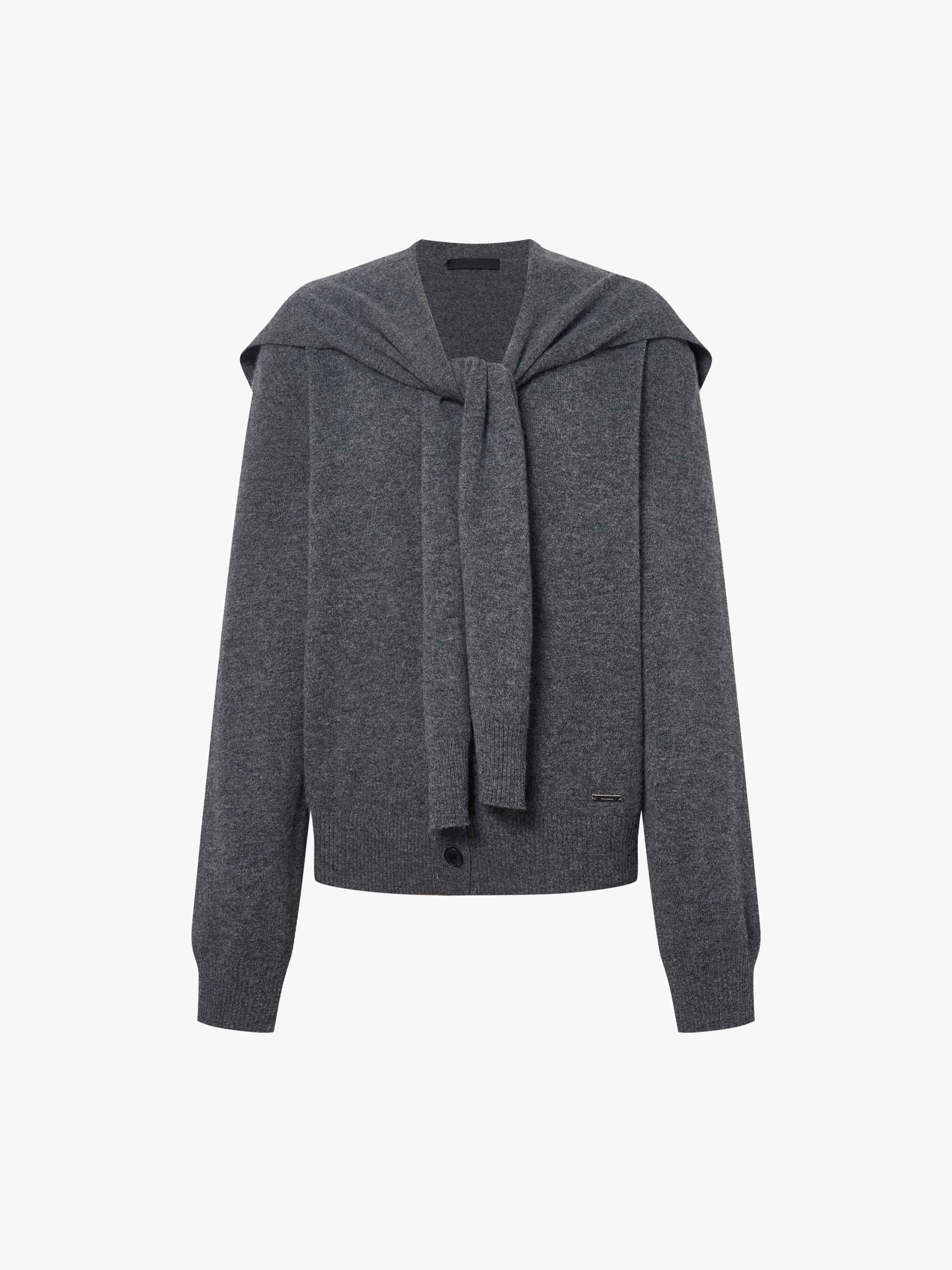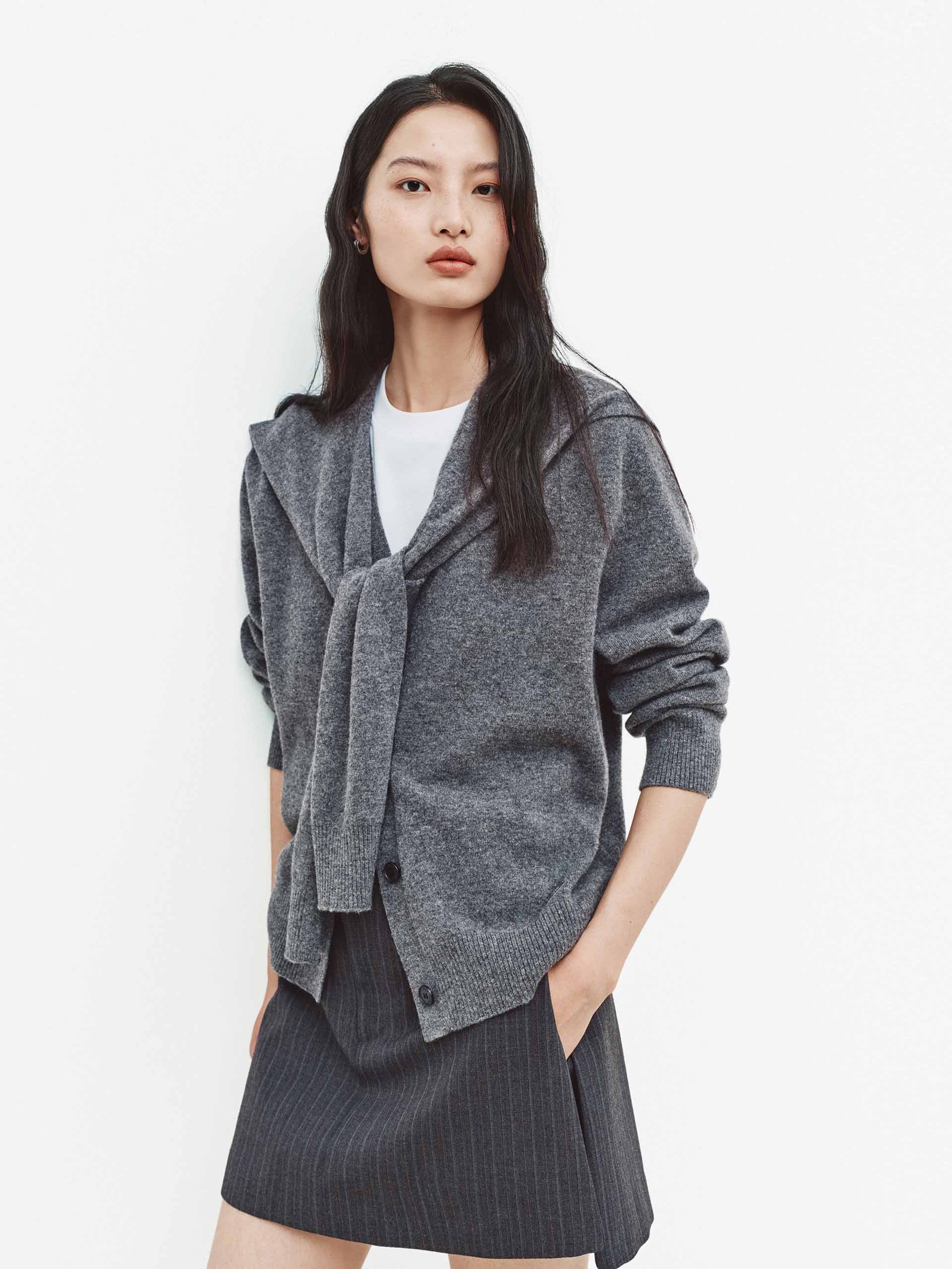這是柔軟與結構的獨特宣言,這款開襟衫採用 100% 羊毛精心編織而成。其乾淨的標準版型和 V 領設計適用於多層次穿搭,並以精緻的鈕扣閉合固定。設計特色在於優雅的附連披肩,並在下擺點綴有低調的金屬飾片,營造出溫暖舒適與剪裁精緻的完美平衡。