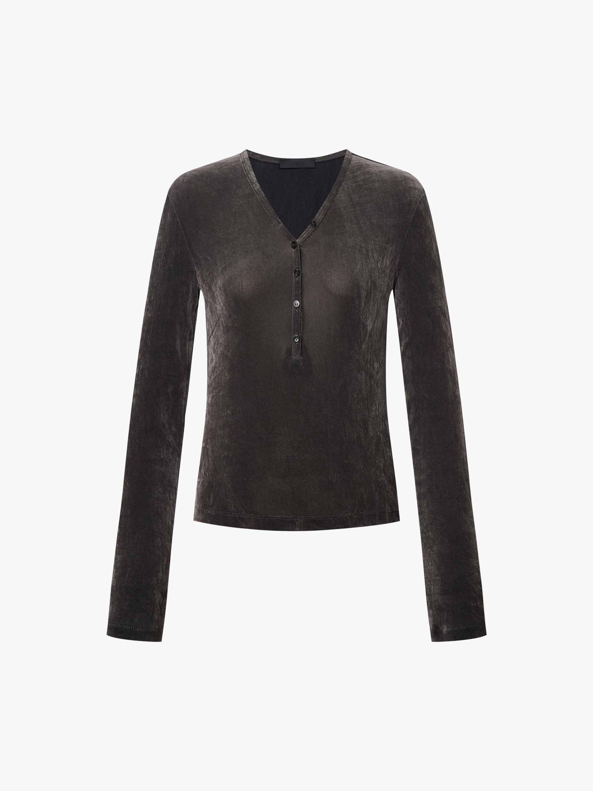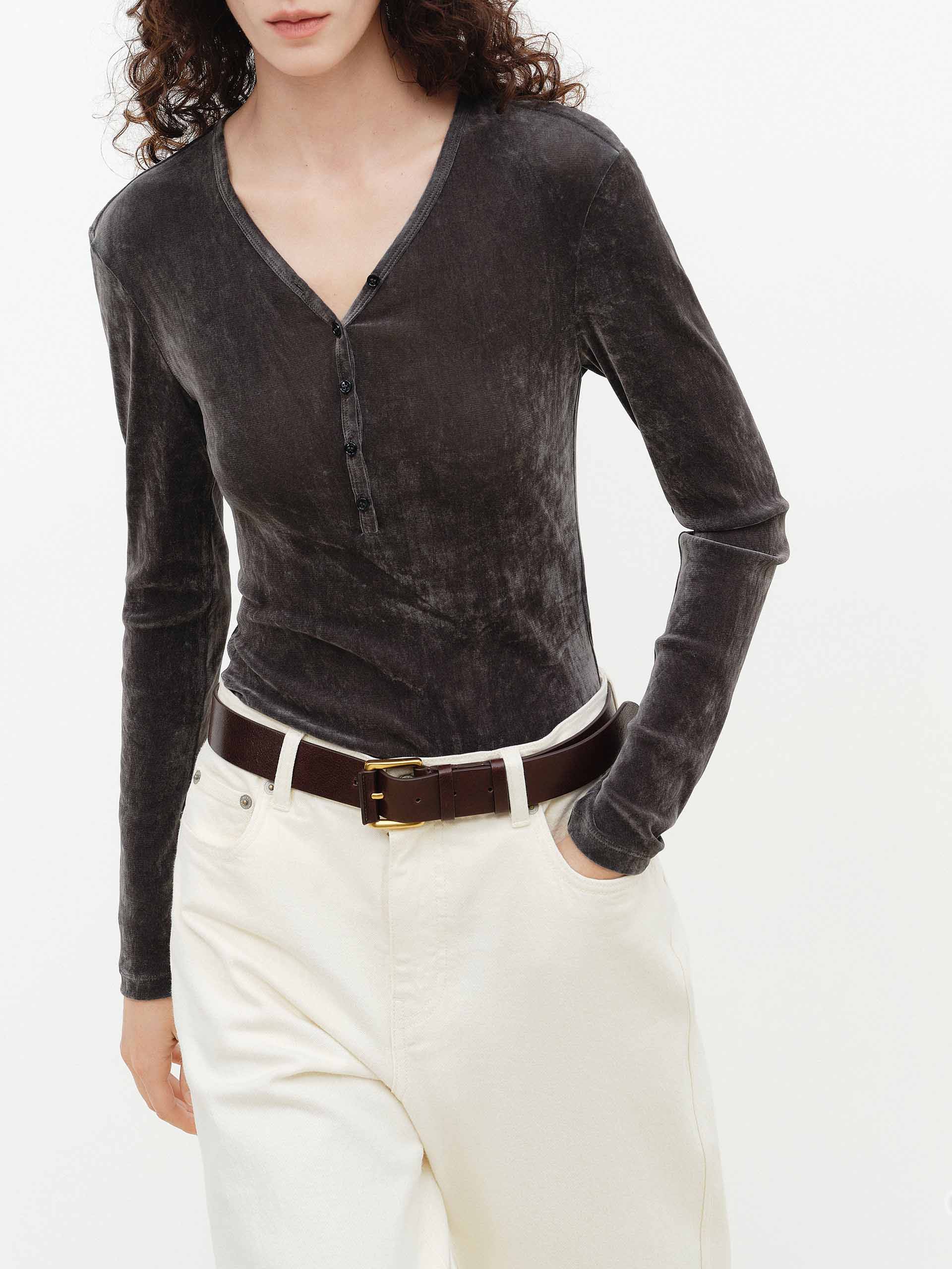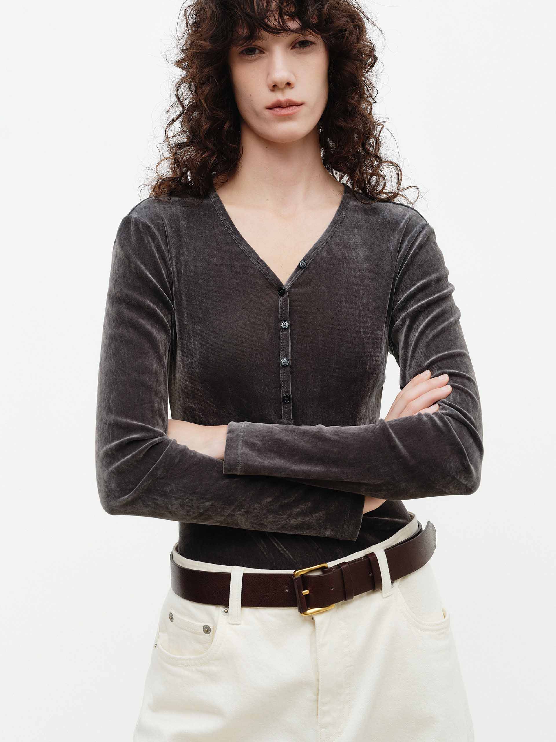 採用奢華嫘縈天鵝絨製成,這款襯衫以其優雅的修身版型提供俐落與性感的吸引力。深 V 形領口和精緻的半鈕扣閉合創造出修飾效果且可調整的輪廓。設計兼顧舒適與精緻,其柔軟面料呈現美麗垂墜,展現永恆且觸感優雅的風格。