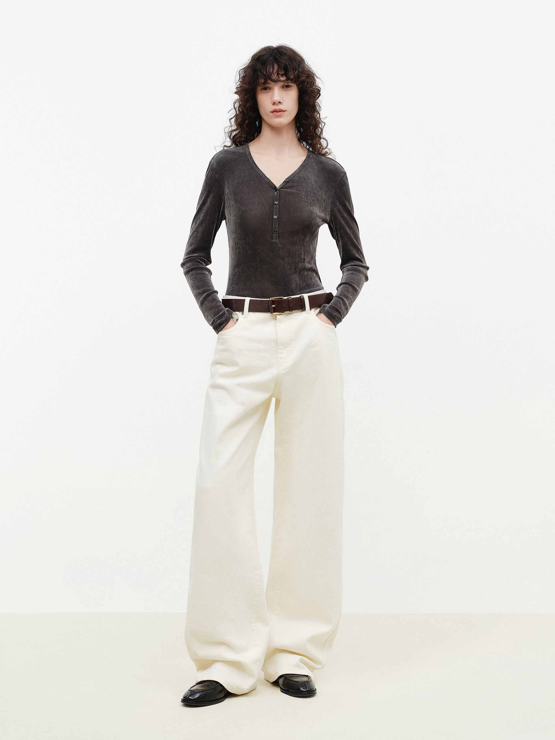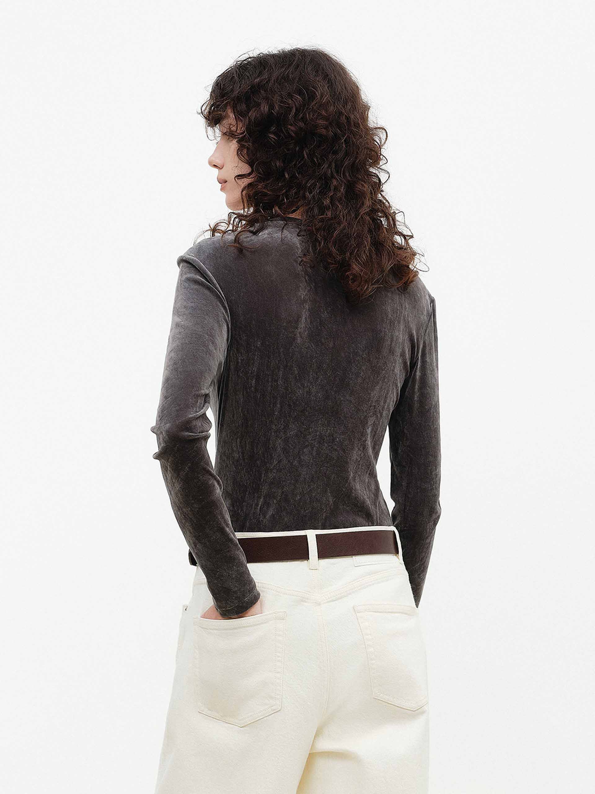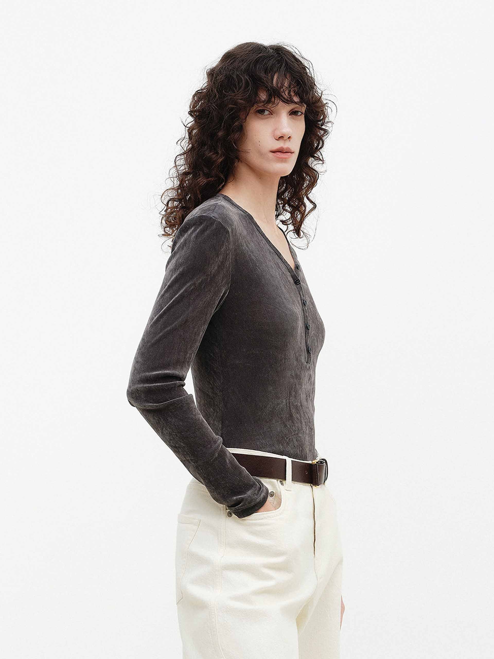 採用奢華嫘縈天鵝絨製成,這款襯衫以其優雅的修身版型提供俐落與性感的吸引力。深 V 形領口和精緻的半鈕扣閉合創造出修飾效果且可調整的輪廓。設計兼顧舒適與精緻,其柔軟面料呈現美麗垂墜,展現永恆且觸感優雅的風格。