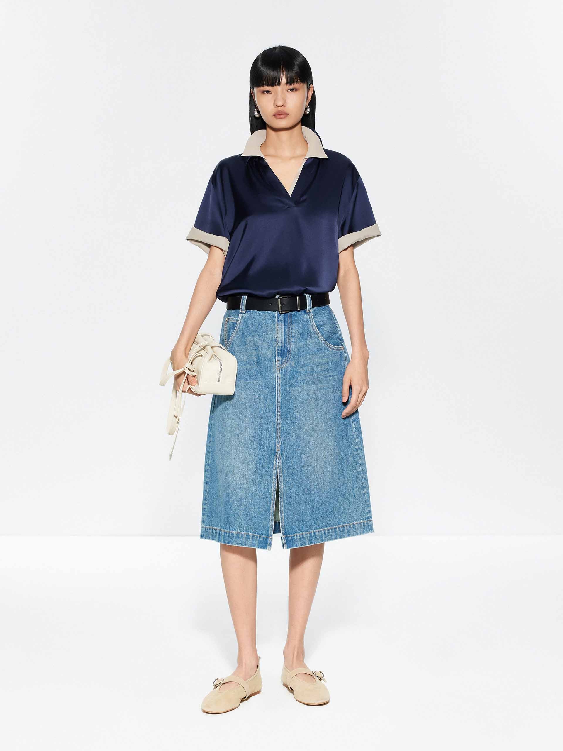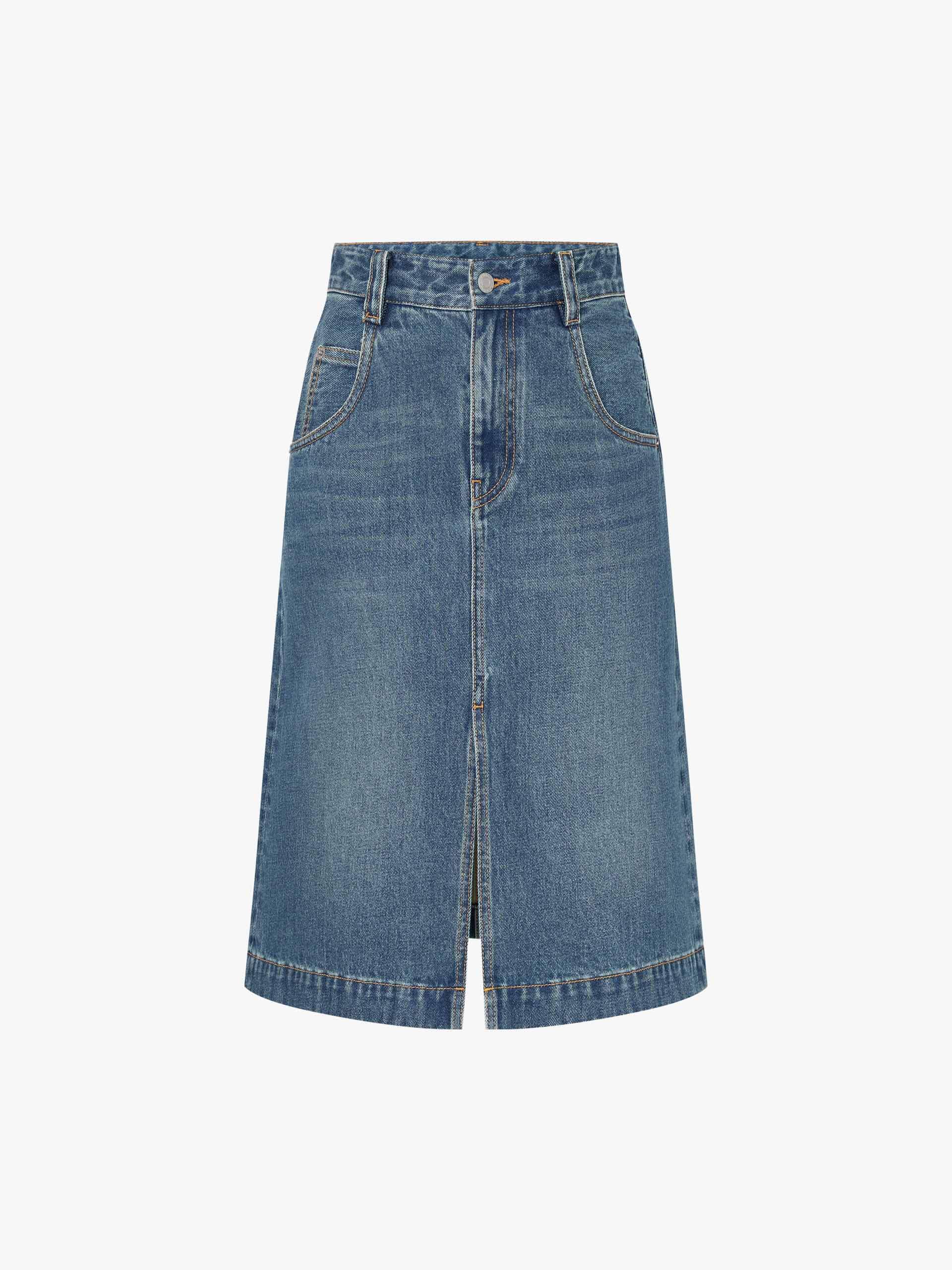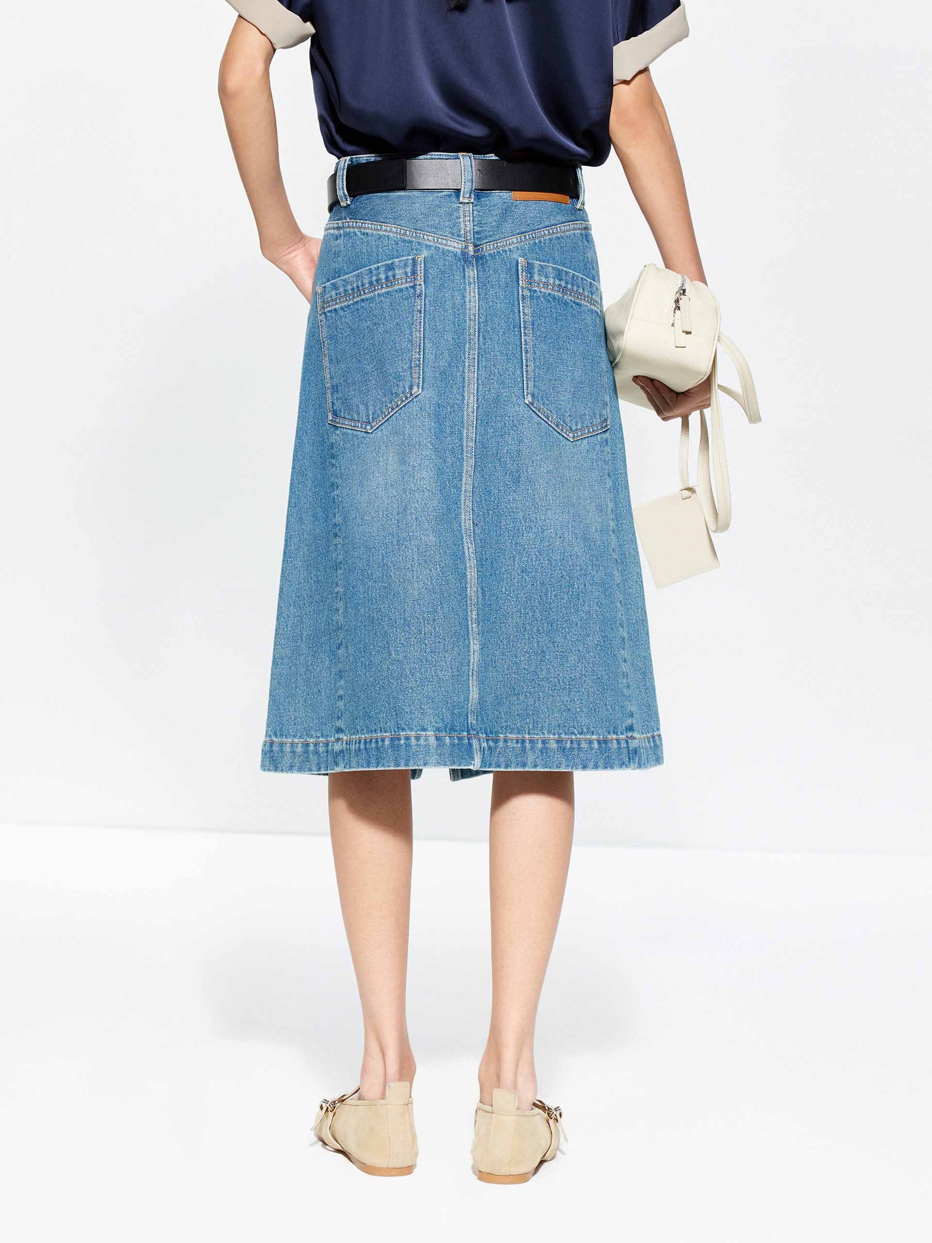 這款棉質牛仔裙將隨性風格與日常舒適完美結合。前開衩設計增添俏皮動感與腿部線條展現。經典五口袋佈局搭配功能性拉鍊鈕扣閉合,兼具實用與時尚。