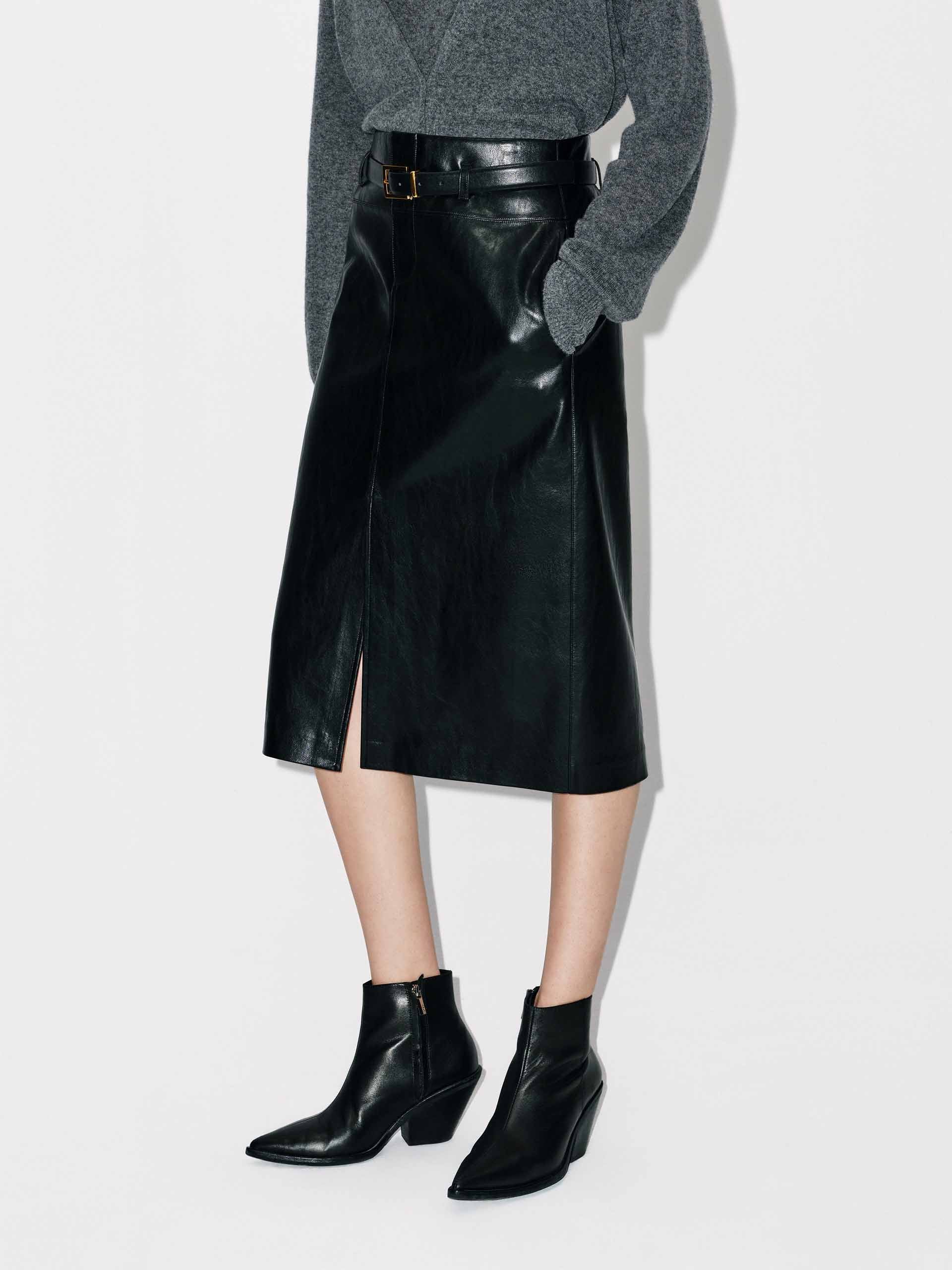 前開衩皮革中長半身裙
