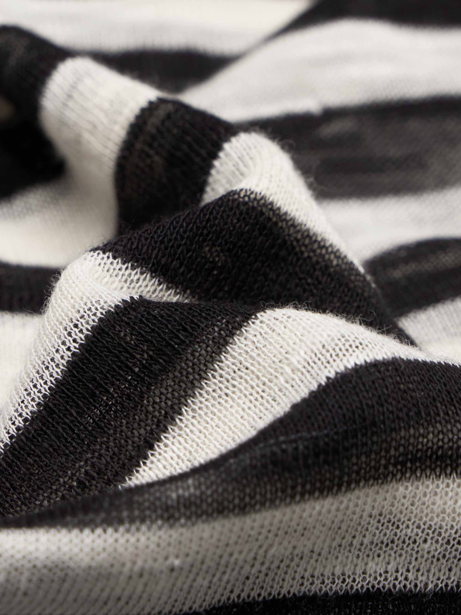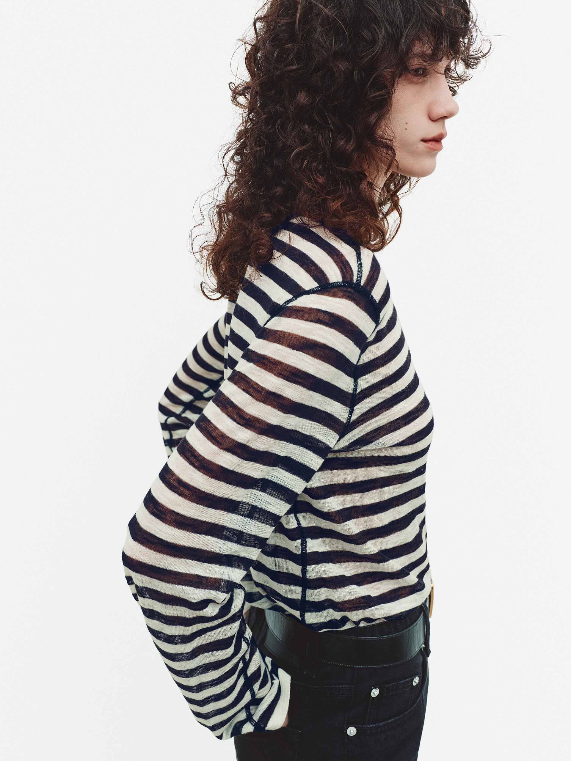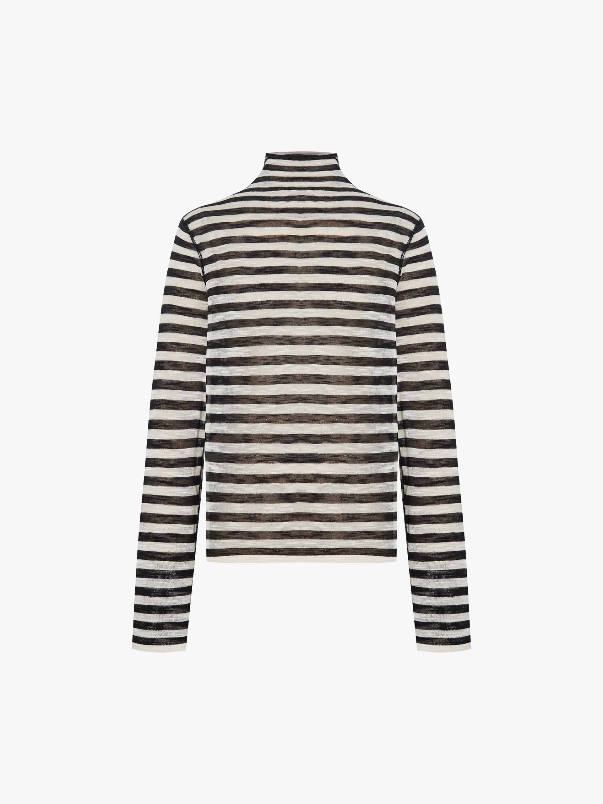 這款針織上衣以其細膩的紋理和輪廓,為休閒針織服飾提供了精緻的詮釋。採用透氣的棉與亞麻混紡製成,具有舒適的標準版型和現代高領。微妙的條紋和精緻、略帶透視感的面料,被定義性的黑色縫線優雅地框住,創造出具有精緻深度和低調風格的層次感外觀。