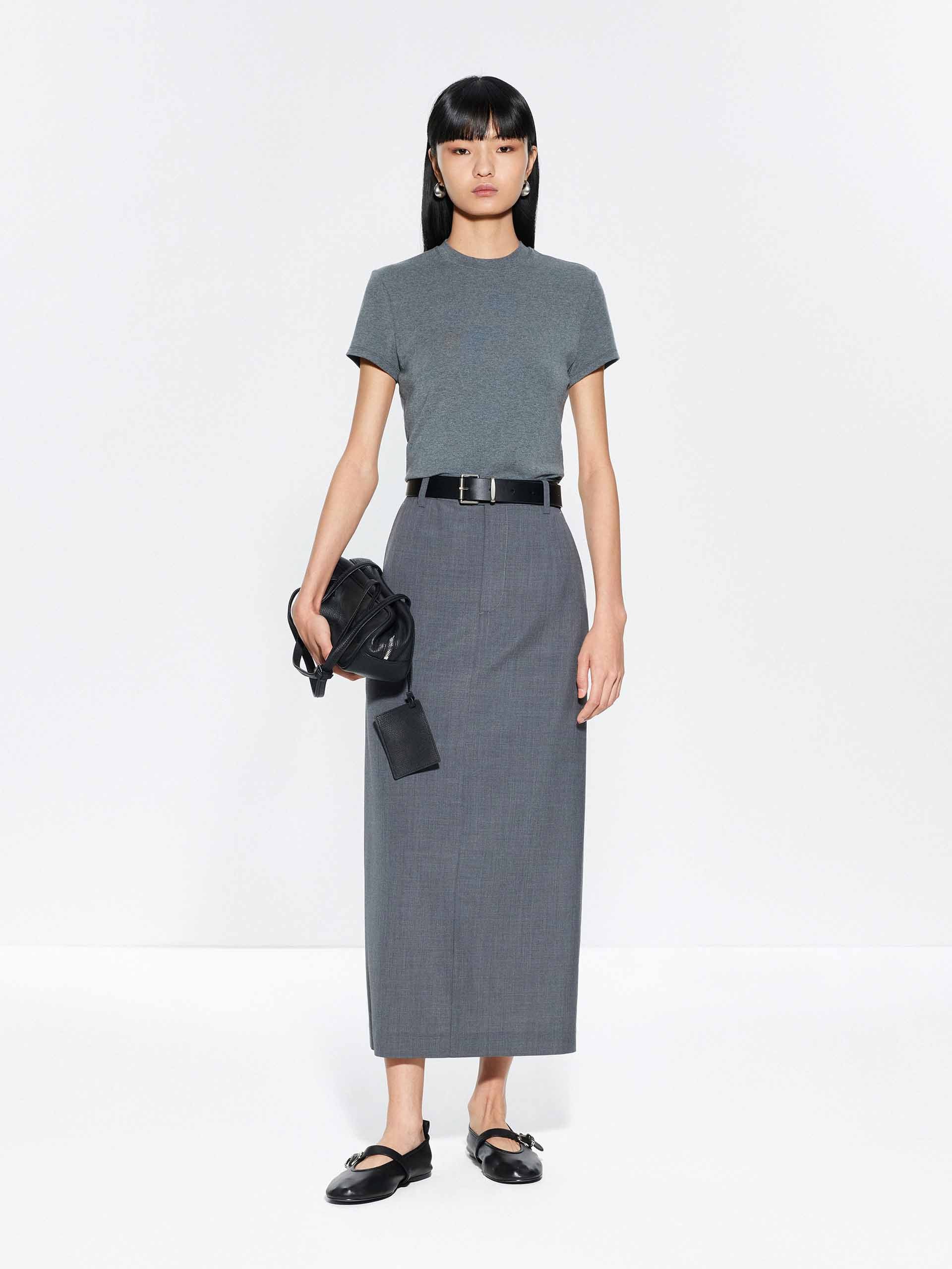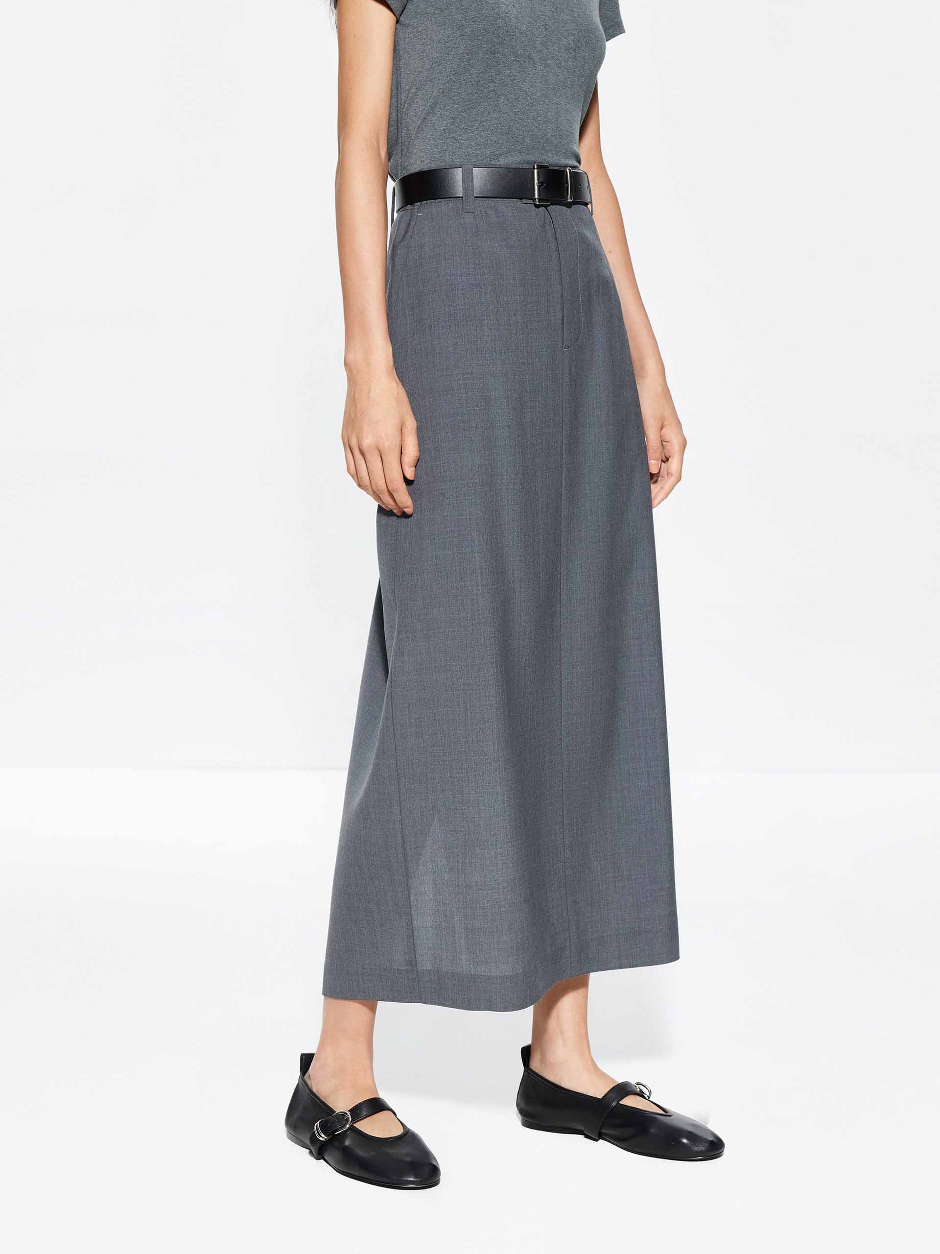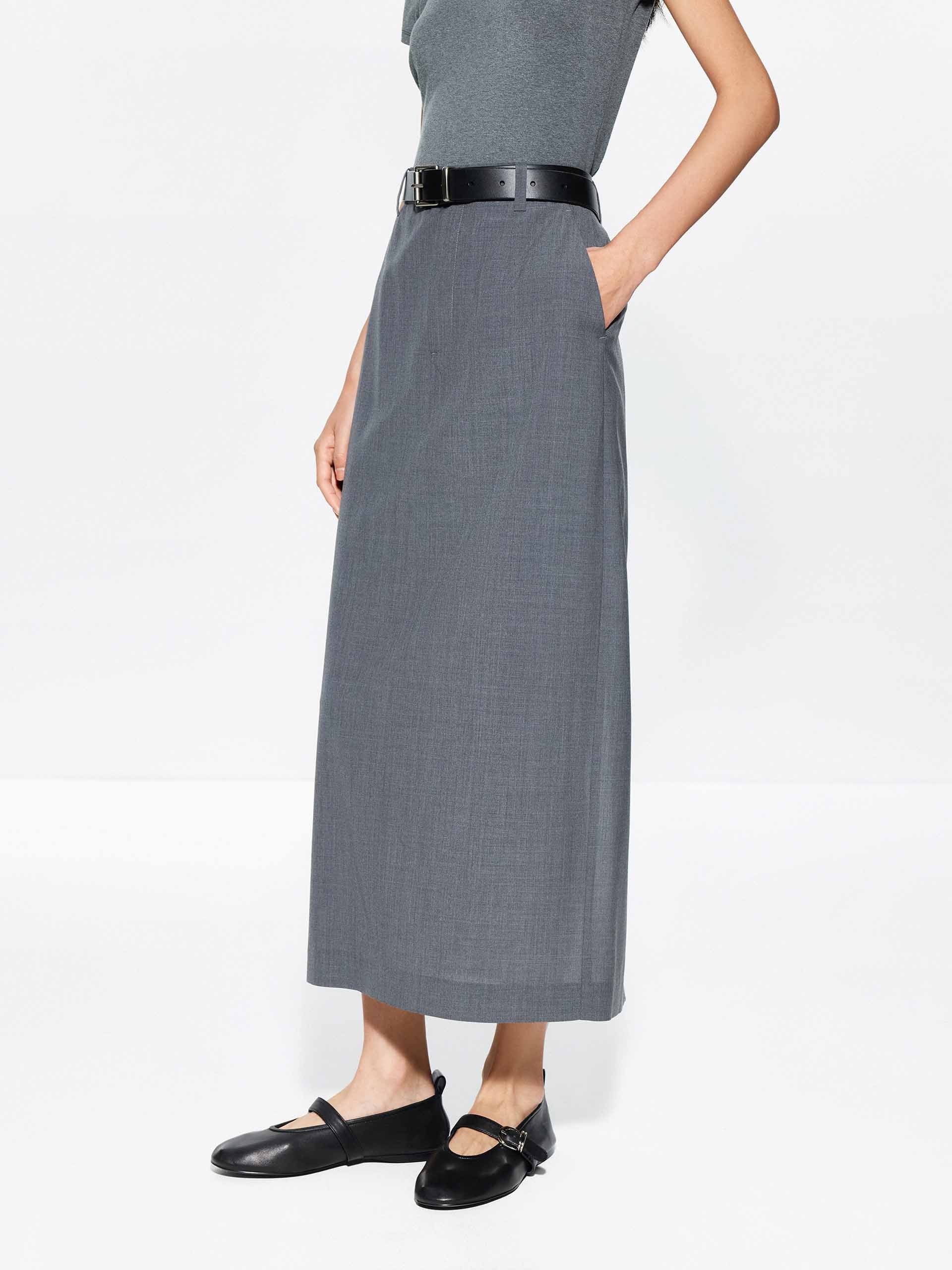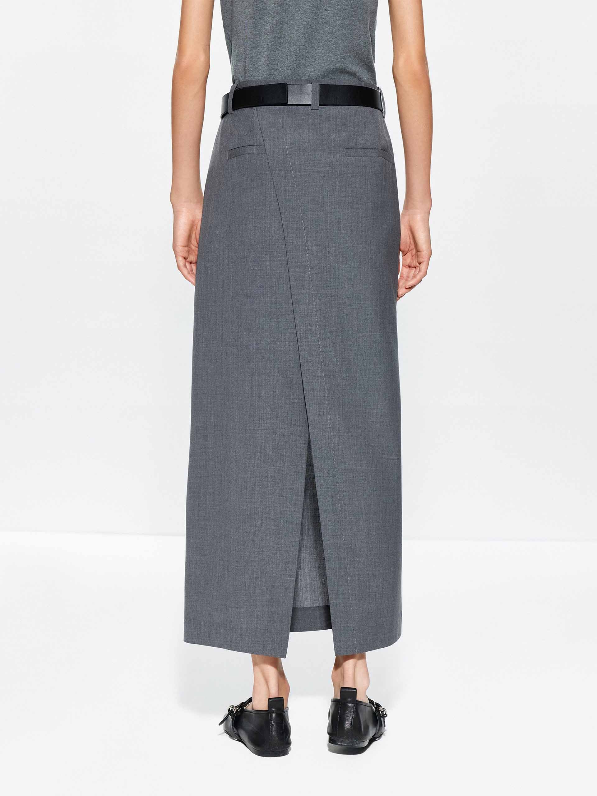 這款裙子將精緻感與現代風格完美結合。俐落直筒剪裁貼合曲線,大膽後開衩設計隨步伐展現動感。優雅灰色調與微透效果,輕鬆從辦公室穿搭轉換到晚宴造型。