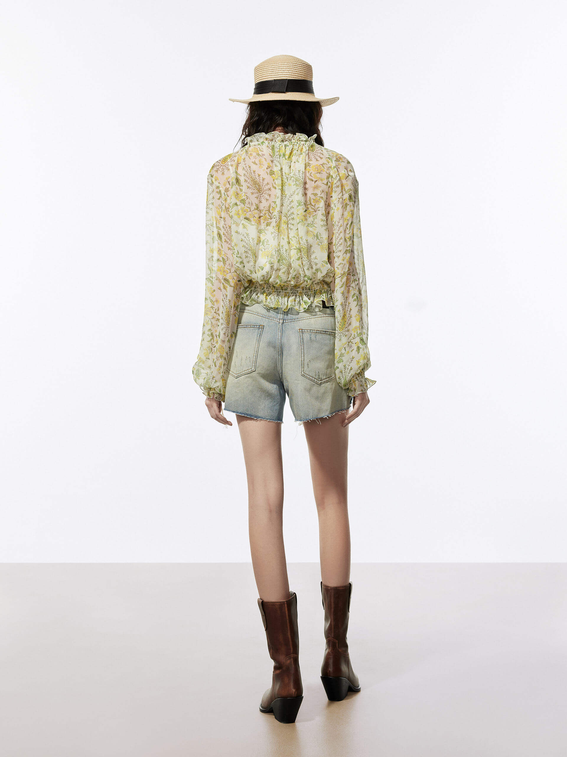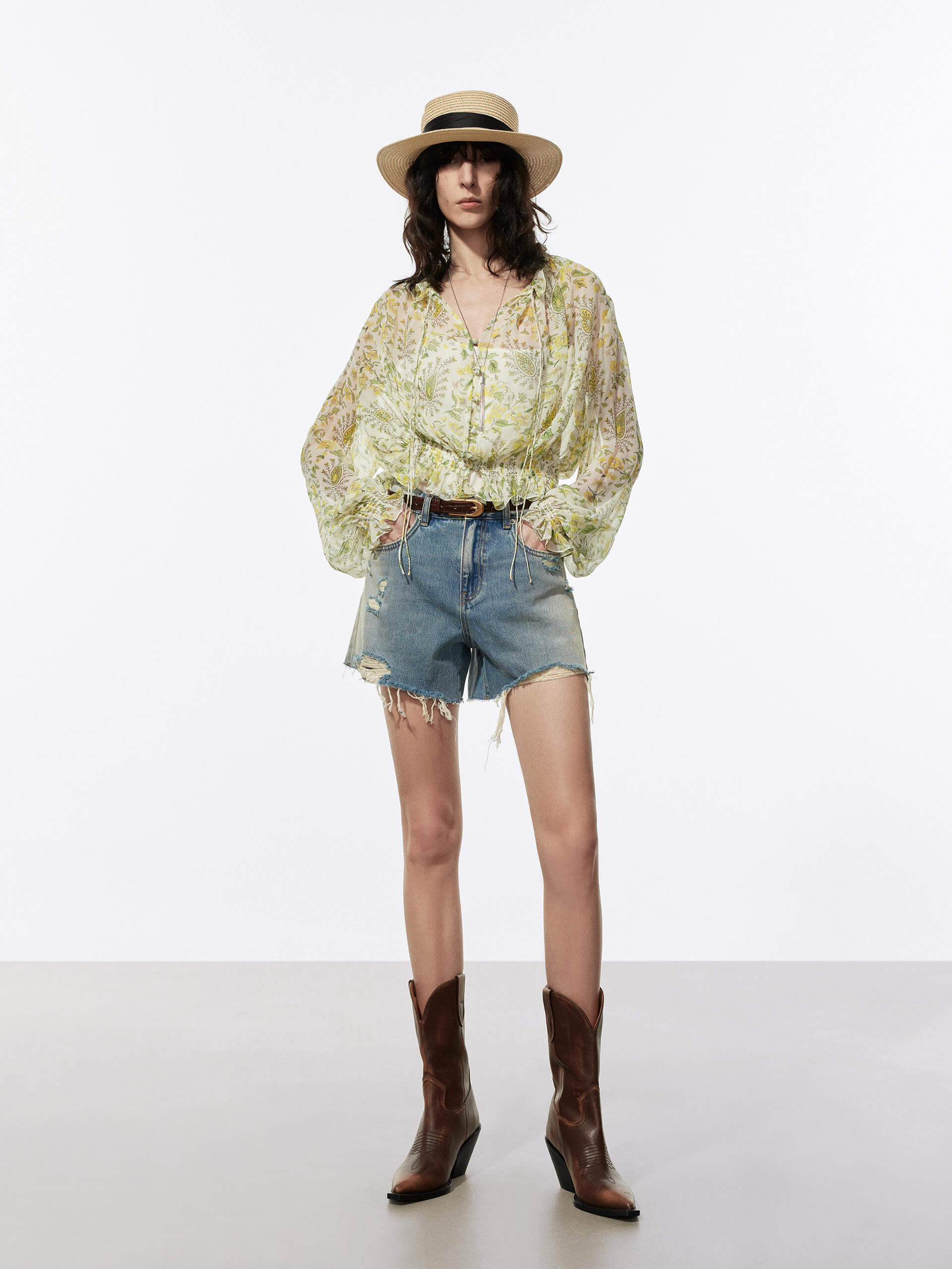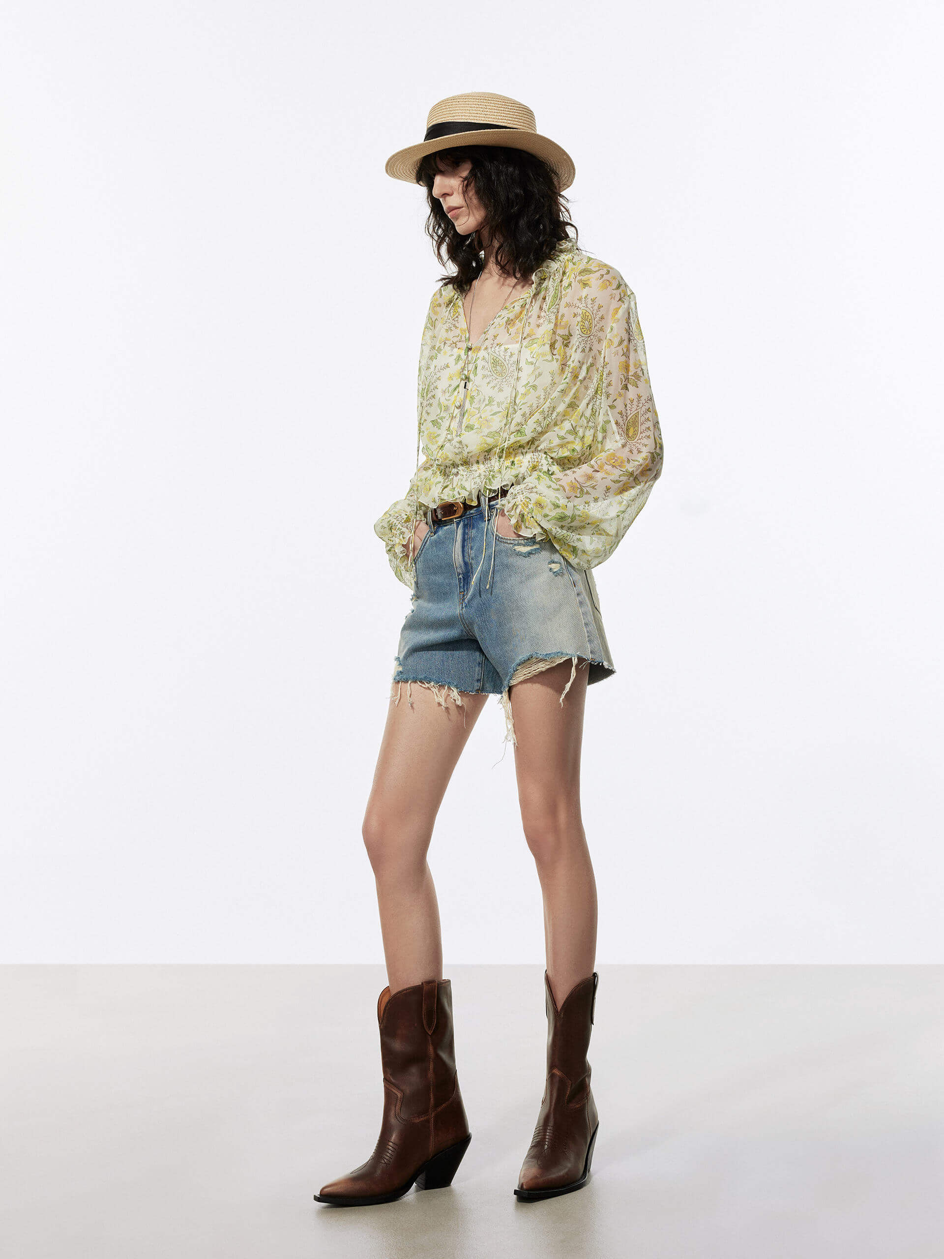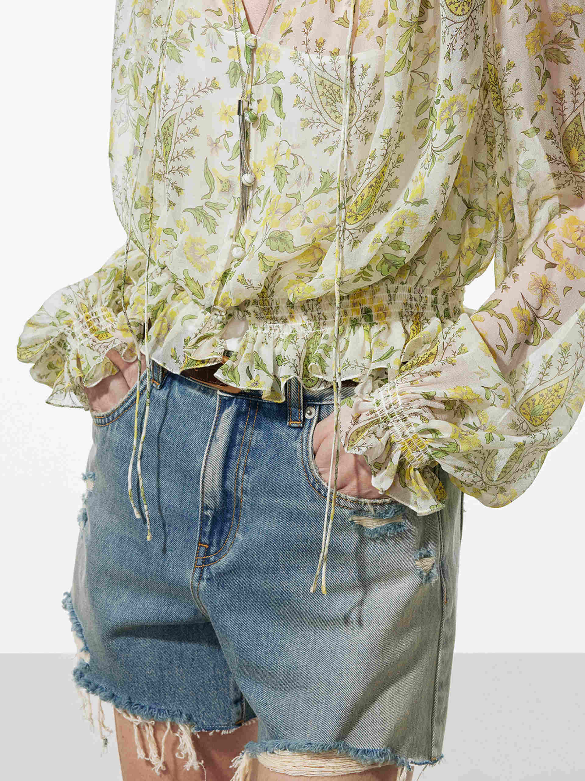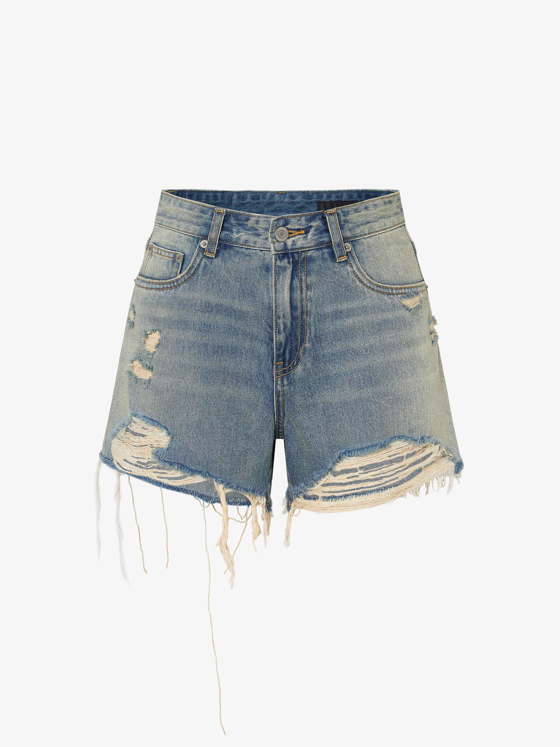 提升您的夏季風格!這款牛仔短褲採用高品質棉質製成,中腰迷你短褲設計,具有時尚的磨損細節和修身的米色調水洗。是日常穿著的理想選擇,多功能且休閒。