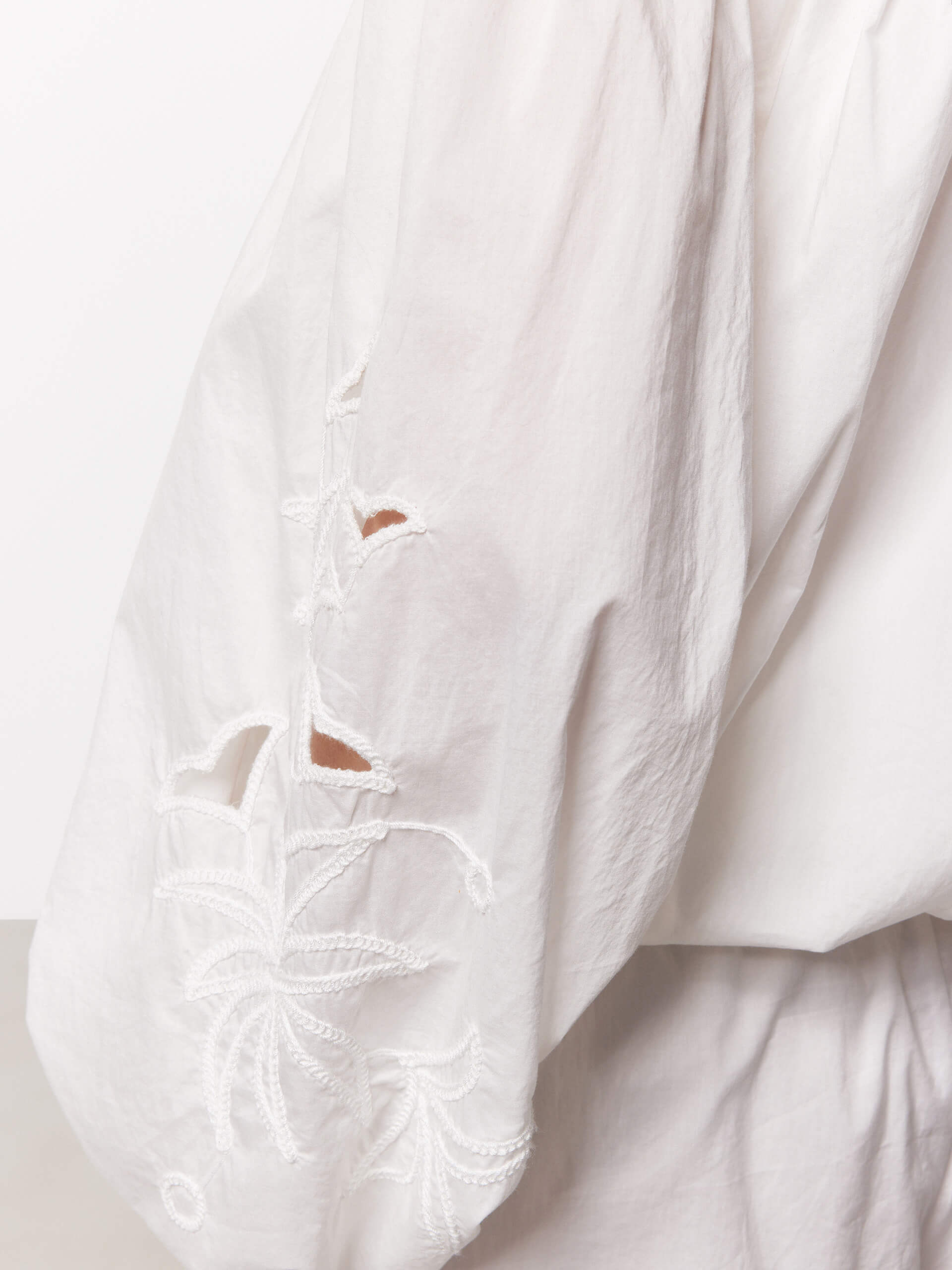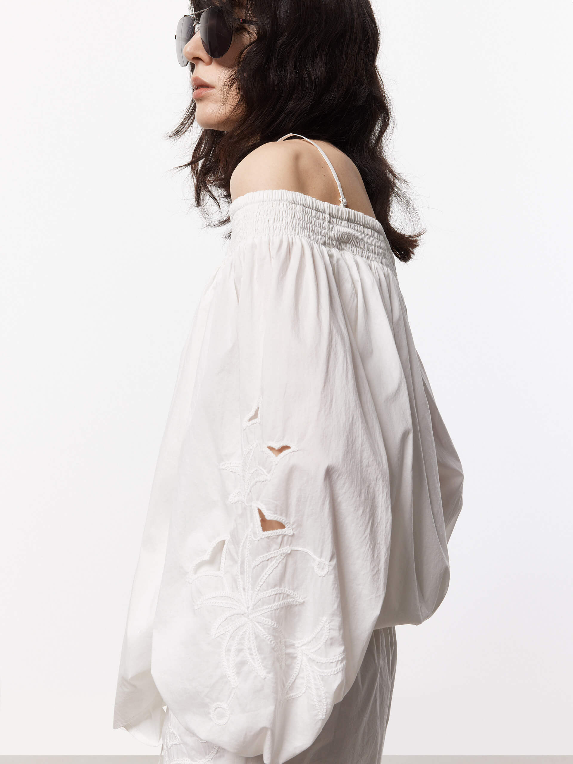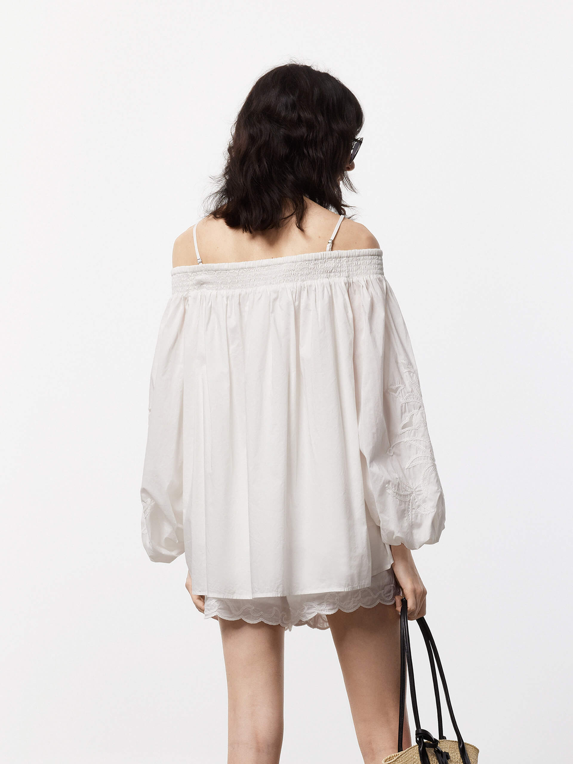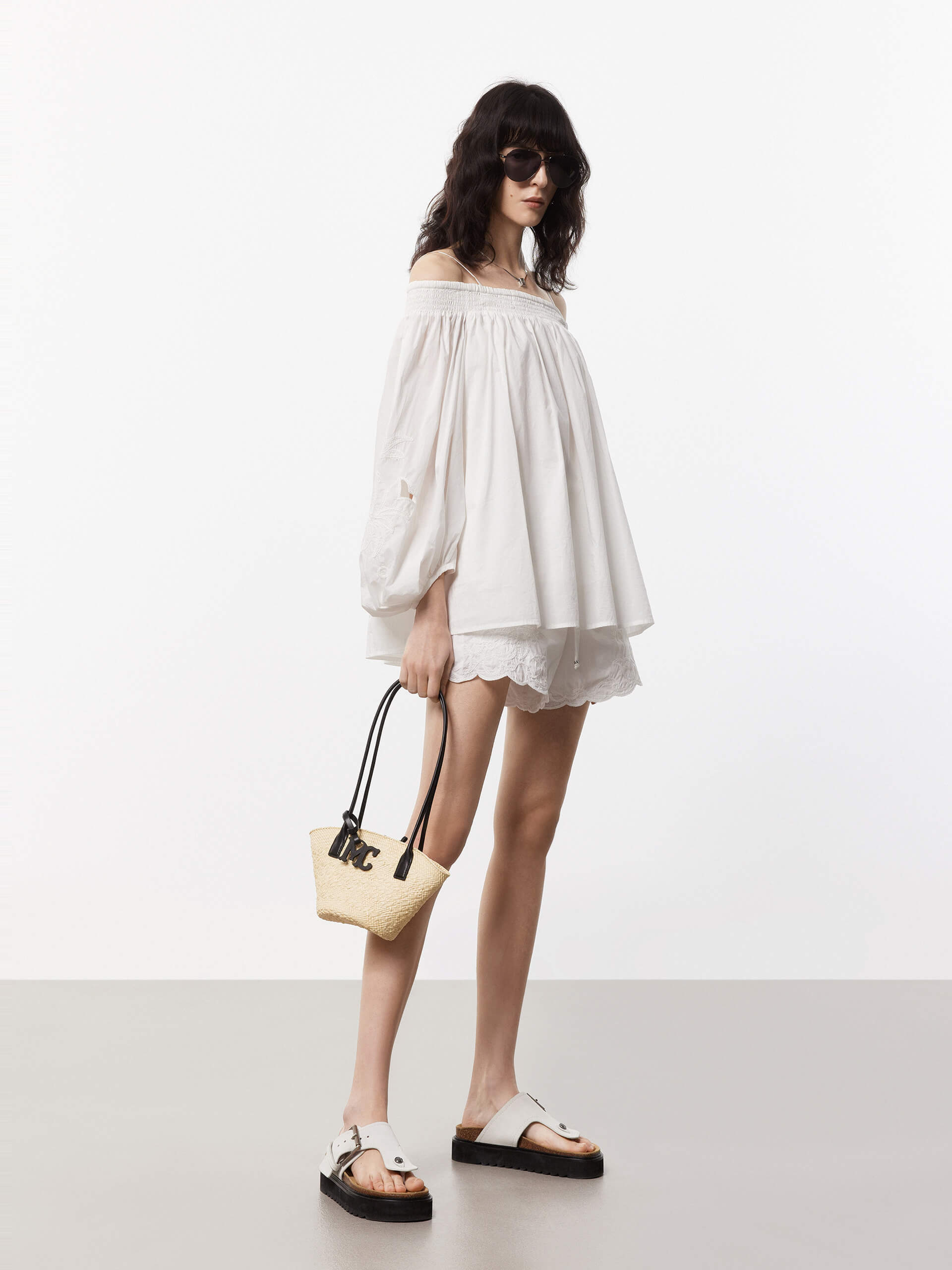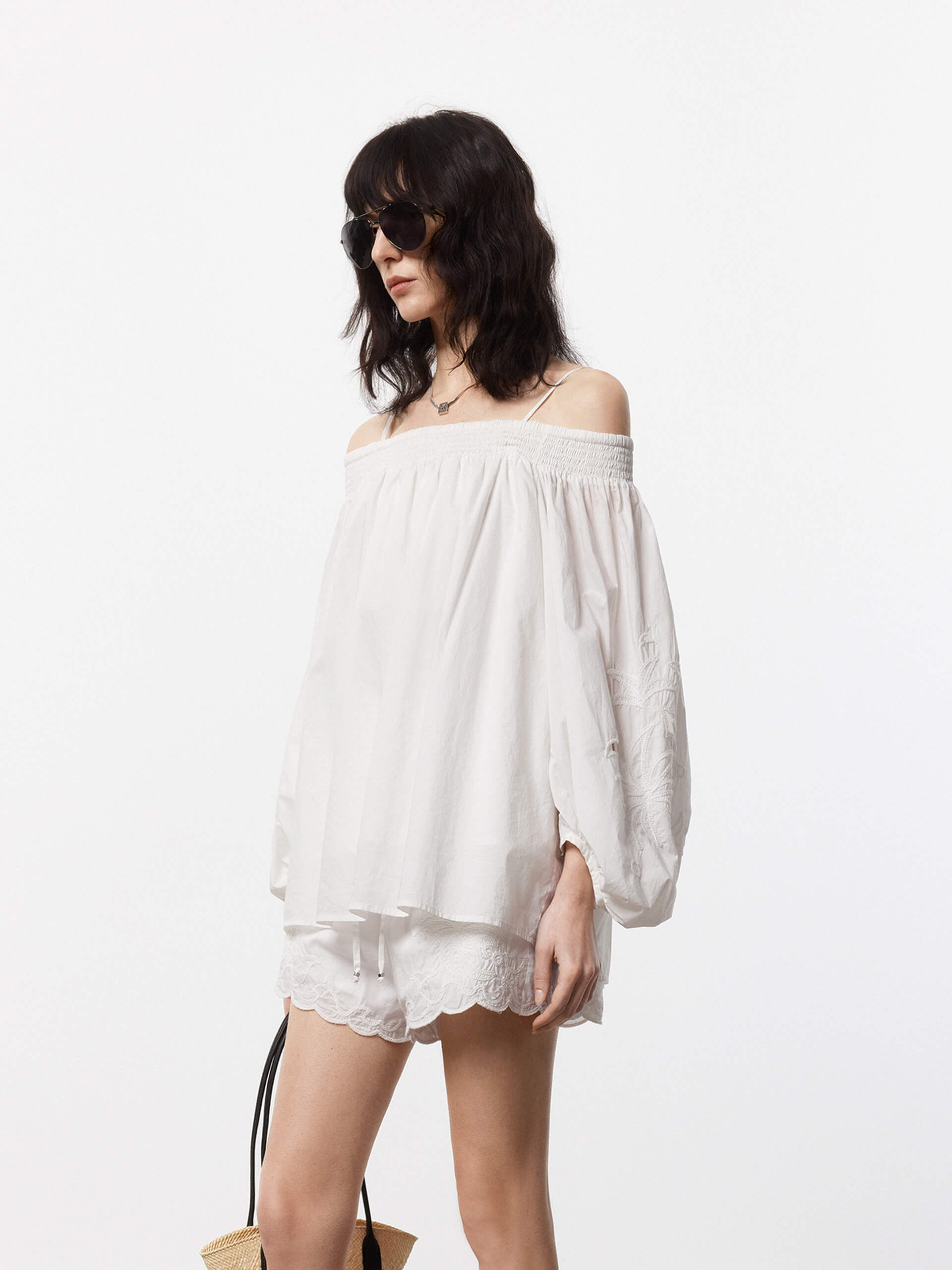 英式刺繡設計是我們夏季系列的核心。這款白色棉質上衣採用褶皺領口設計,可露肩穿著,搭配拉長的燈籠袖,增強了略微寬鬆的輪廓。搭配同款短褲,打造完整造型。