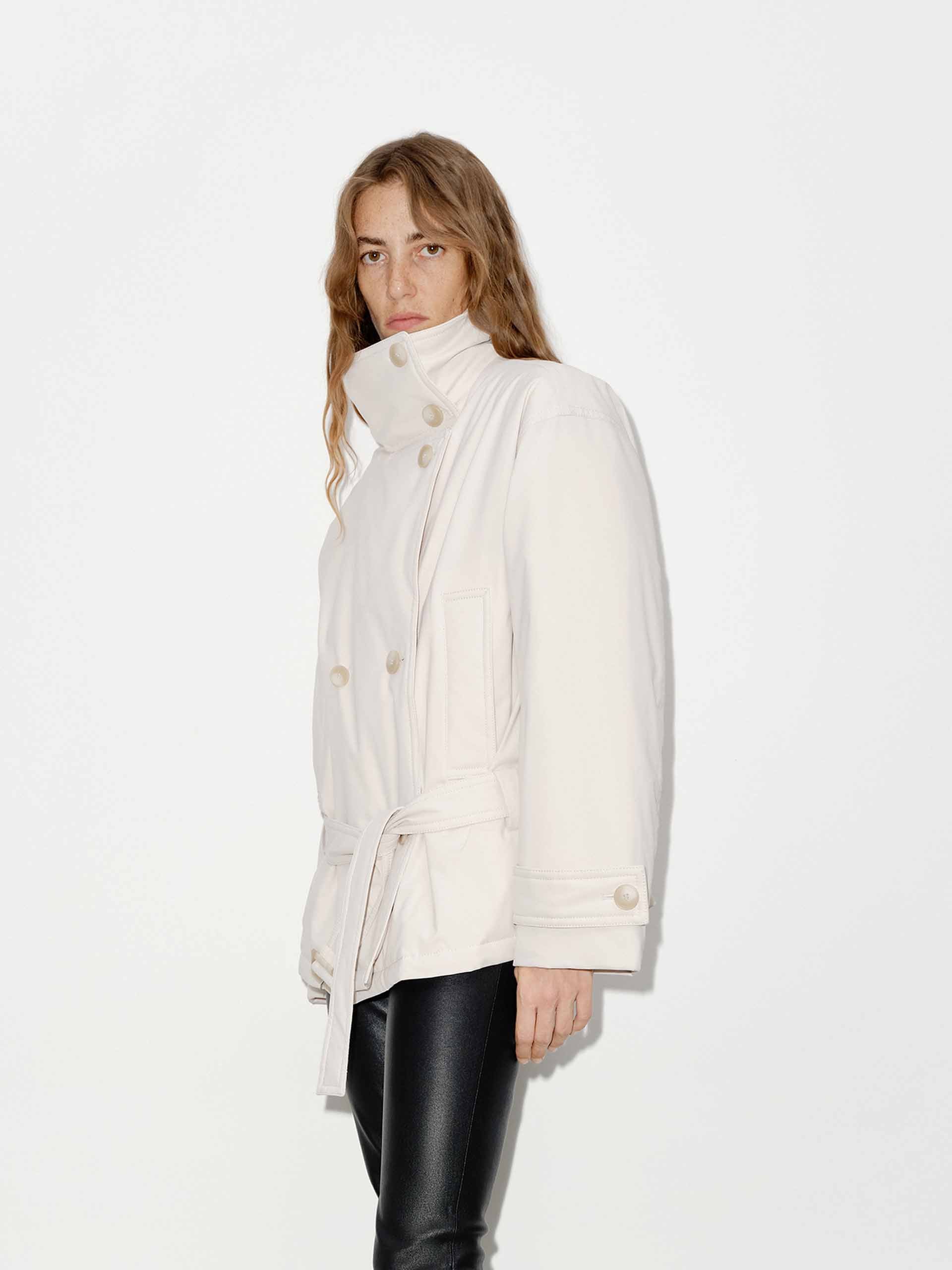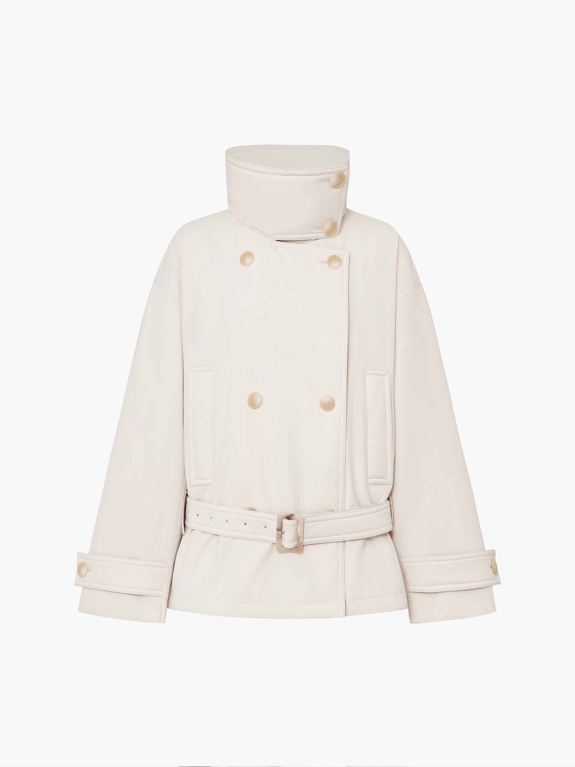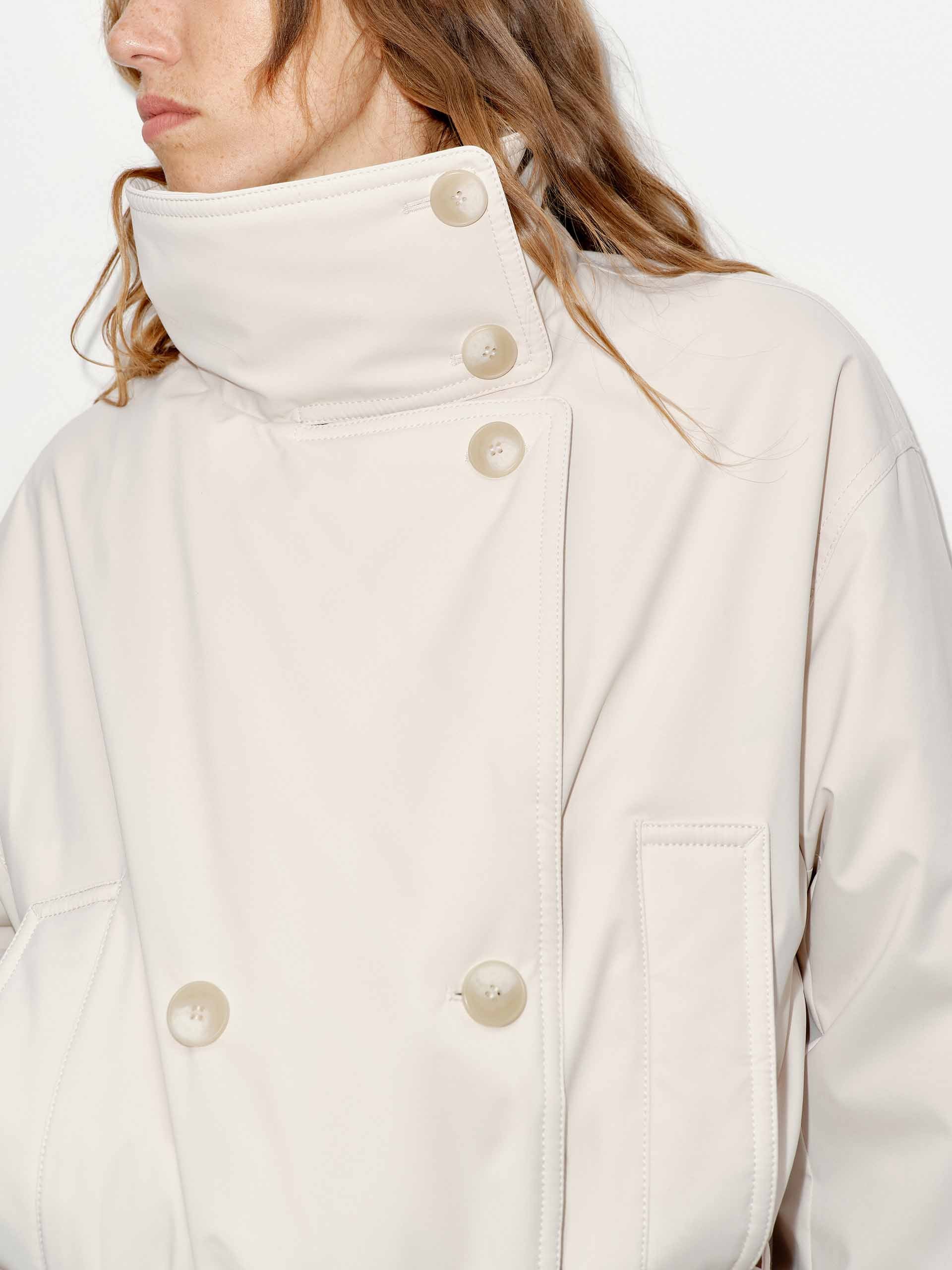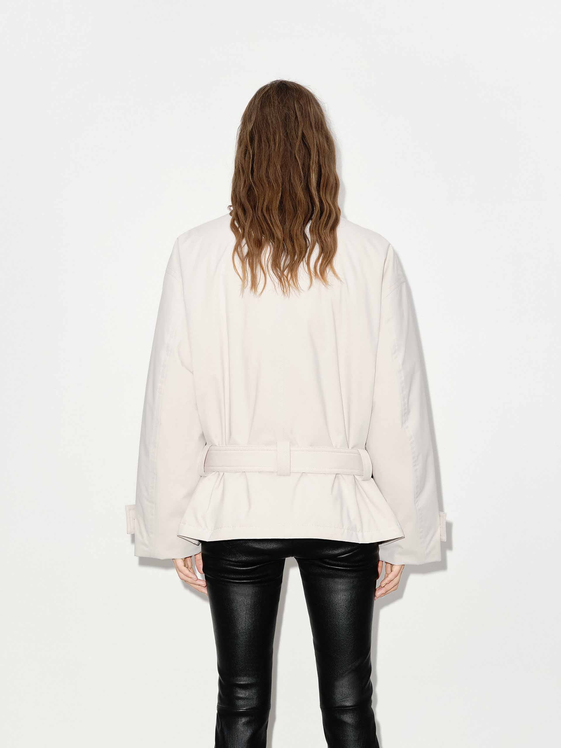 這款外套填充90%鴨絨,重量為71克,提供溫暖而不顯臃腫。寬鬆剪裁和中長款設計提供舒適與多功能性,漏斗領和側袋增添功能性。附帶的腰帶為這款冬季必備外套增添時尚感。